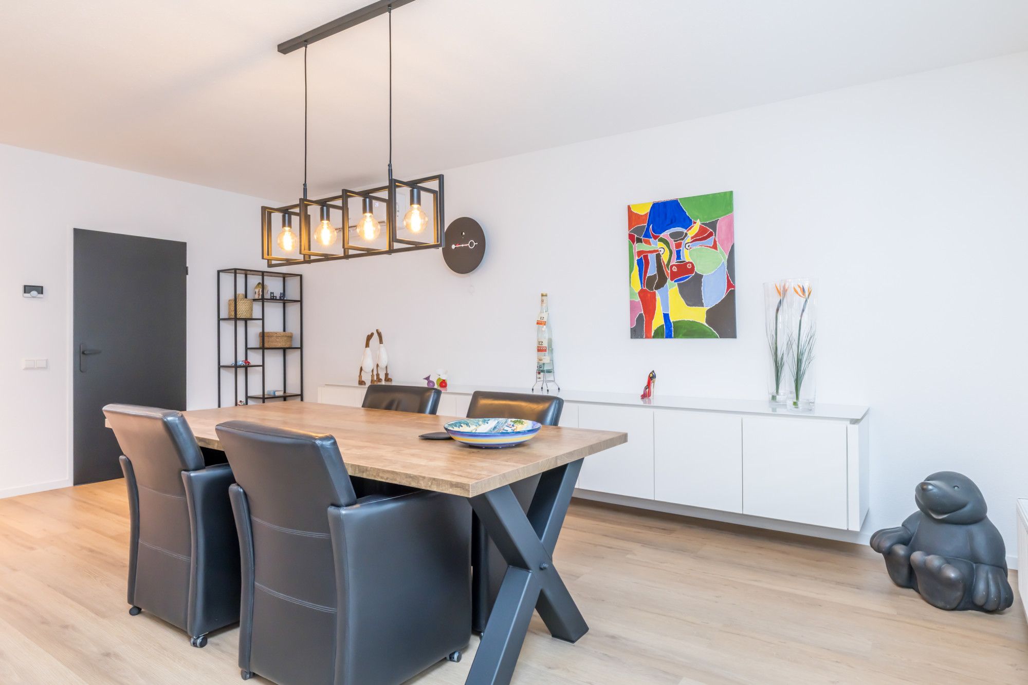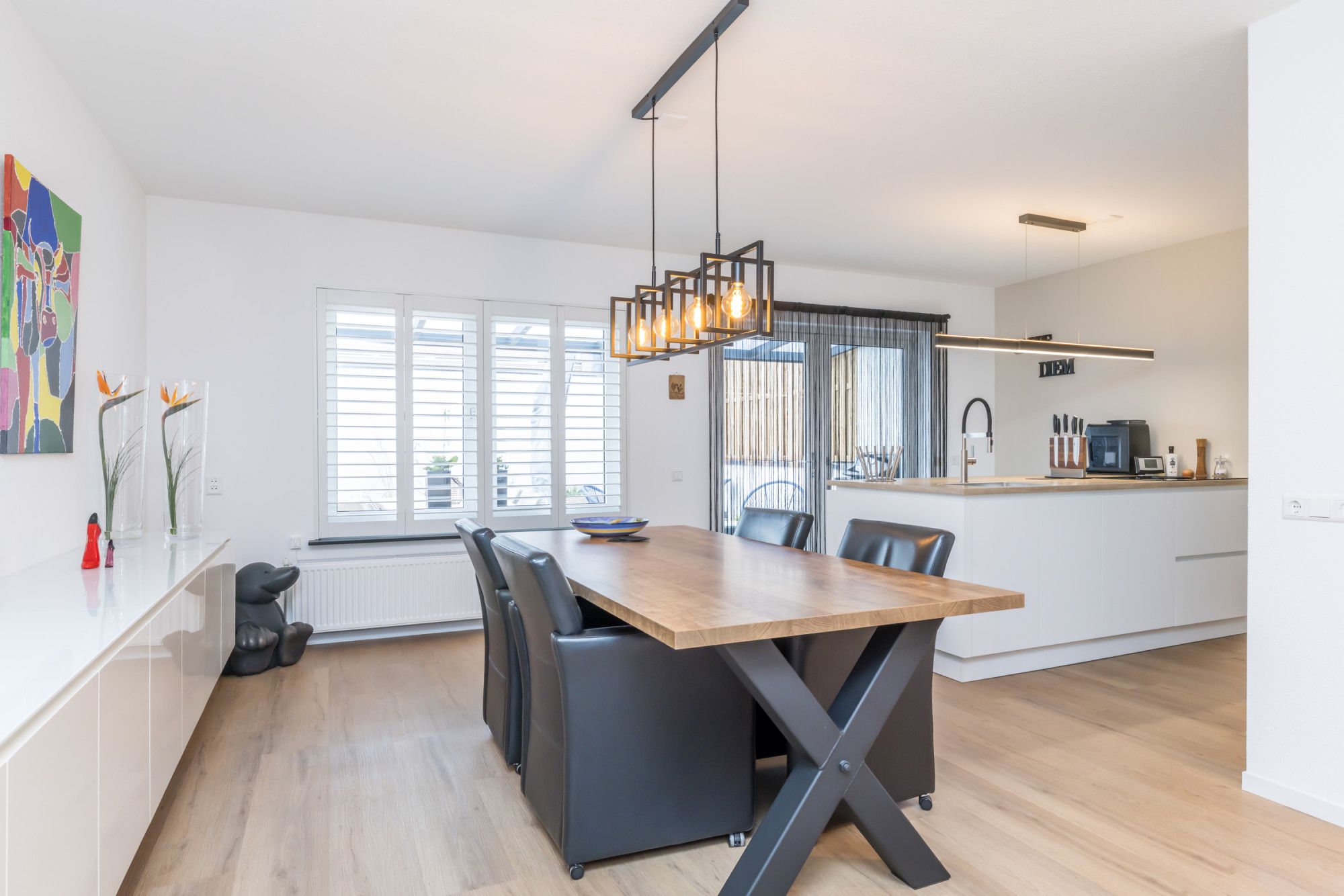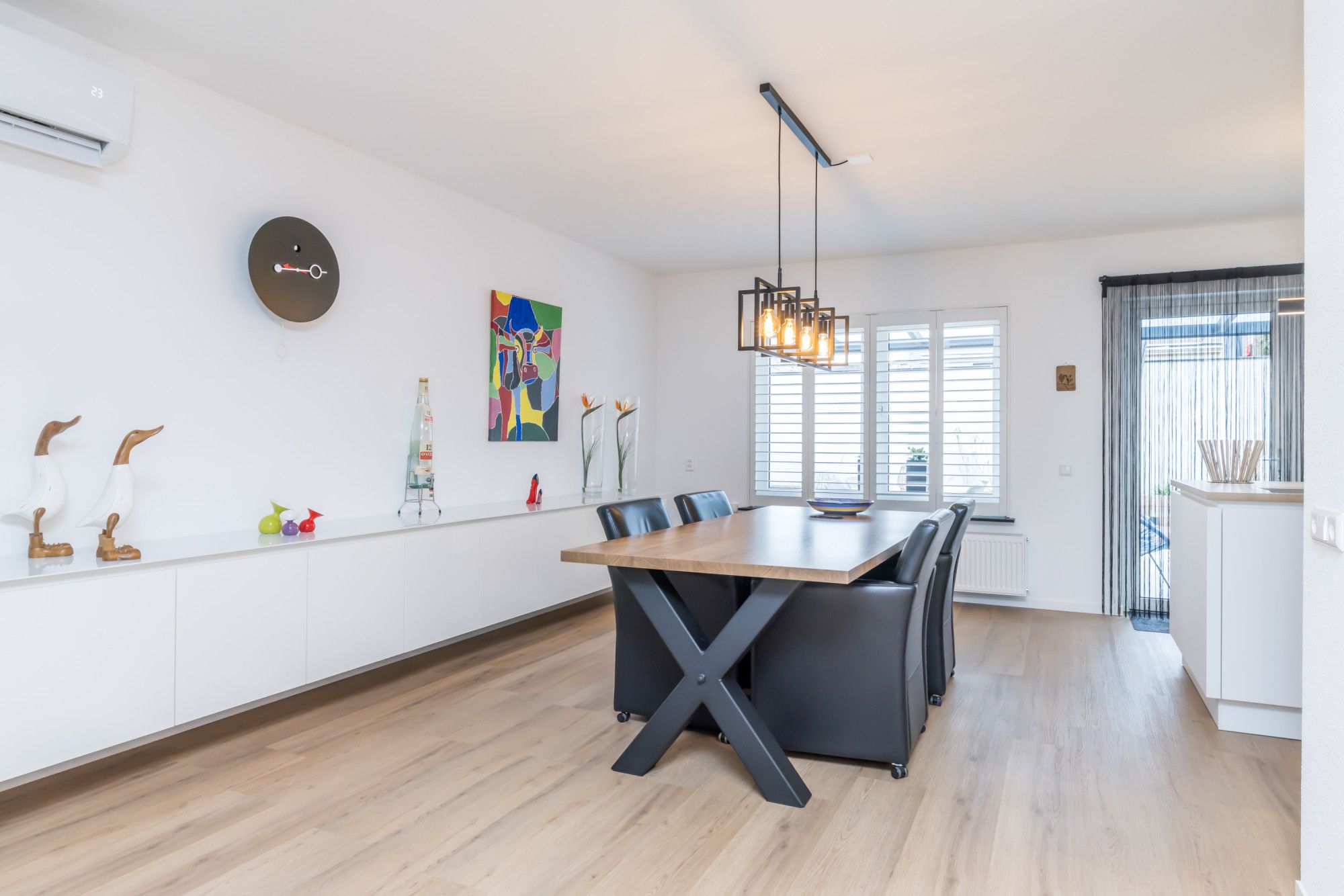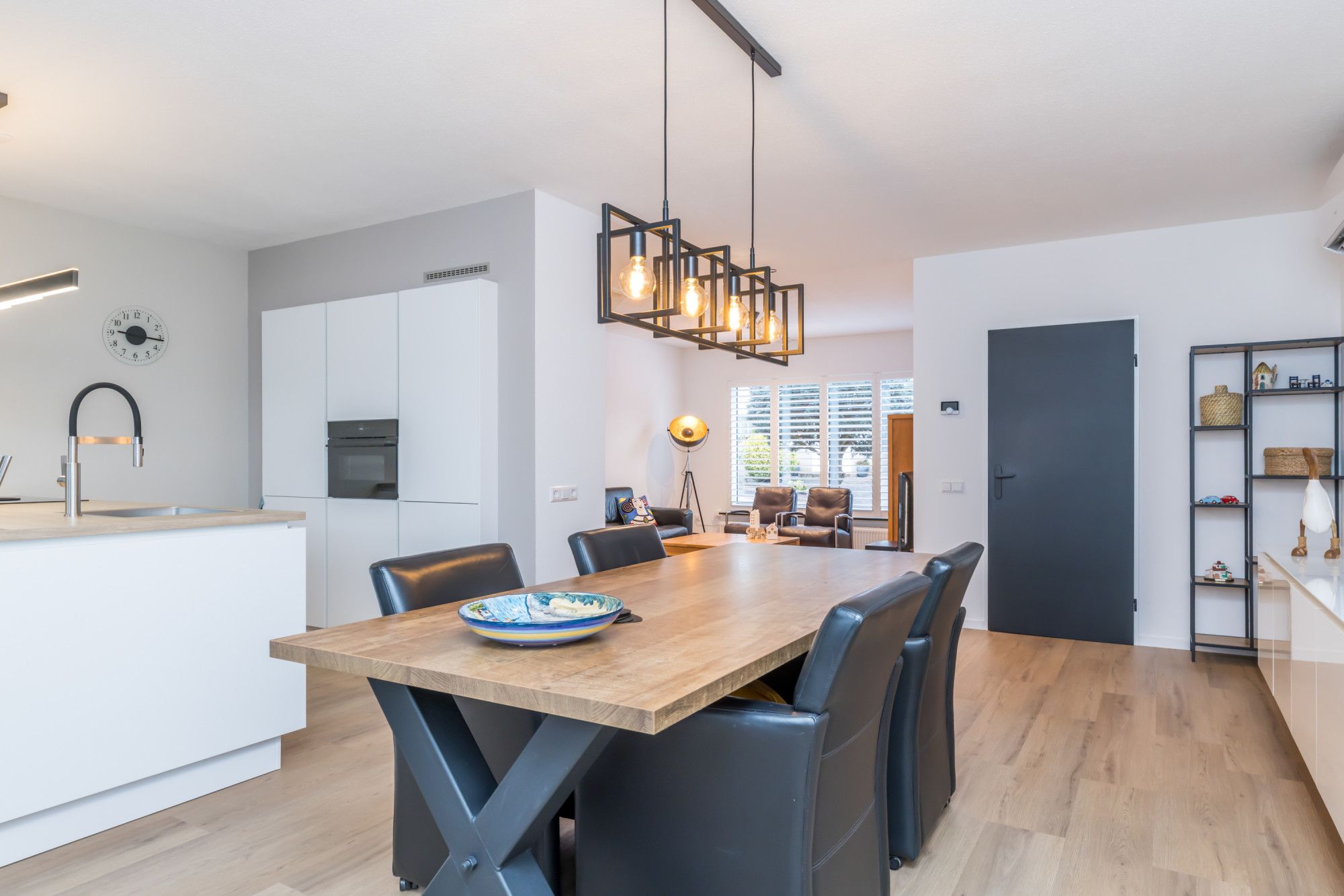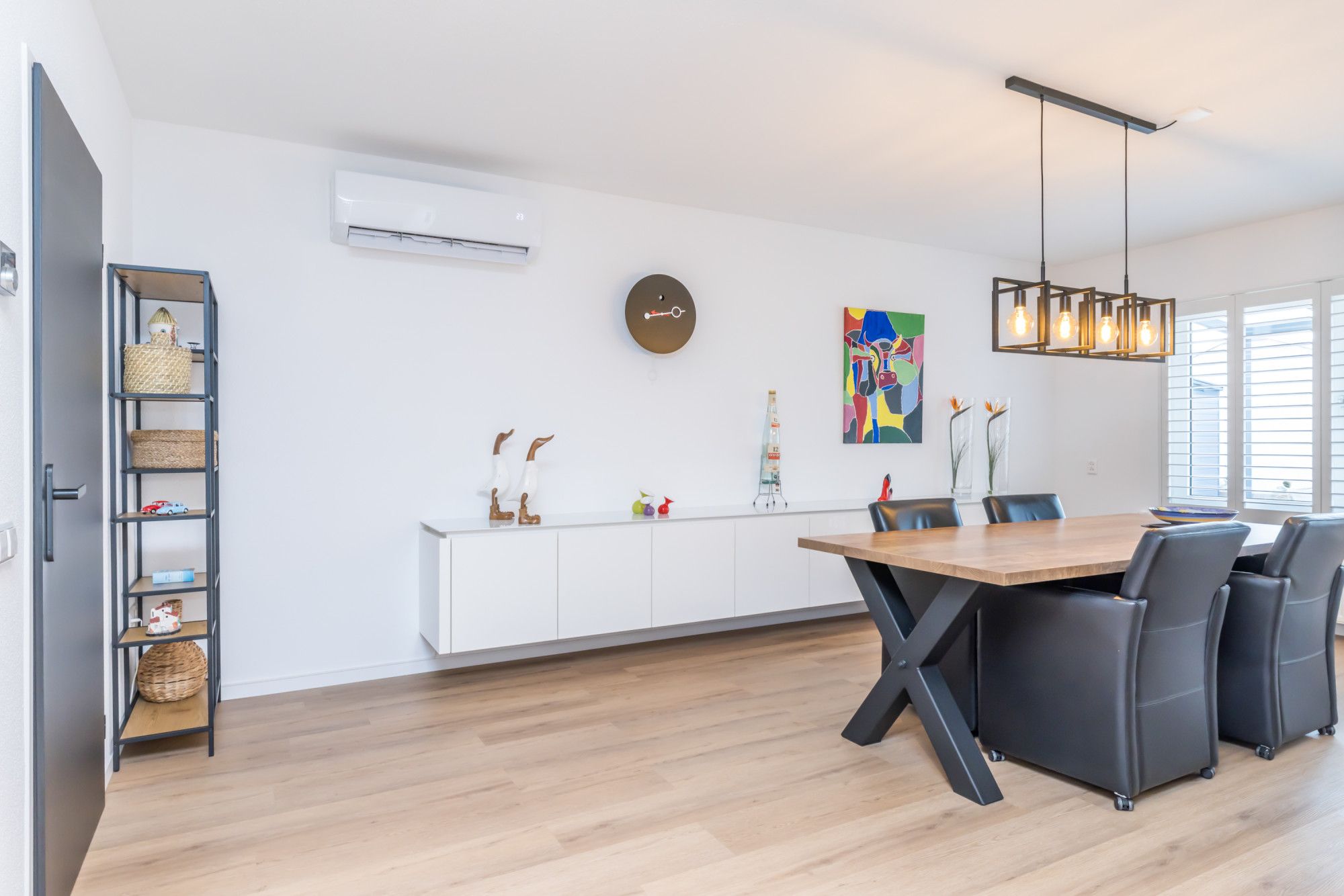 De achtergelegen eetkamer is voorzien van airconditioning en geniet dankzij de grote raampartij van een prachtige lichtinval. Deze ruimte vormt een natuurlijke verbinding met de halfopen keuken, waar een eigentijdse keukenopstelling met kookeiland en inbouwapparatuur is geplaatst. Via de loopdeur bereikt u direct het overdekte terras – perfect voor lange avonden buiten. De gehele begane grond is afgewerkt met een PVC-vloer in warm eiken design.