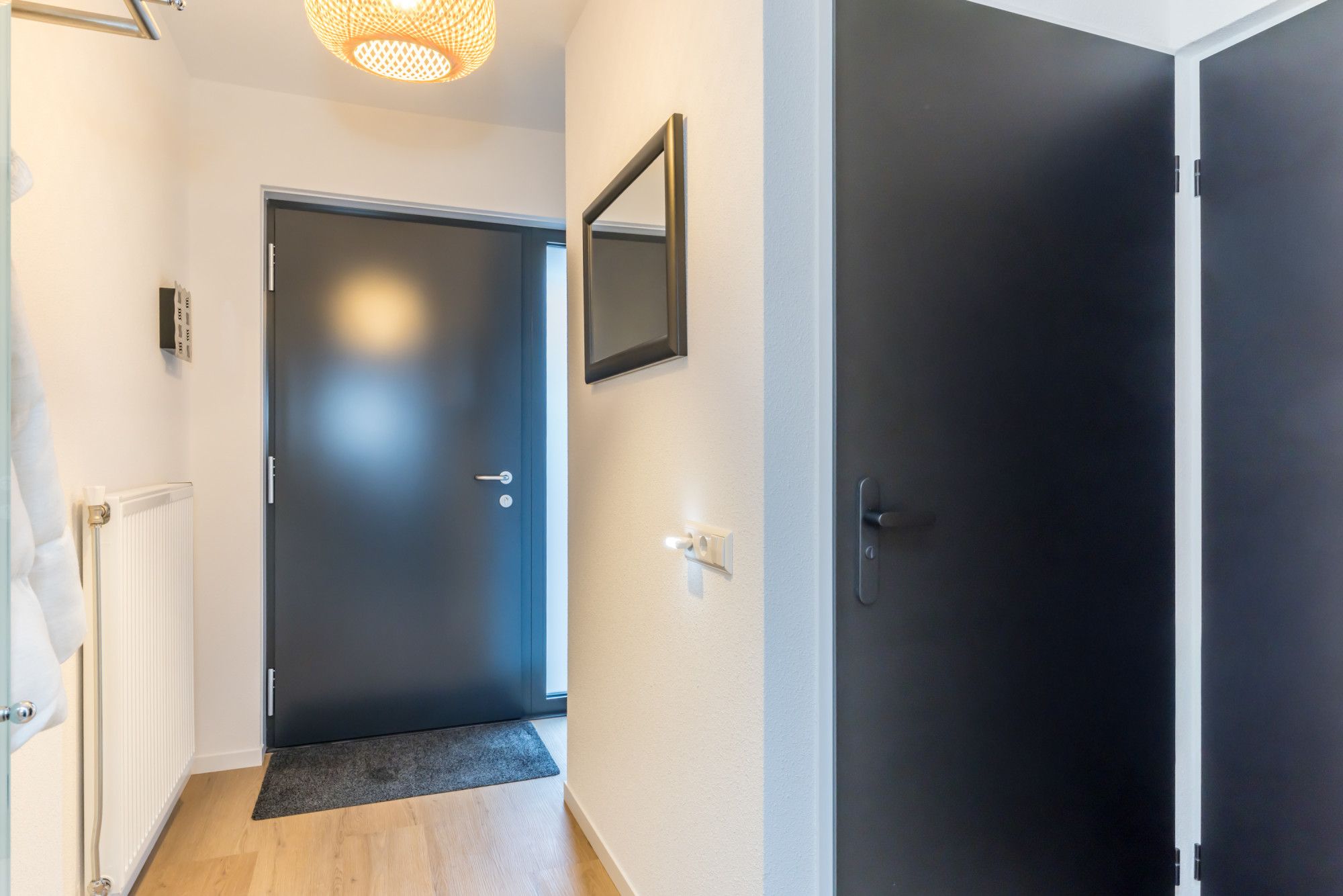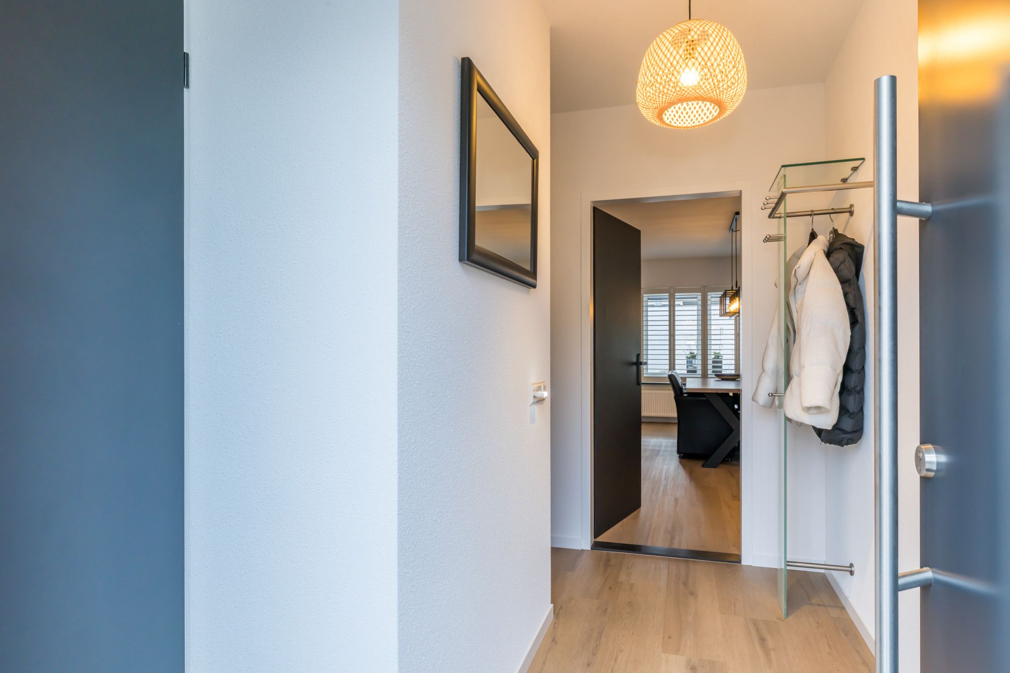 Entree / hal, met toegang tot de woonkamer, het toilet en de garage. Meterkast met 12 groepsinstallatie / 3x aardlekschakelaar / digitale meters met dag-/nachtstroom / glasvezelaansluiting en separate groep voor de zonnepanelen. Modern gastentoilet met zwevend wandcloset en fonteintje. Doorgang naar de garage en de woonkamer.