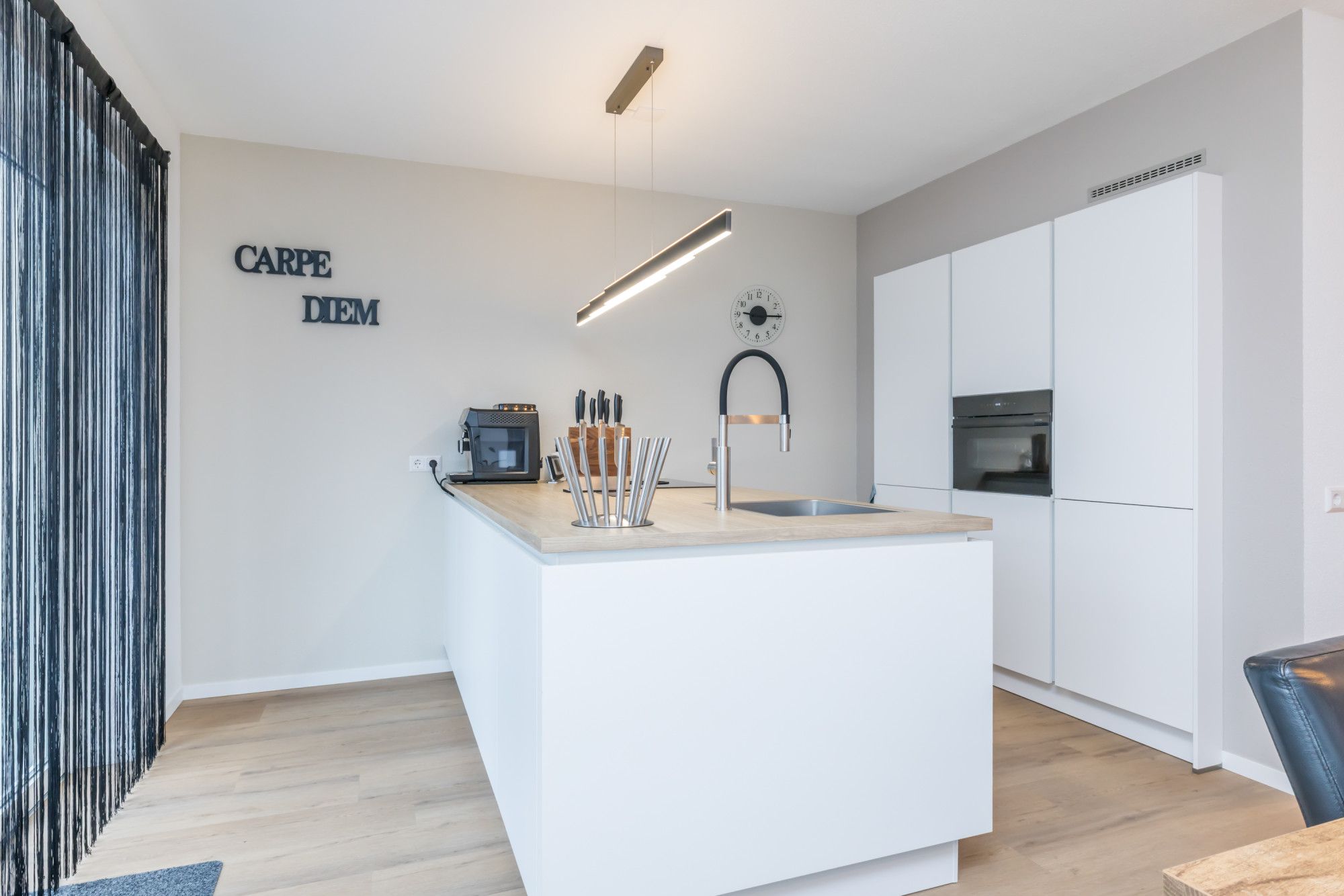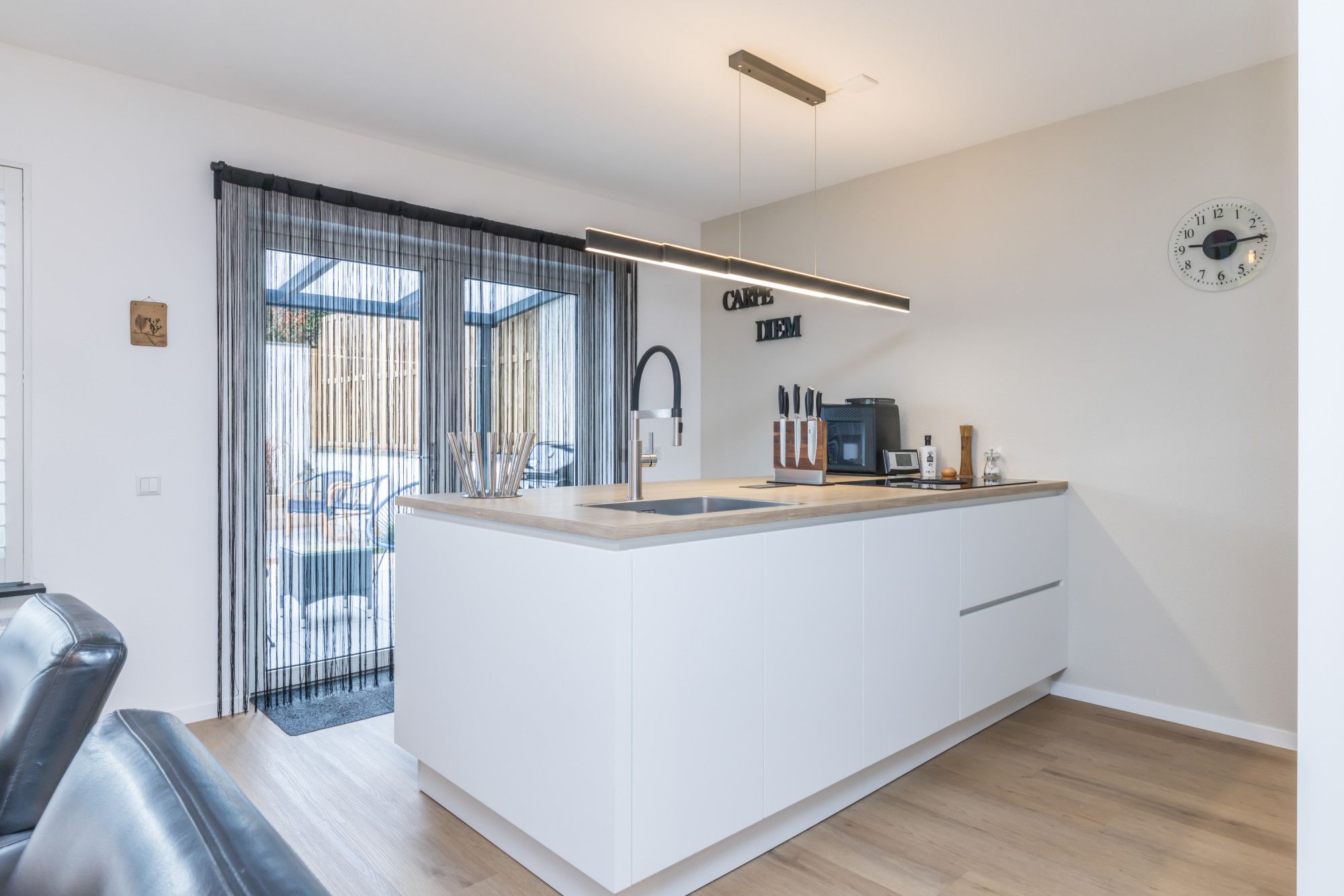 Halfopen keukenruimte aan de achterzijde, voorzien van een eigentijdse keukenopstelling, in greep-loos mat wit, met kookeiland, uitgerust met apparatuur, te weten: 4 zones inductie kookplaat / Bora kookveldafzuiging / elektrische oven / wasbak met close-in boiler / vaatwasmachine / koel-/vriescombinatie / vaatwasmachine en veel opbergruimte in de kastenwanden en lades met soft-close sluiting. Loopdeur naar het overdekte terras en de achtertuin.