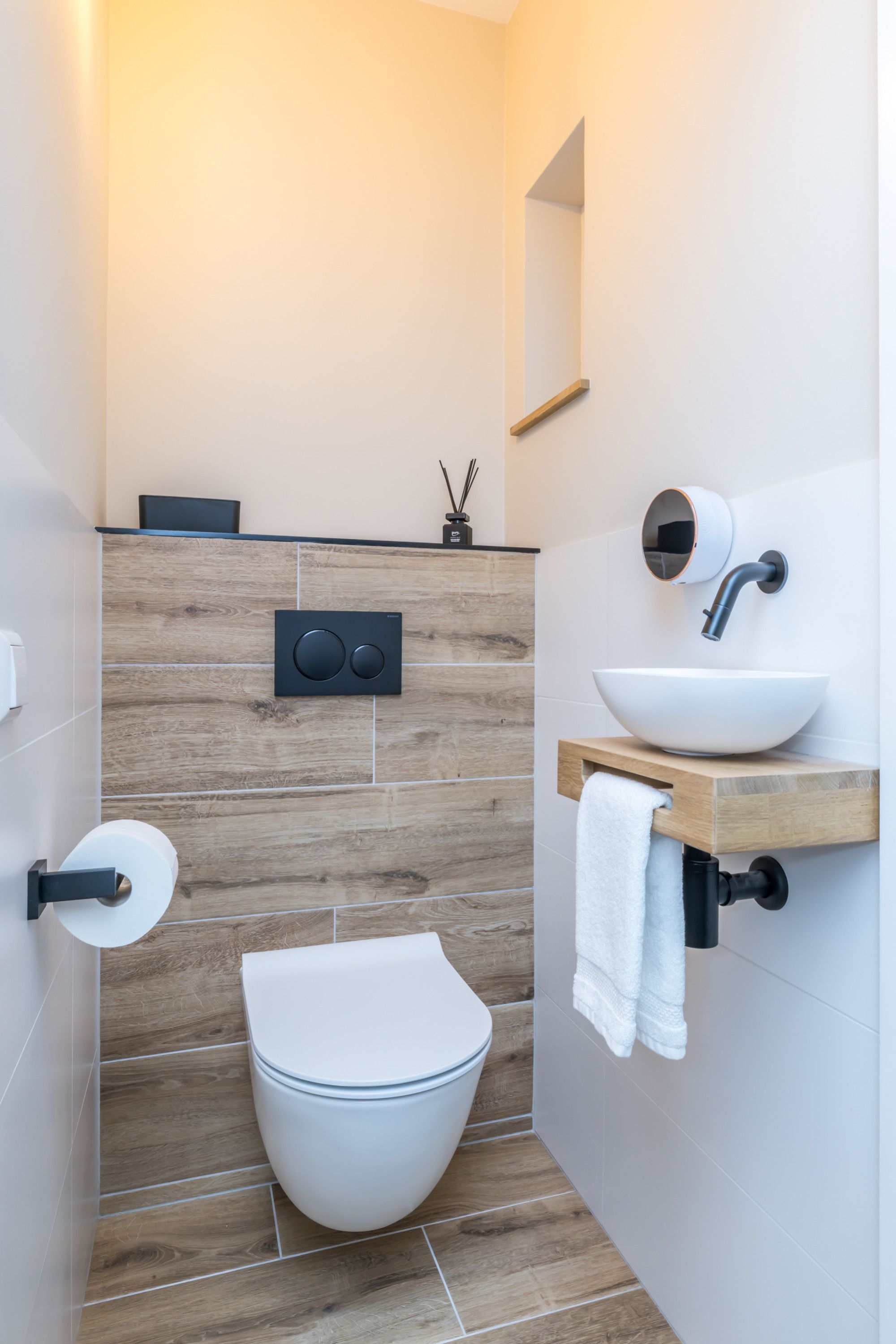Het moderne gastentoilet is uitgevoerd met een zwevend wandcloset en fonteintje.