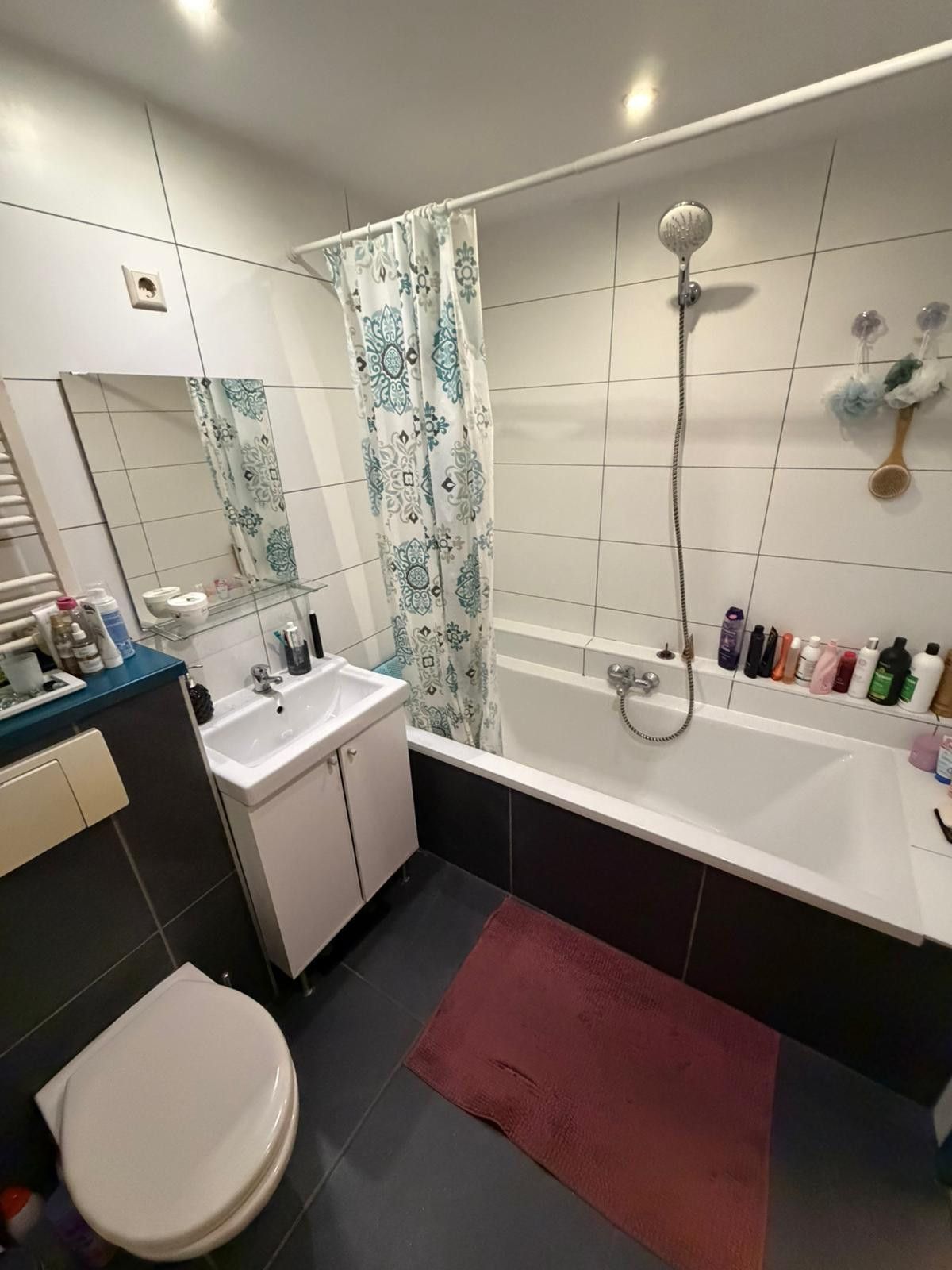 Badkamer (2.04m x 1.95 m) met ligbad, vaste wastafel, tweede toilet en sierradiator.