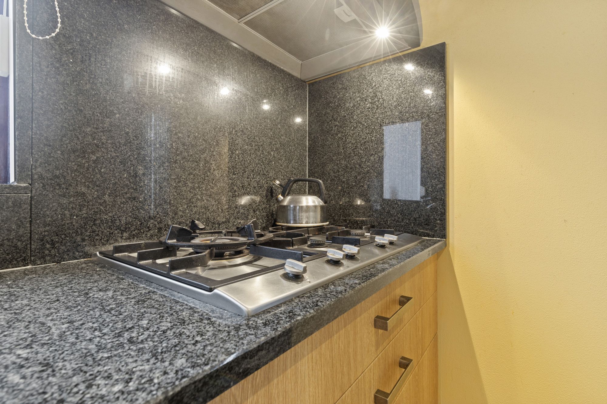 De gesloten leefkeuken is voorzien van een tegelvloer, veel kastruimte en diverse inbouwapparatuur, waaronder een 5-pits gaskomfoor, afzuigkap, combimagnetron, vaatwasser en koelkast. Een deur geeft direct toegang tot de tuin, waardoor binnen en buiten naadloos in elkaar overgaan.