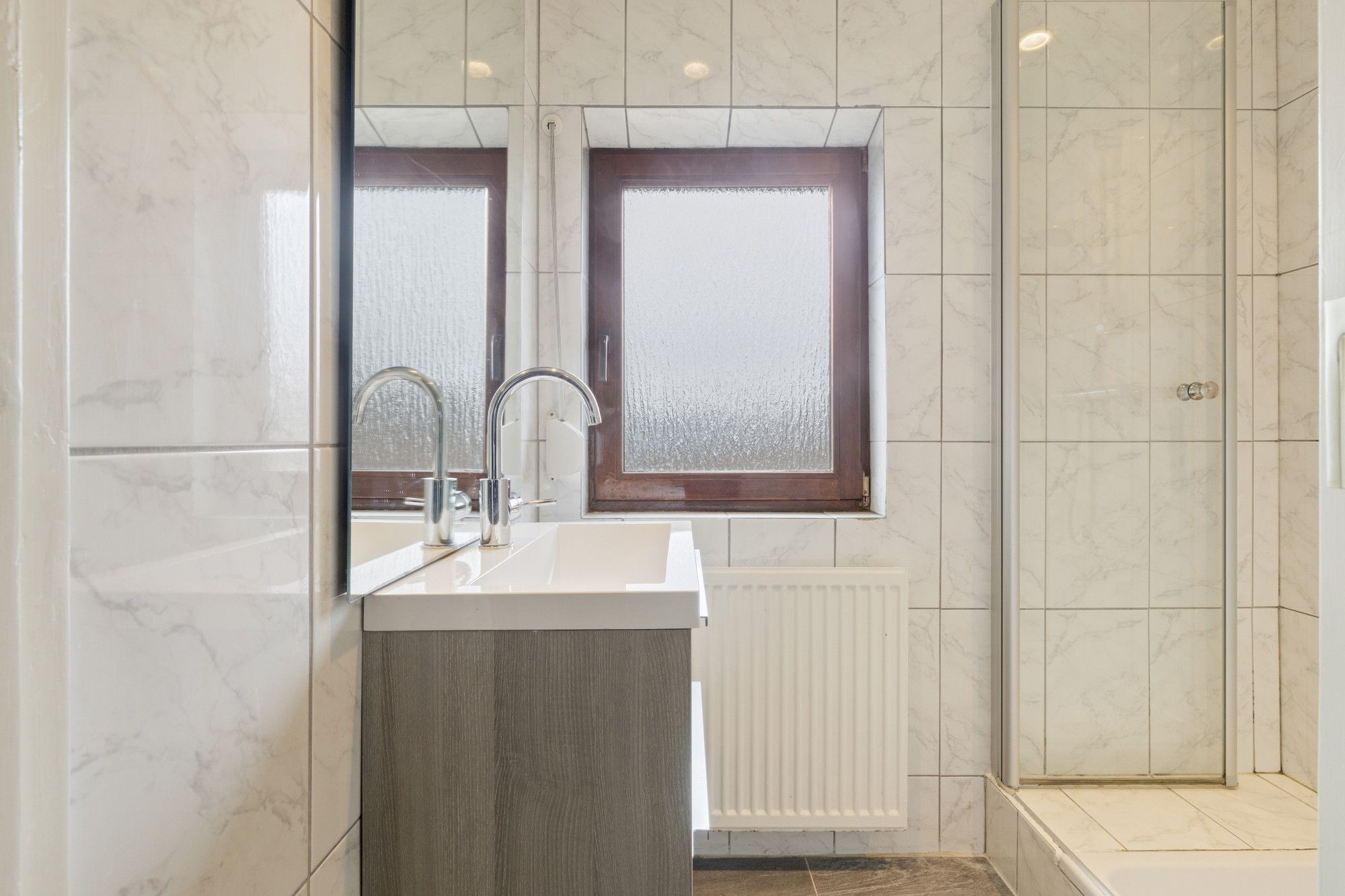 Overloop met toegang tot drie slaapkamers, allen voorzien van vloerbedekking. De compacte maar functionele badkamer beschikt over een douchecabine en een wastafel.