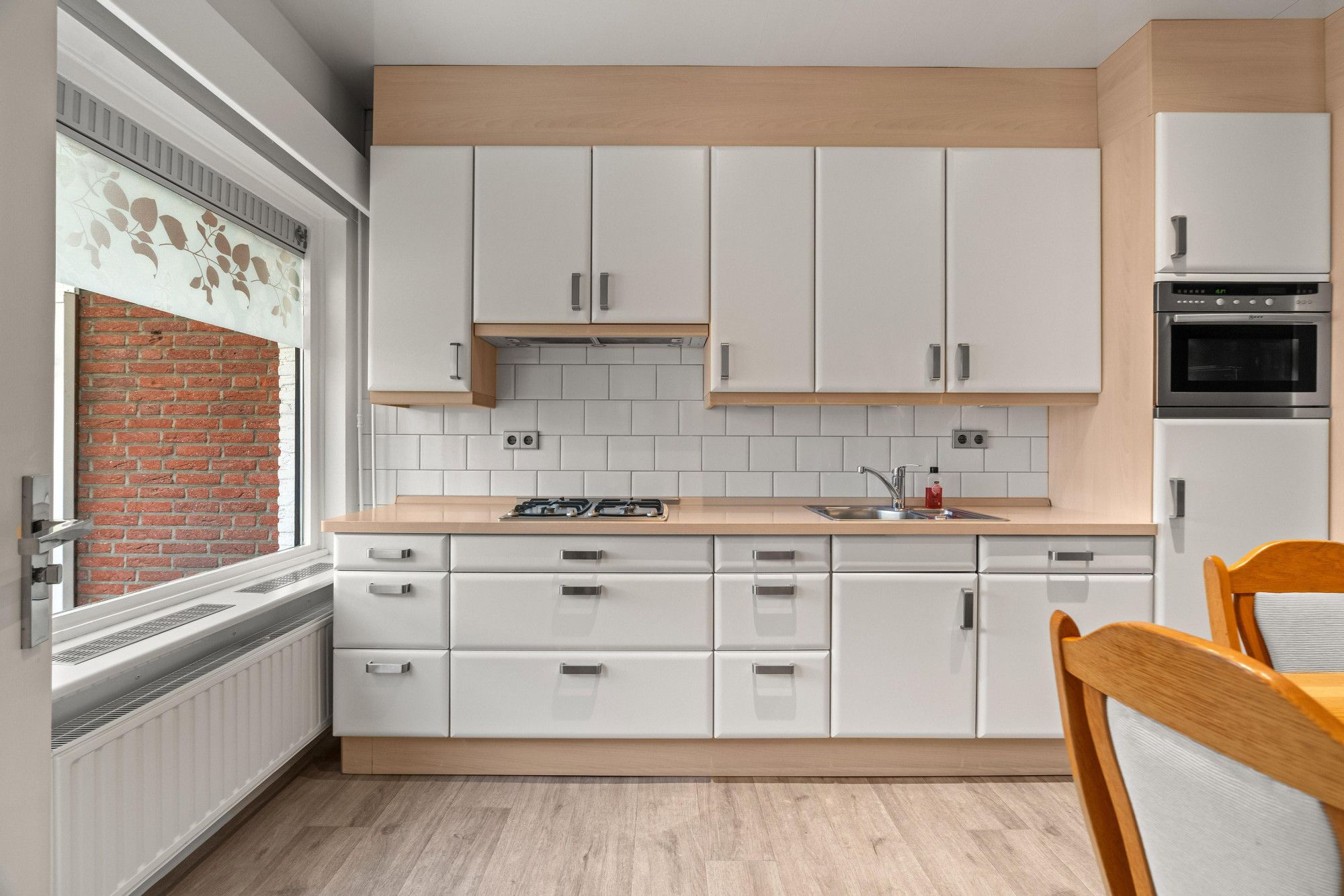Open keuken (3.46 x 2.35) (aanbouw) met aanbouwkeuken inclusief apparatuur w.o : gasfornuis, afzuigkap en koelkast, deur naar terras.