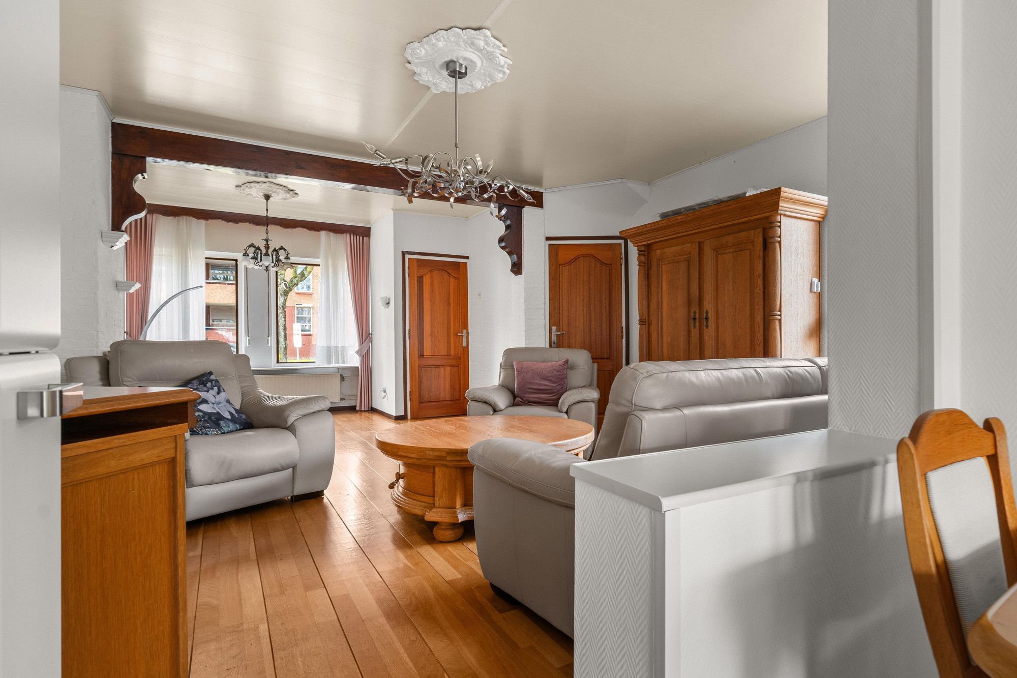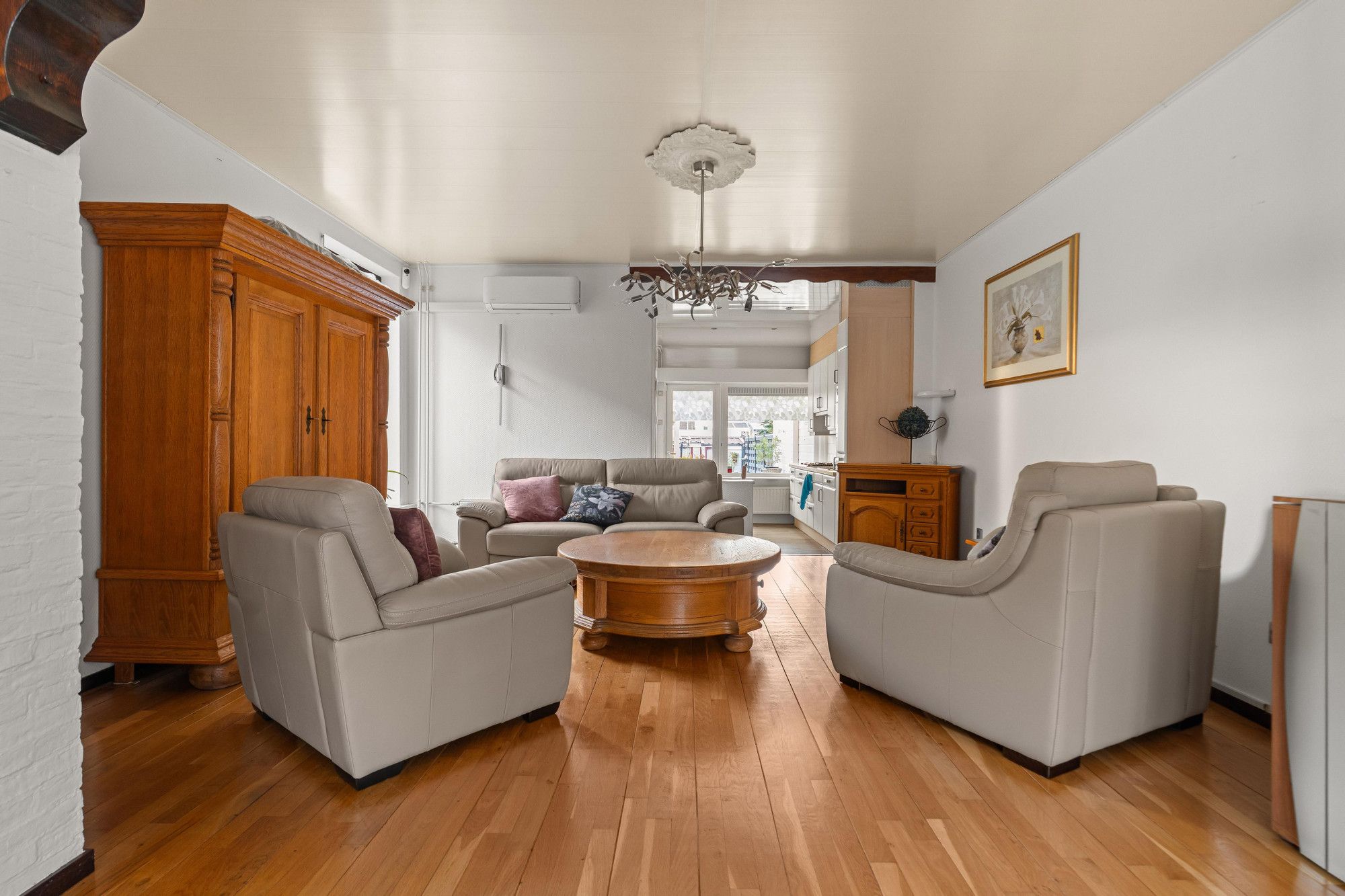 Woonkamer(6.11mx4.16m) met parketvloer en airco.