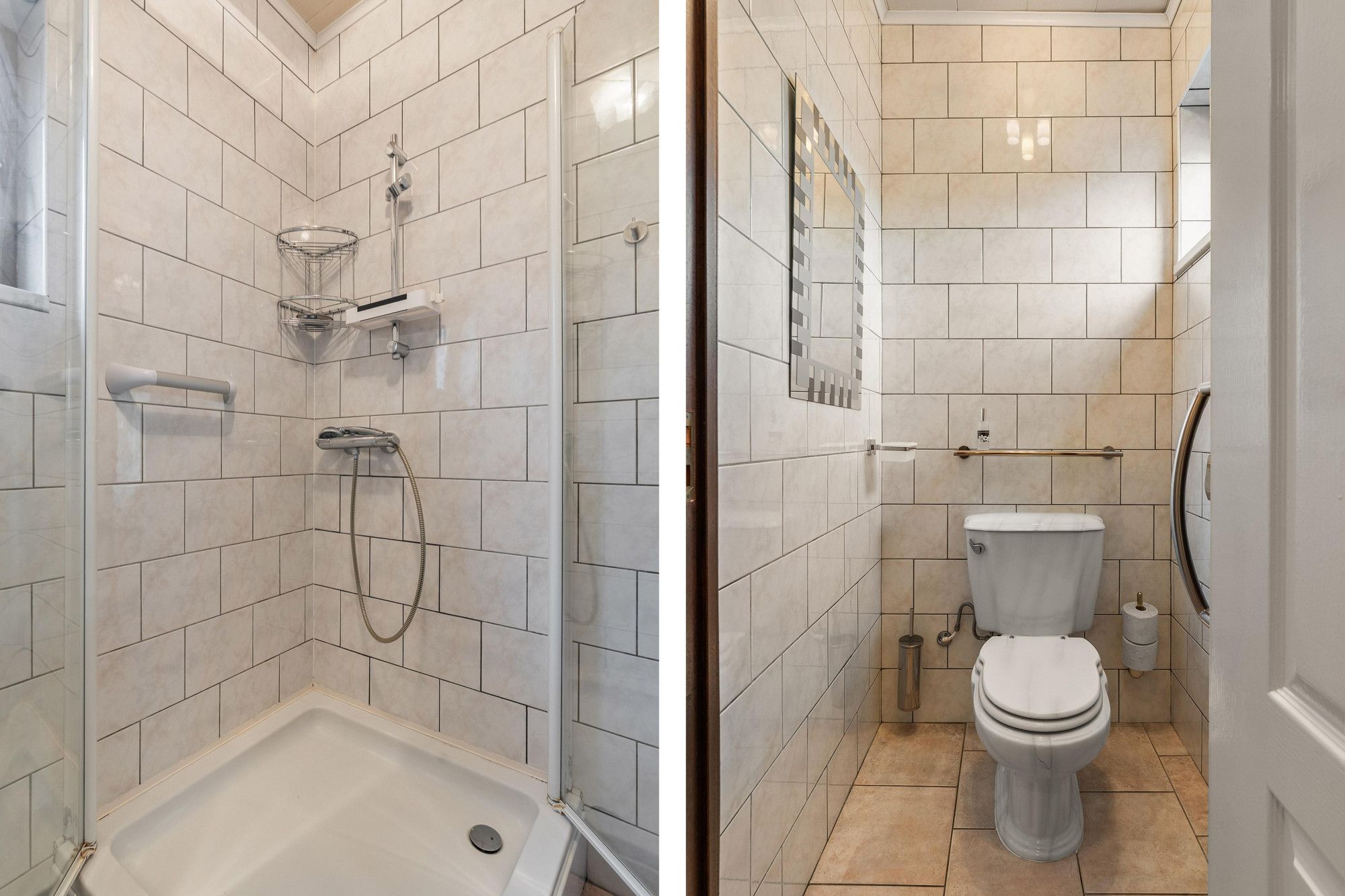 Volledig betegelde badkamer(2.87mx1.85mx1.09m) met douche, badmeubel, opstelplaats c.v. - ketel (eigendom).