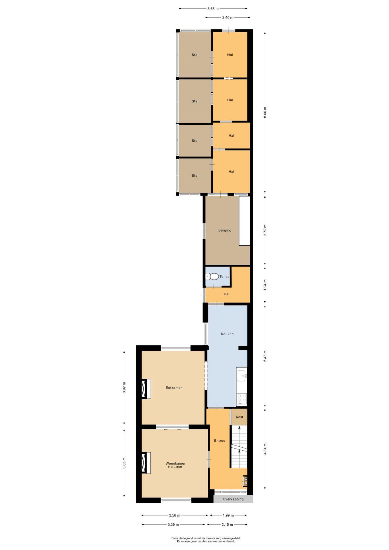Alle door ons kantoor verstrekte informatie omtrent onroerende zaken, moet beschouwd worden als een uitnodiging om in onderhandeling te treden, en is geheel vrijblijvend! Alle vermelde maten en afmetingen zijn slechts bij benadering. Aan deze beperkte info kunnen geen rechten worden ontleend. Indien in enige documentatie of op enige website informatie staat die niet overeen komt met de werkelijkheid, dan geldt de feitelijke situatie waarin de woning zich bevindt, zoals koper deze tijdens de bezichtiging heeft kunnen waarnemen, en wordt de woning in deze feitelijke situatie/staat verkocht. Een (eventueel) bijgevoegde plattegrond dient uitsluitend als globale indicatie/visualisatie. Hieraan kunnen uitdrukkelijk geen rechten worden ontleend.