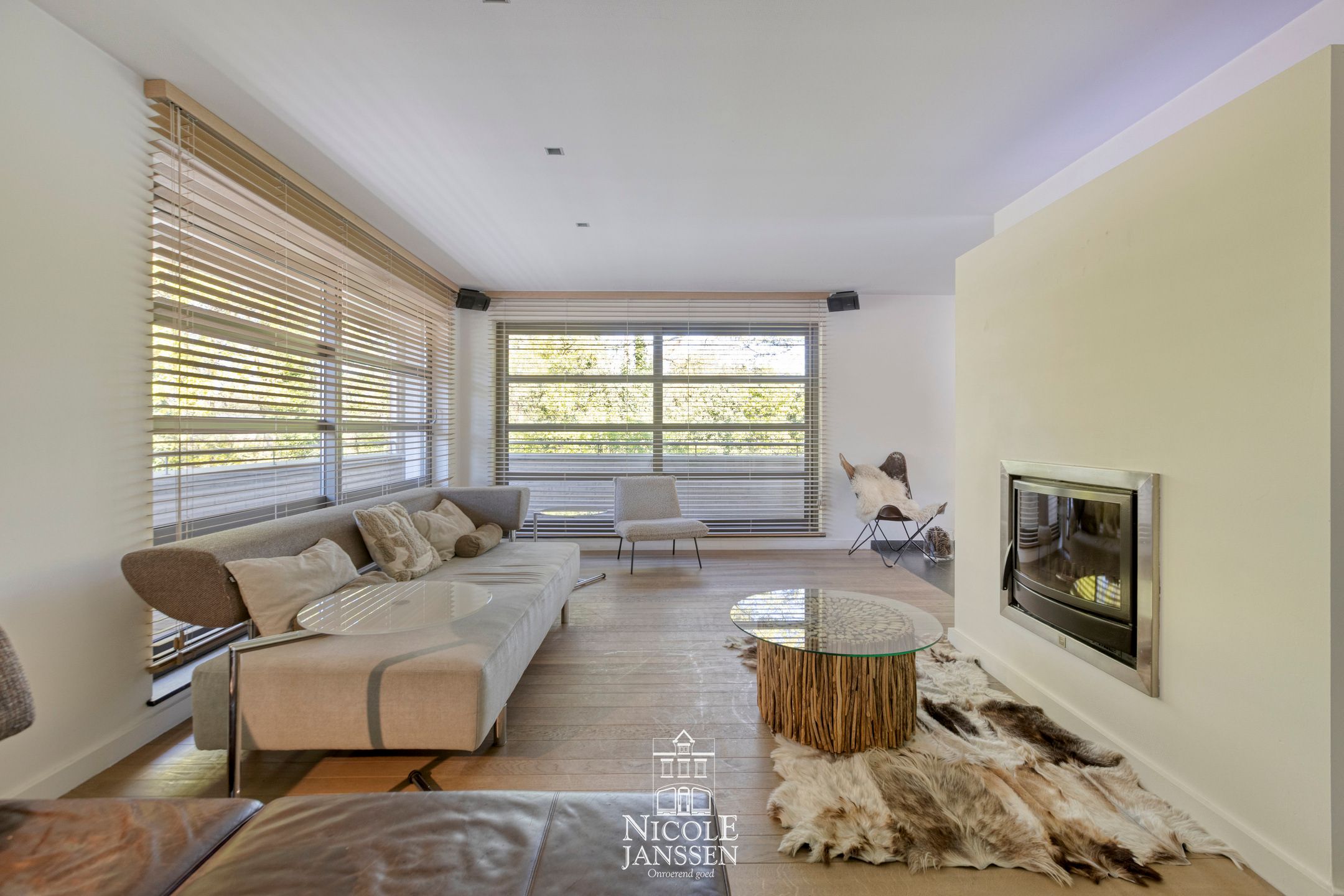 - Toegang via de glazen deur naar de open leefruimte met een gezellige zithoek voorzien van parketvloer en inbouwhouthaard