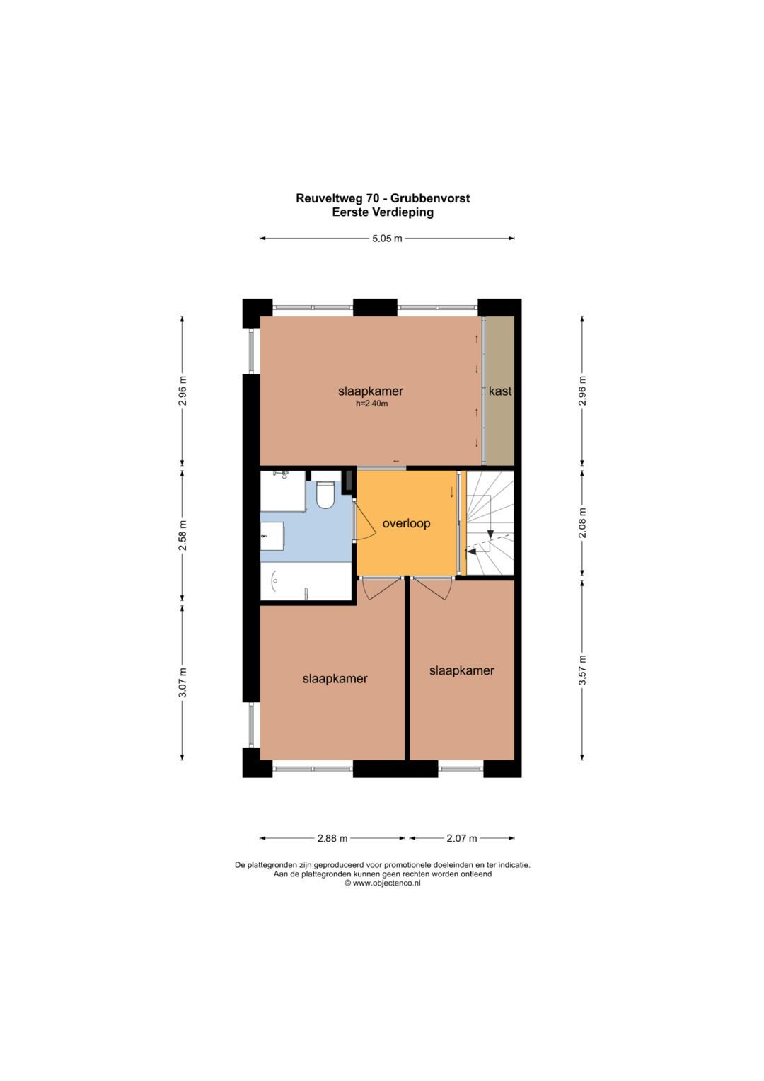 De ruime overloop geeft toegang tot 3 slaapkamers, de badkamer en de vaste trapopgang naar de 2e verdieping. De slaapkamers zijn ca. 7.5m², 9m² en 15m² groot. De masterbedroom heeft de beschikking over een ruime inbouwkast. De badkamer is geheel betegeld en voorzien van een ligbad met douchefaciliteit, inloopdouche, zwevend toilet, wastafel met meubel, designradiator en mechanische ventilatie.