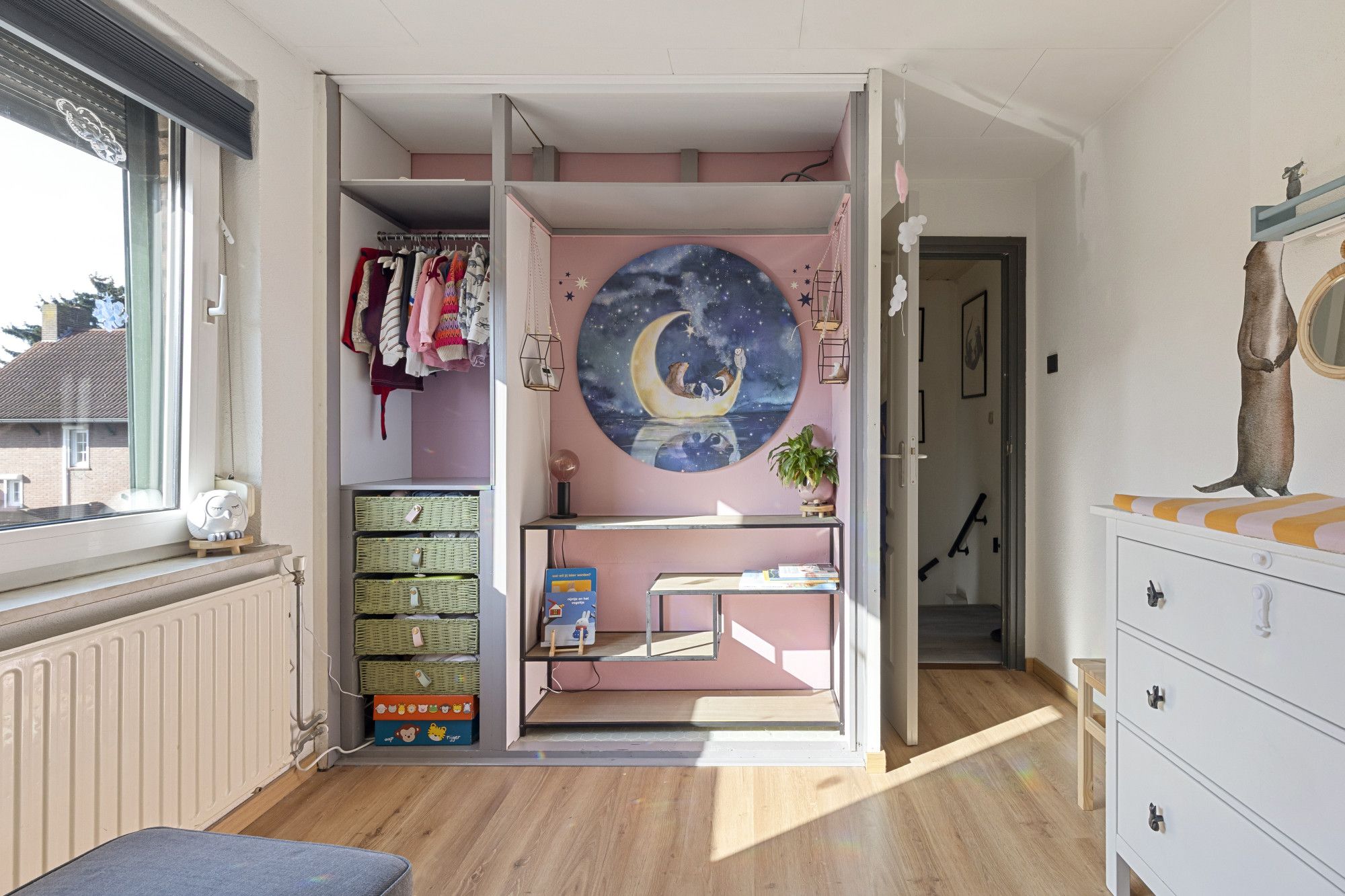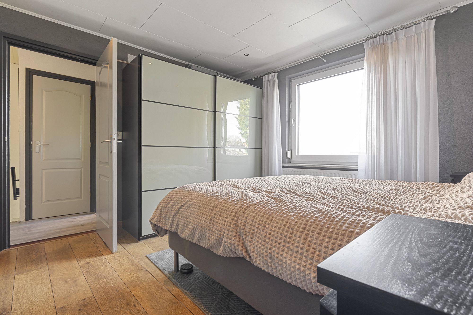 Overloop met bergkast en drie slaapkamers met laminaatvloeren, respectievelijk: