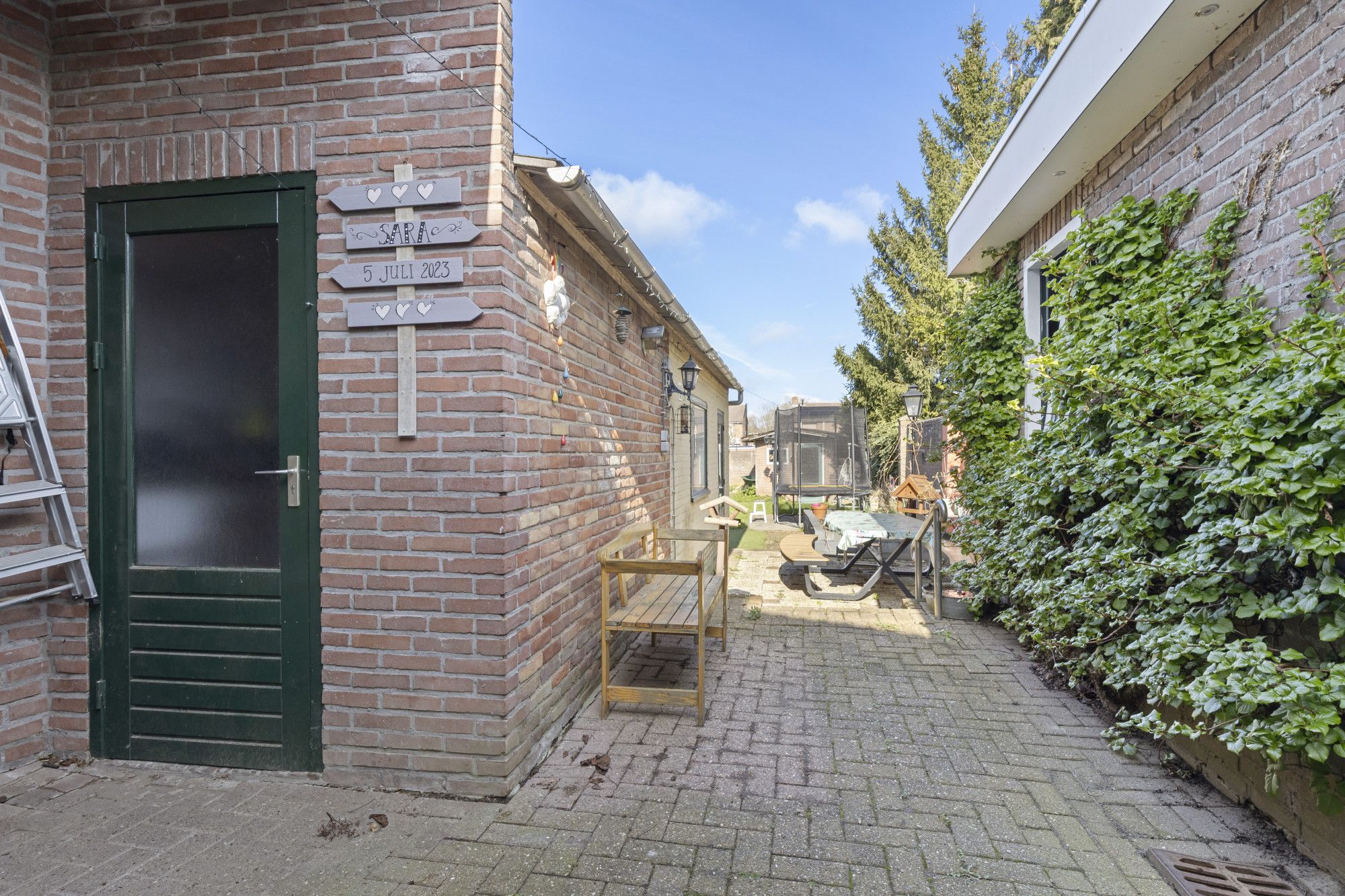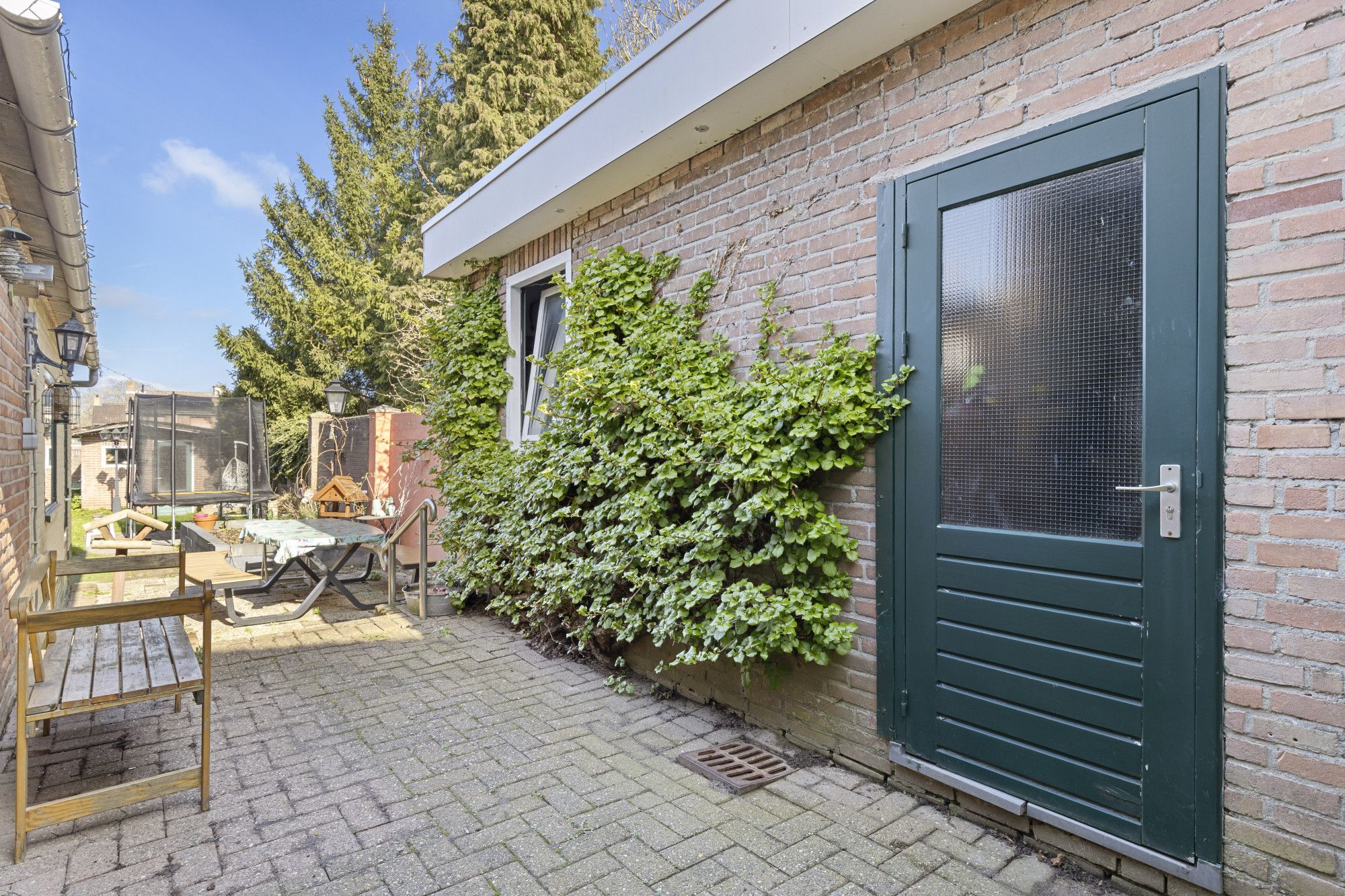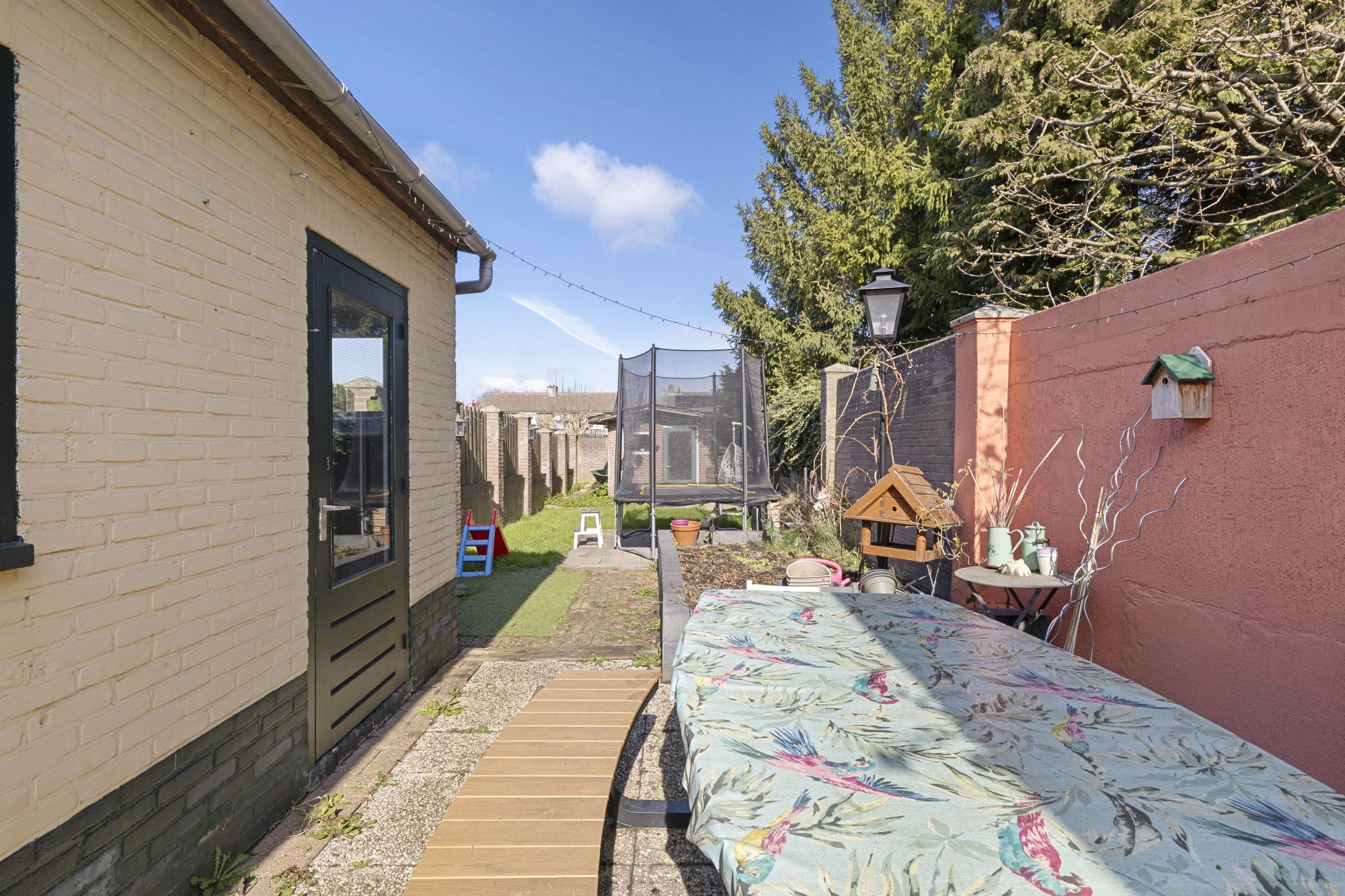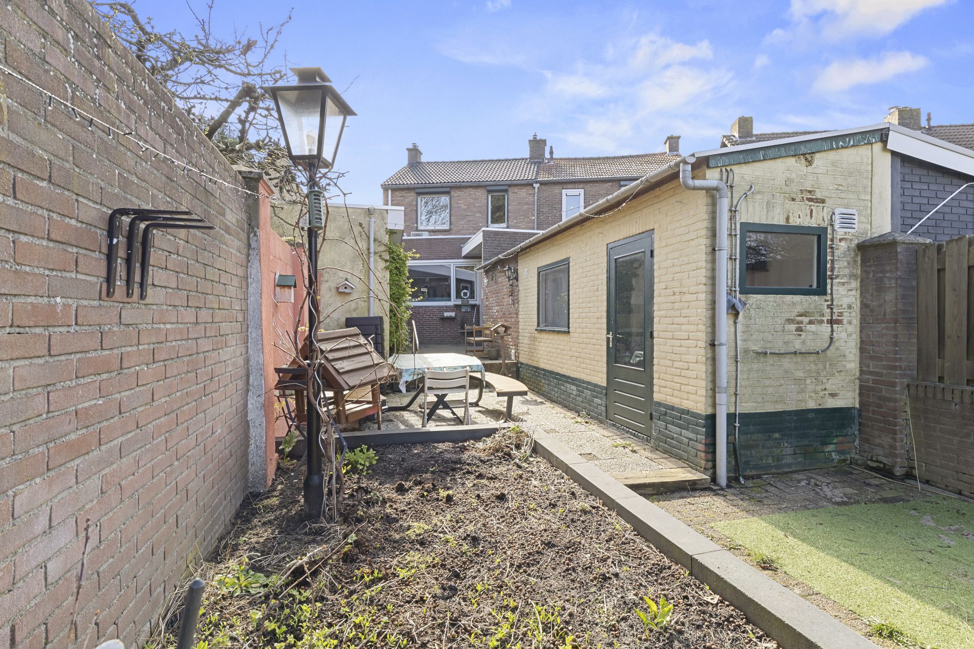 Deur naar diepe, omsloten tuin met tuinhuis en diverse tuinbergingen.