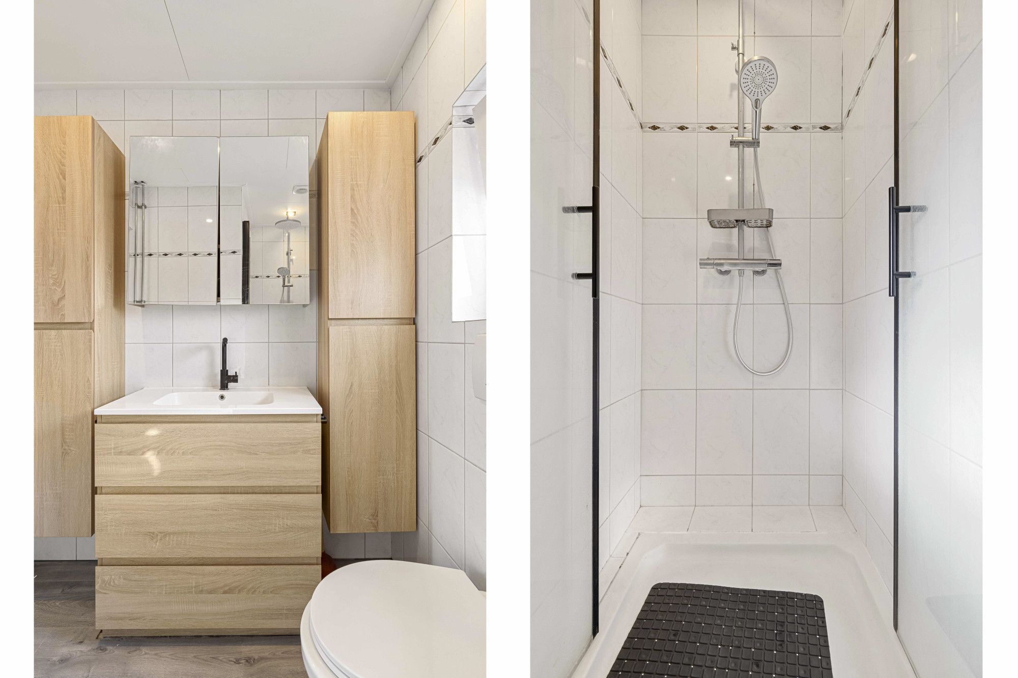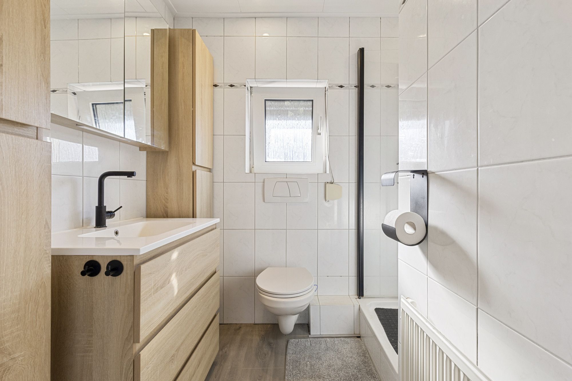 Badkamer met douche, vaste wastafel met meubel en tweede toilet.