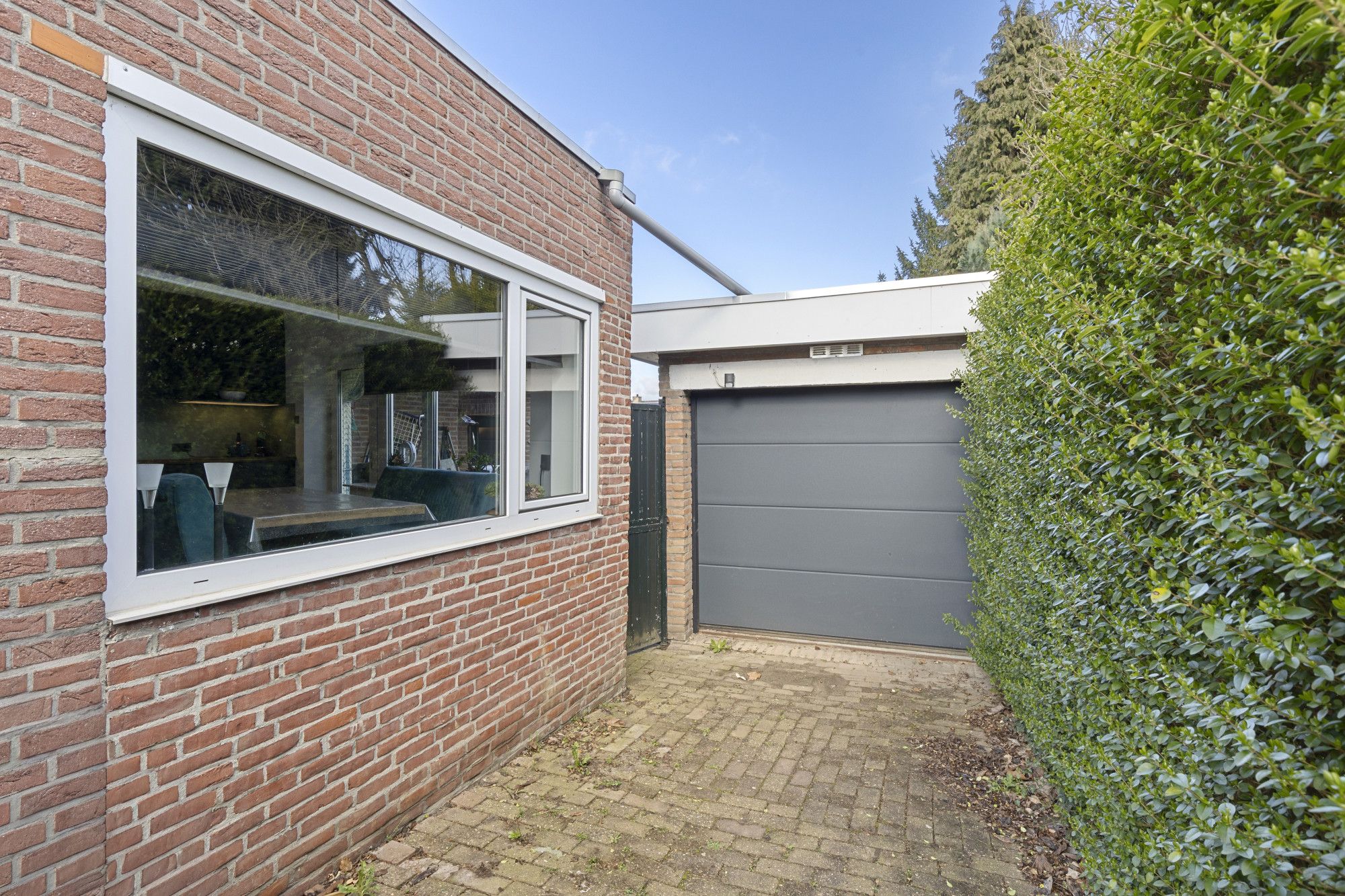 Oprit en garage met smeerput en elektrische poort.
