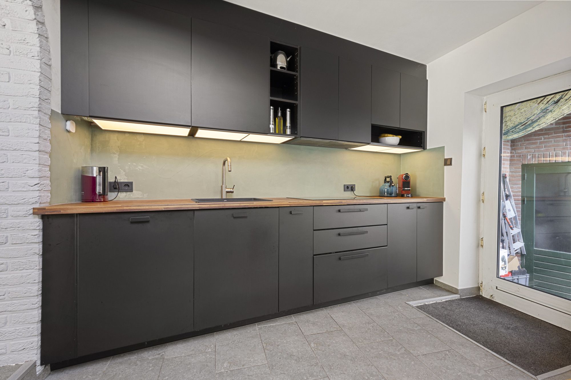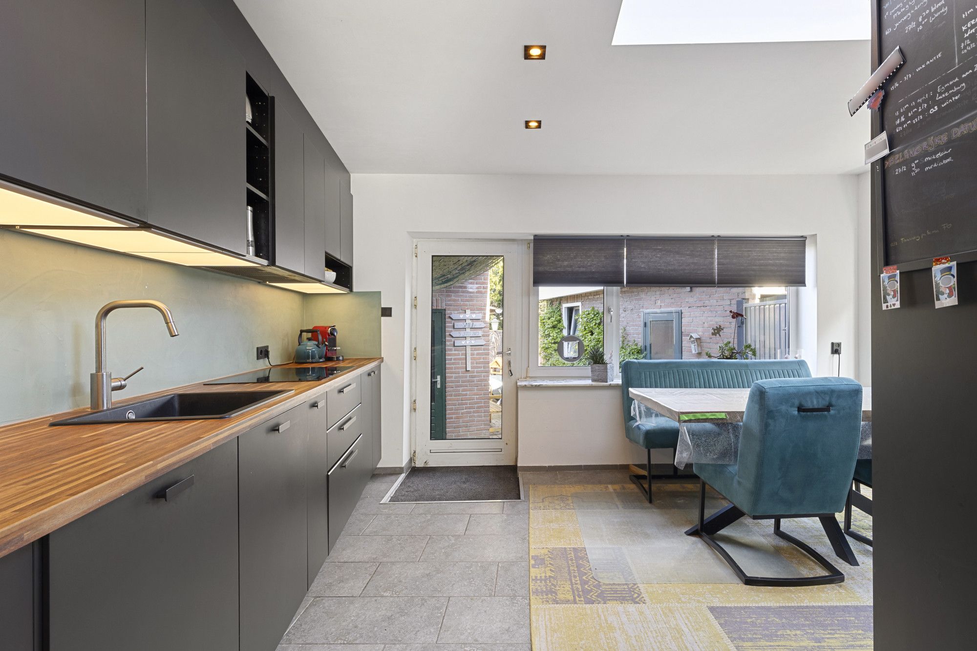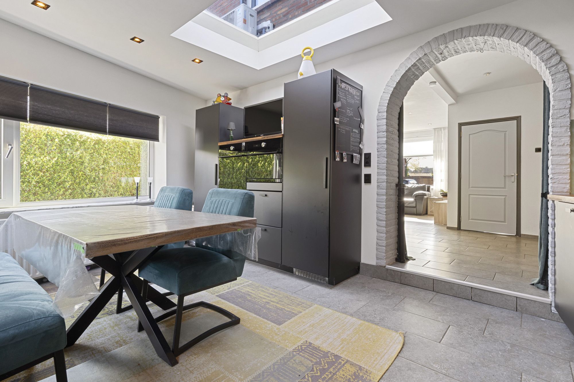 L-vormige woonkamer met vloerverwarming en riante aanbouw met leefkeuken (2022) voorzien van 5-pits inductiekooktoestel, wasemkap, een combimagnetron en een oven, grote koelkast, vriezer en vaatwasser.