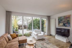 De overloop biedt toegang tot toiletruimte (v.v. zwevend closet en fonteintje), provisiekast en deur naar living/ keuken. De moderne open keuken met plavuizenvloer, bar/ zit gedeelte, installatie en apparatuur t.w.: 5- pits gaskookplaat, afzuigkap, vaatwasser, oven en Amerikaanse koelkast. De riante living is verdeeld in eet- en zit gedeelte. De eetkamer (5,21 m x 4,12 m) is v.v. een parketvloer en heeft een open verbinding naar keuken en woonkamer. Middels twee traptredes is de sfeervolle woonkamer (4,98 m x 3,80 m) bereikbaar, deze is v.v. een laminaatvloer, openhaard een heeft middels openslaande deur toegang tot tuin.