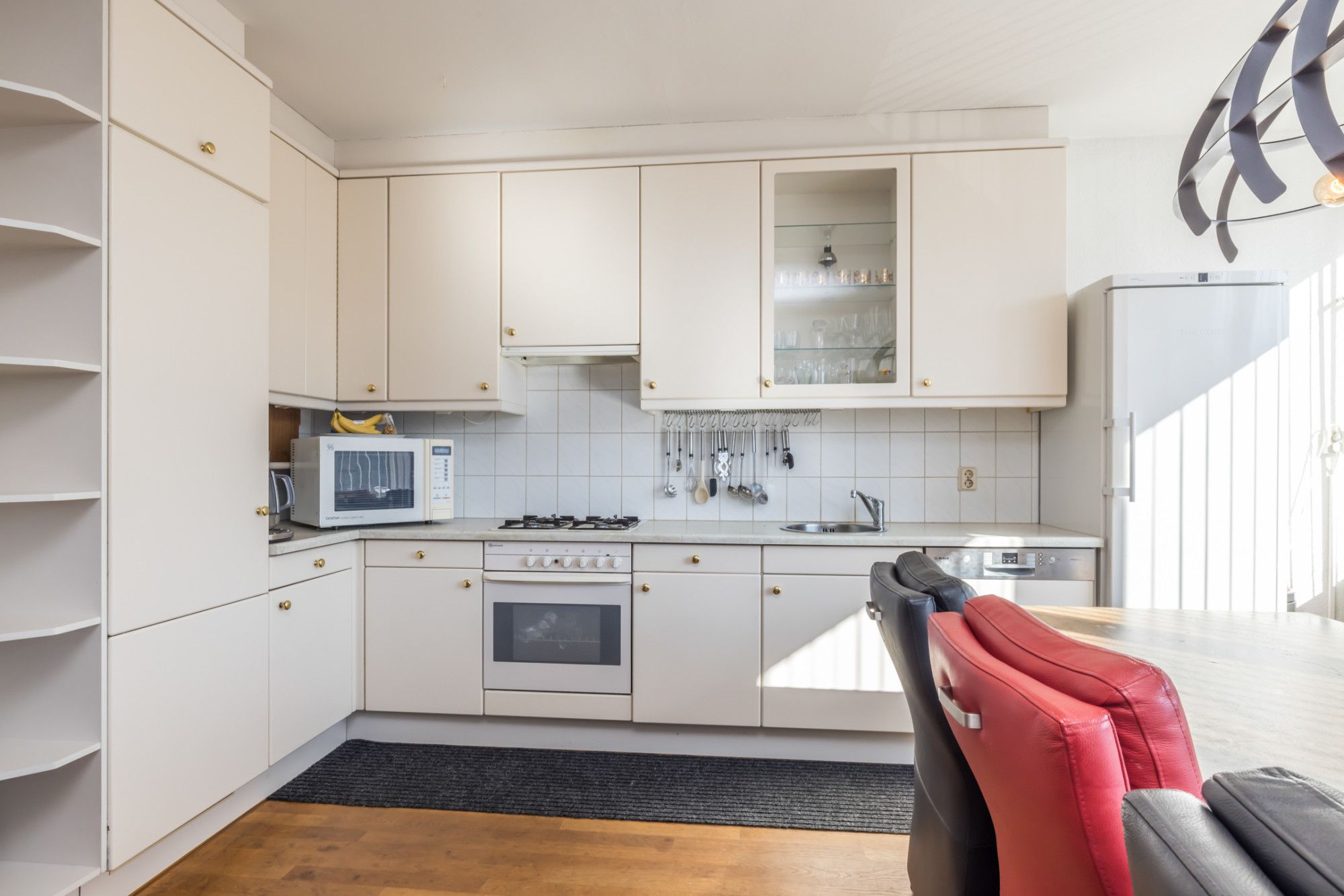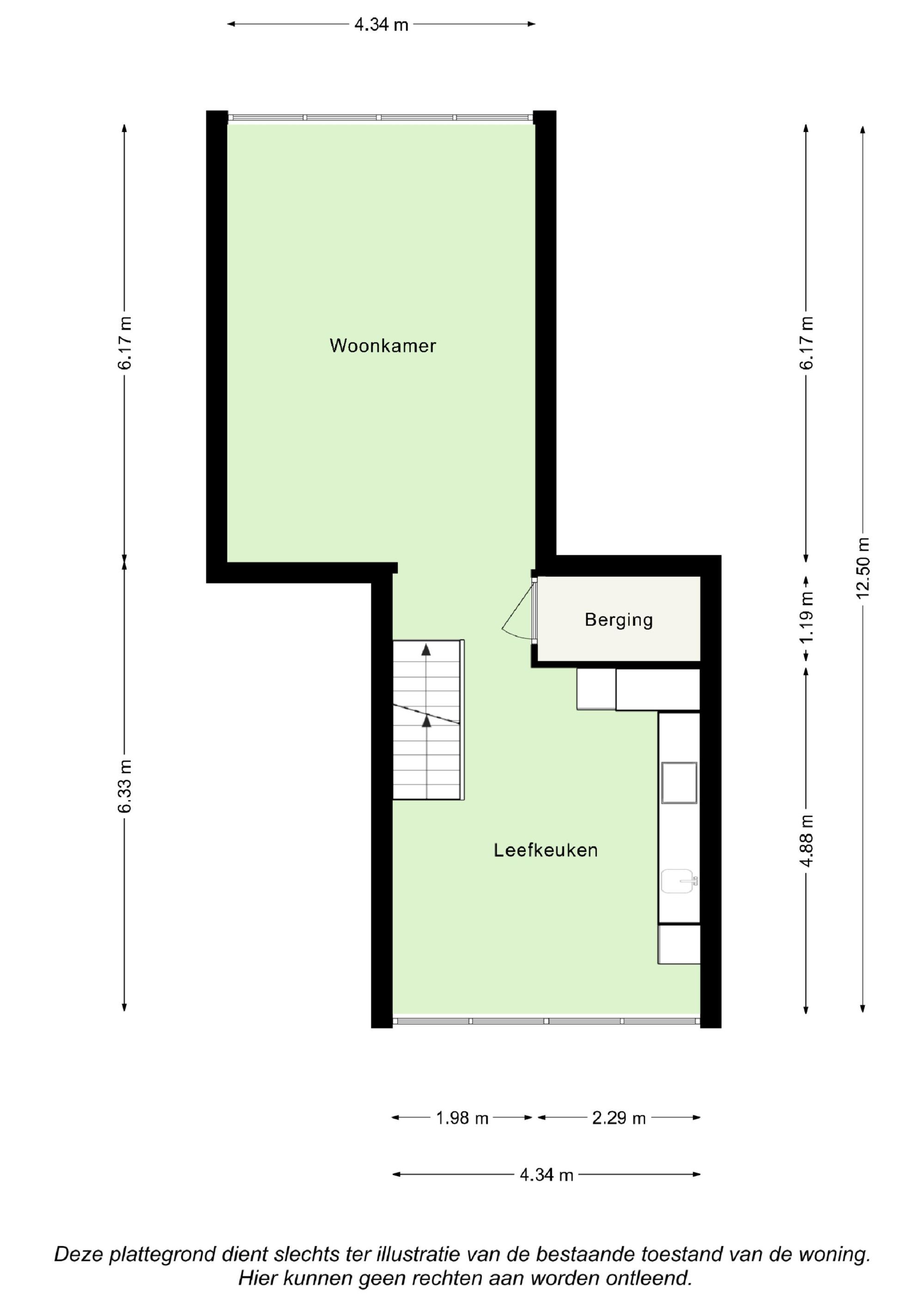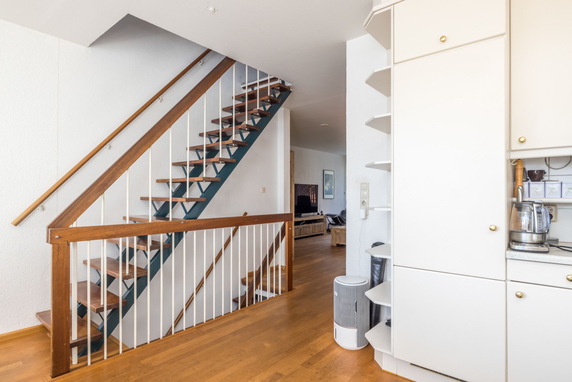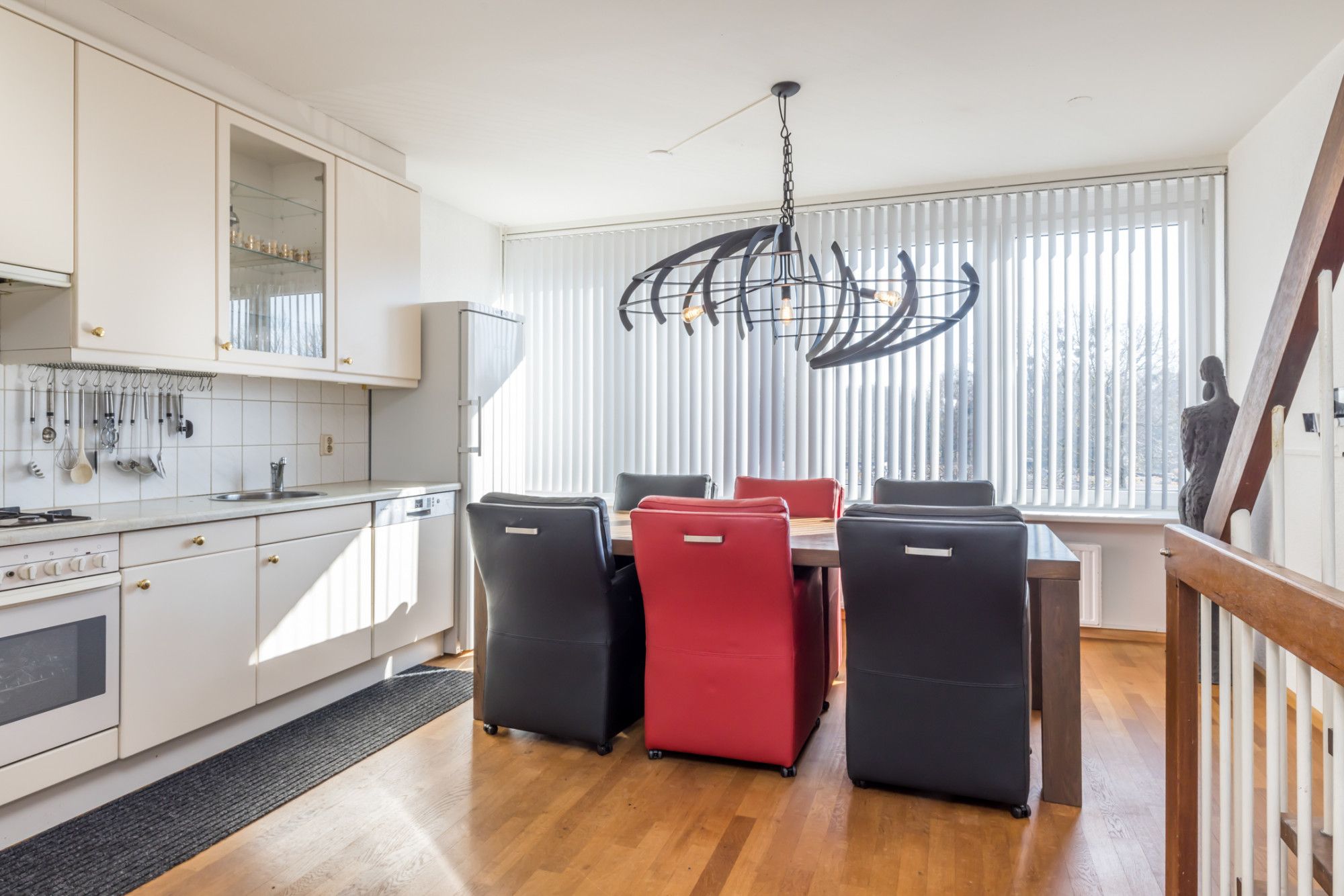 Middels trap (vanuit hal) te bereiken 1e verdieping, de ruime woonkamer (6,17 m x 4,34 m) biedt toegang tot berging en heeft een open verbinding naar de aan de voorzijde gelegen leefkeuken (4,88 m x 4,34 m) met installatie en inbouwapparatuur t.w.: 4-pits gaskookplaat, vaatwasser, oven en koelkast.