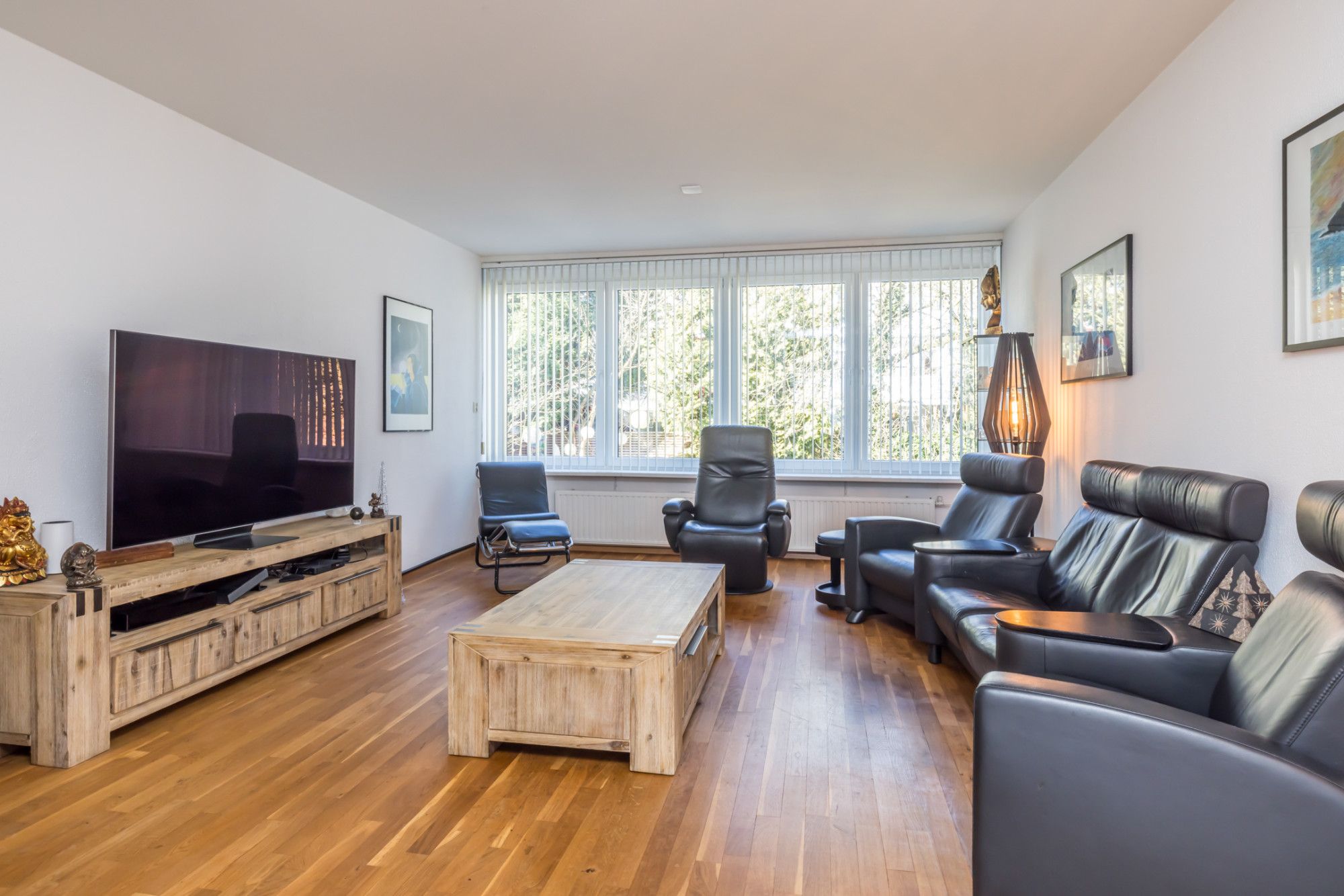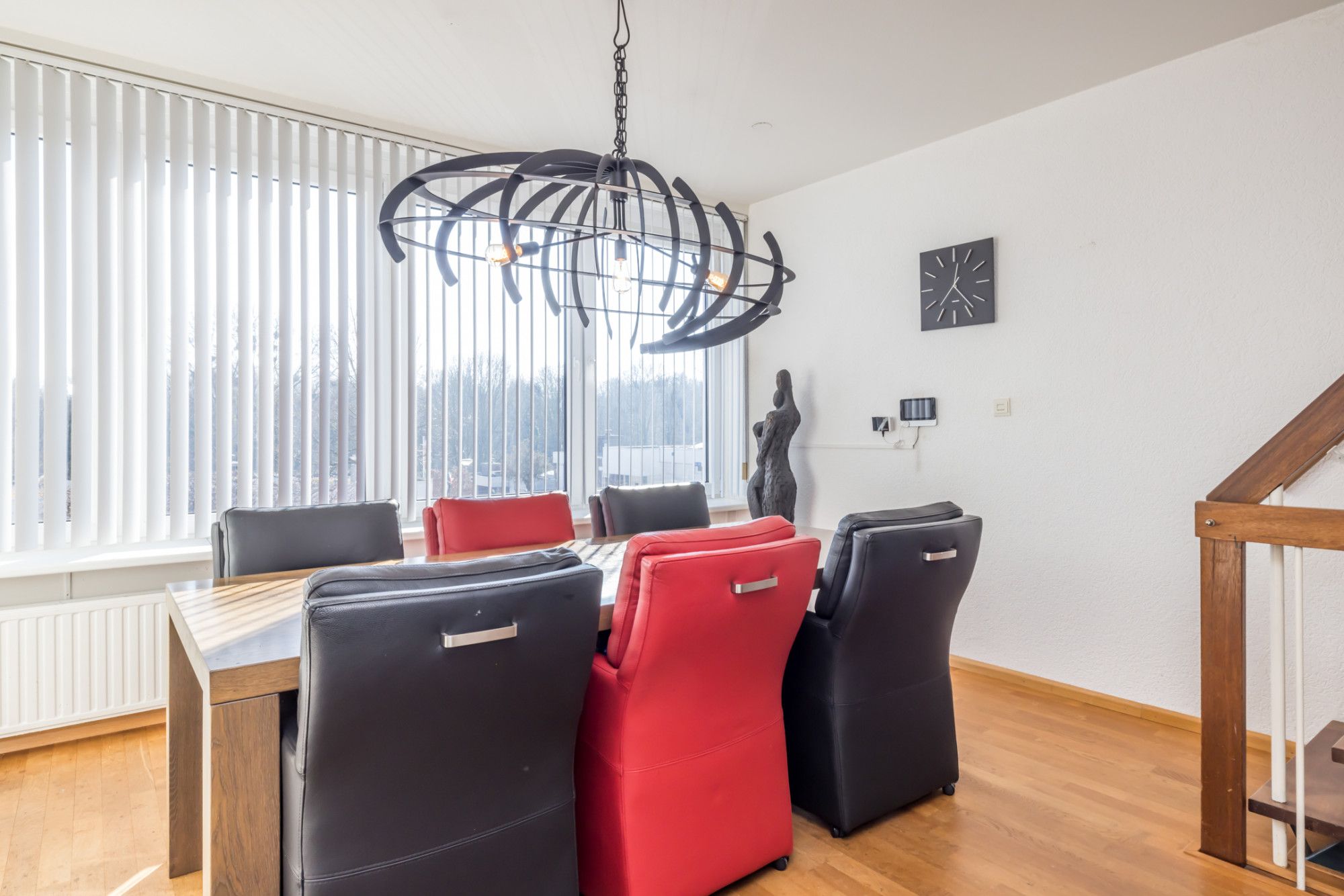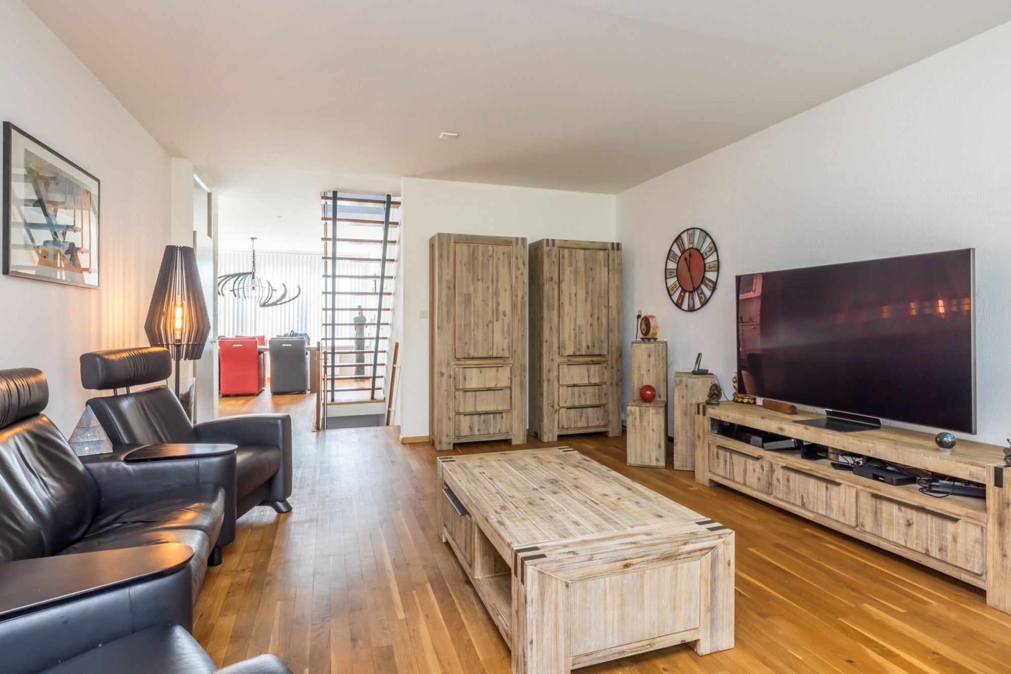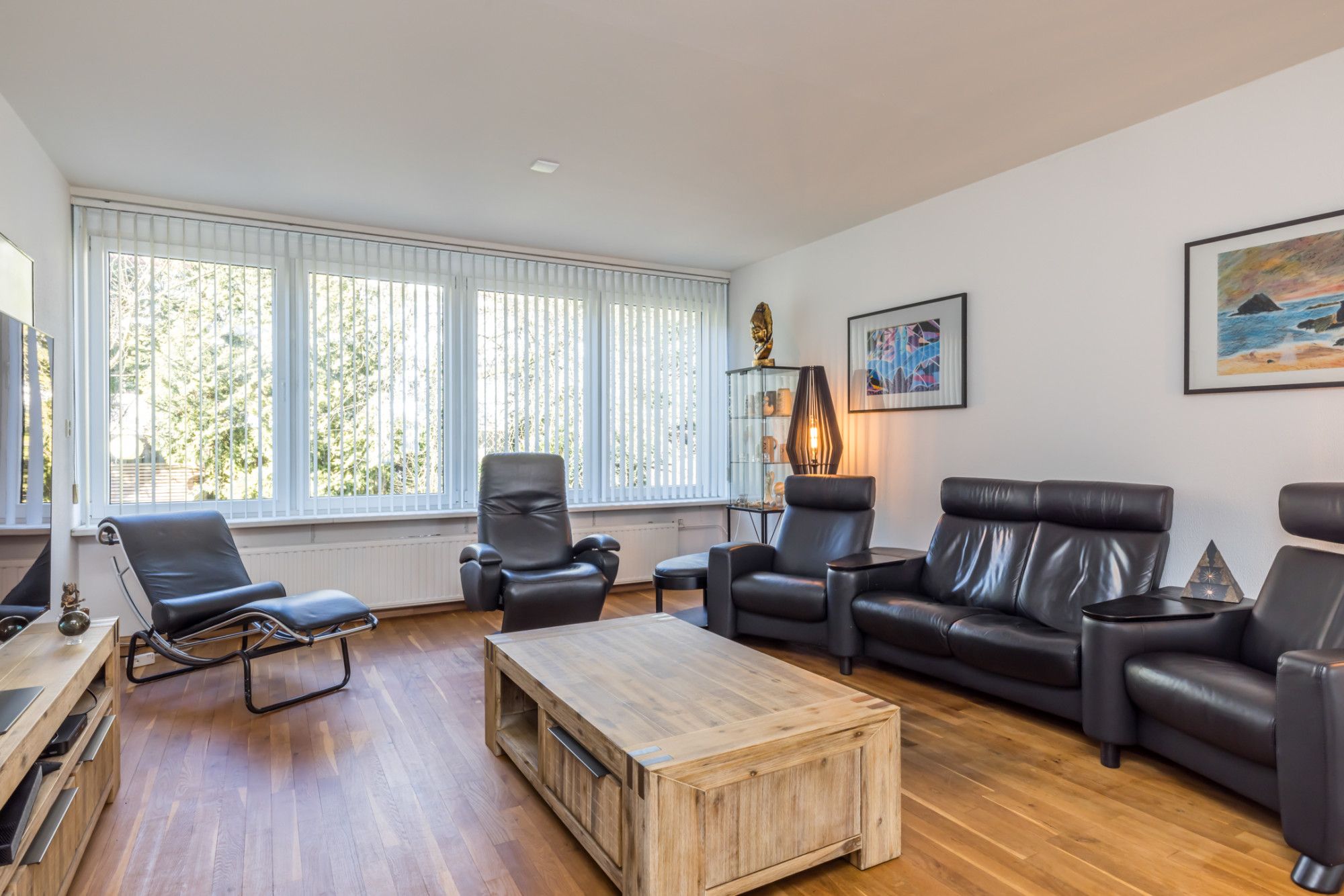 Middels trap (vanuit hal) te bereiken 1e verdieping, de ruime woonkamer (6,17 m x 4,34 m) biedt toegang tot berging en heeft een open verbinding naar de aan de voorzijde gelegen leefkeuken (4,88 m x 4,34 m) met installatie en inbouwapparatuur t.w.: 4-pits gaskookplaat, vaatwasser, oven en koelkast.