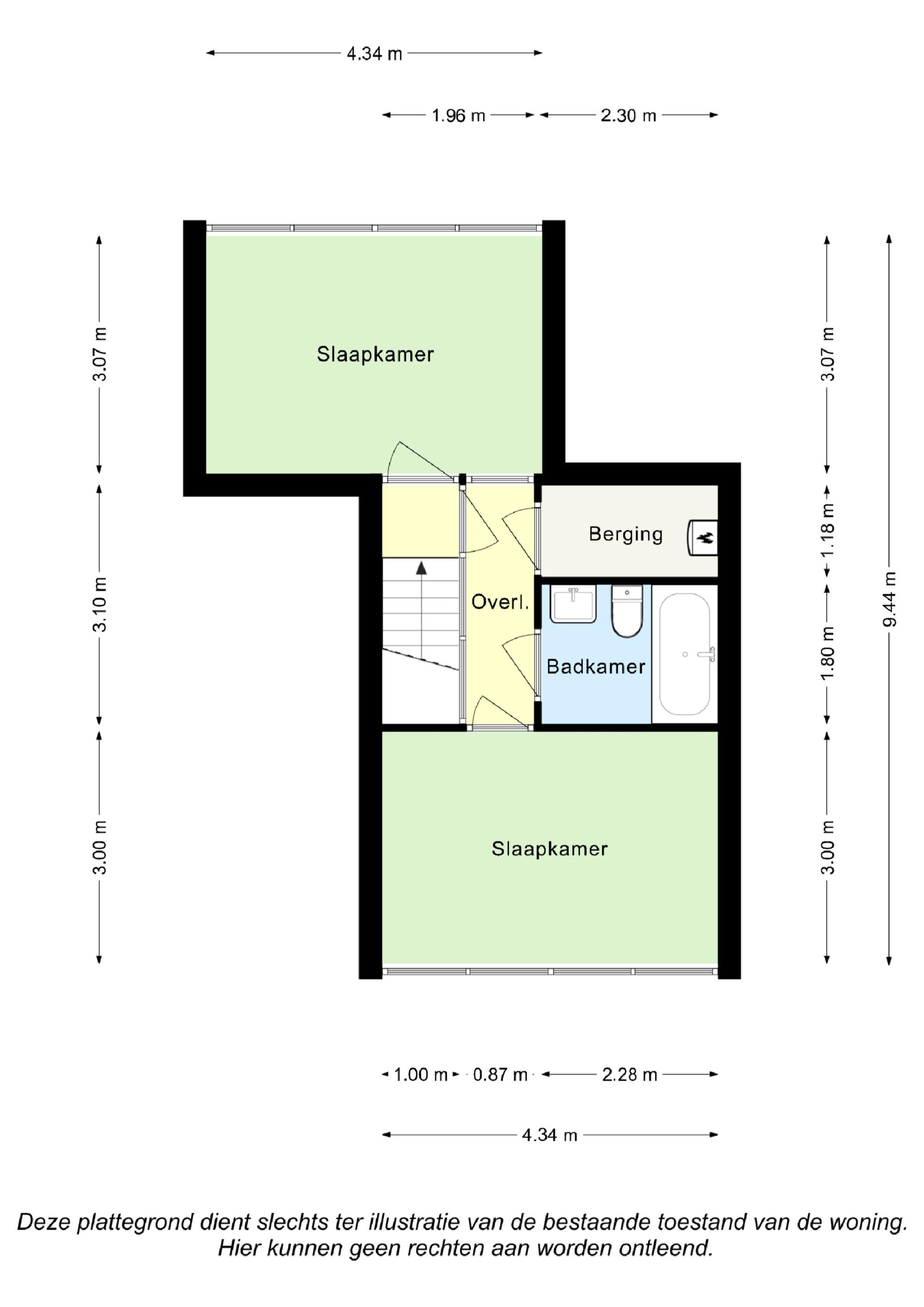 De overloop biedt toegang tot berging (alwaar cv-ketel) badkamer en 2 slaapkamers. Slaapkamer I (4,34 m x 3,00 m) deze is aan de voorzijde gelegen. De betegelde badkamer (2,28 m x 1,80 m) v.v. 2e toilet, wastafel en ligbad. Slaapkamer II 4,34 m x 3,07 m) is aan de achterzijde gelegen.