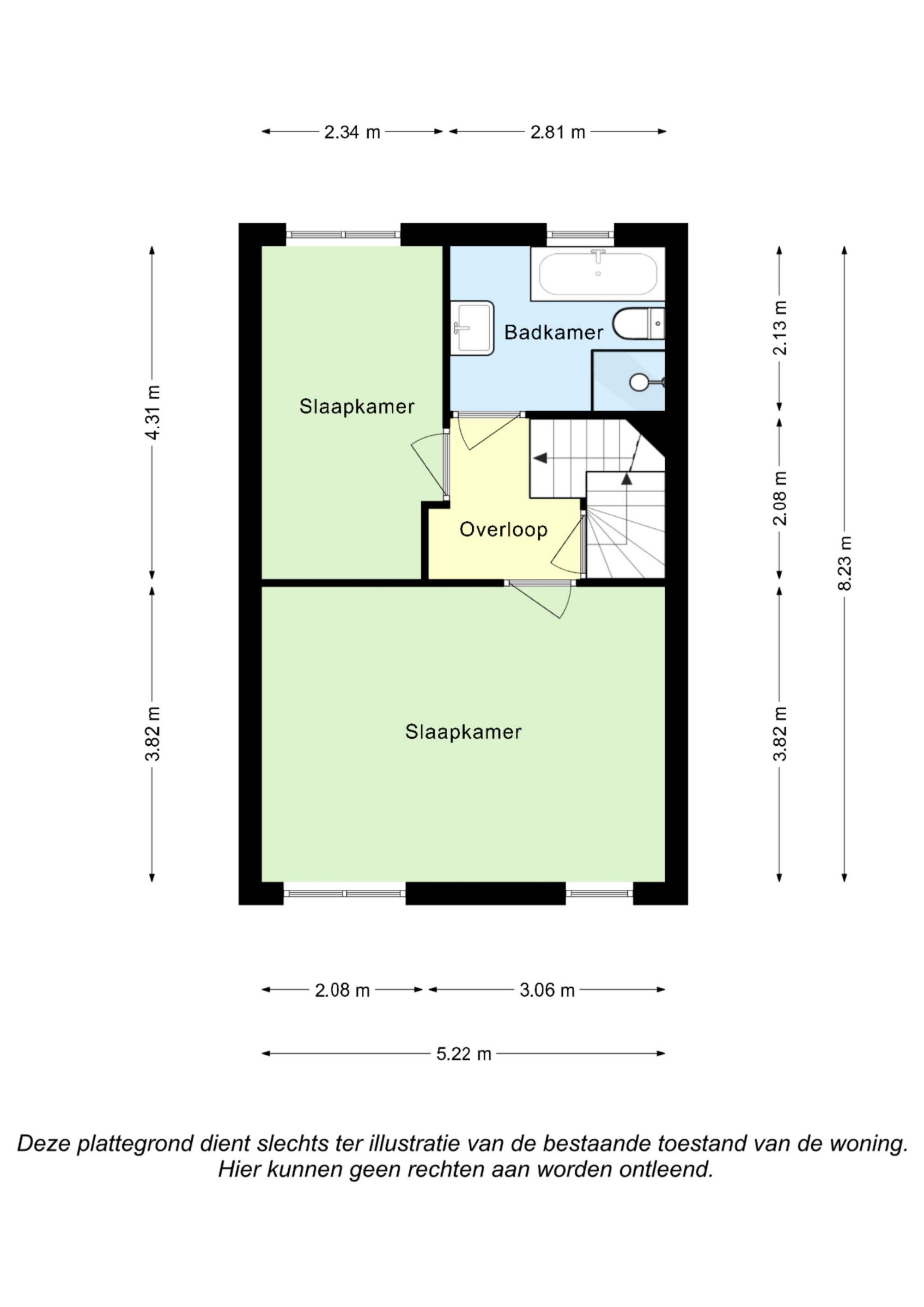 De overloop biedt toegang tot 2 ruime slaapkamers en badkamer. Slaapkamer I (5,22 m x 3,82 m) en slaapkamer II (4,31 m x 2,34 m) zijn beiden v.v. een laminaatvloer De badkamer (2,81 m x 2,13 m) is v.v. een ligbad, 2e toilet, douche en wastafel inclusief badmeubel.