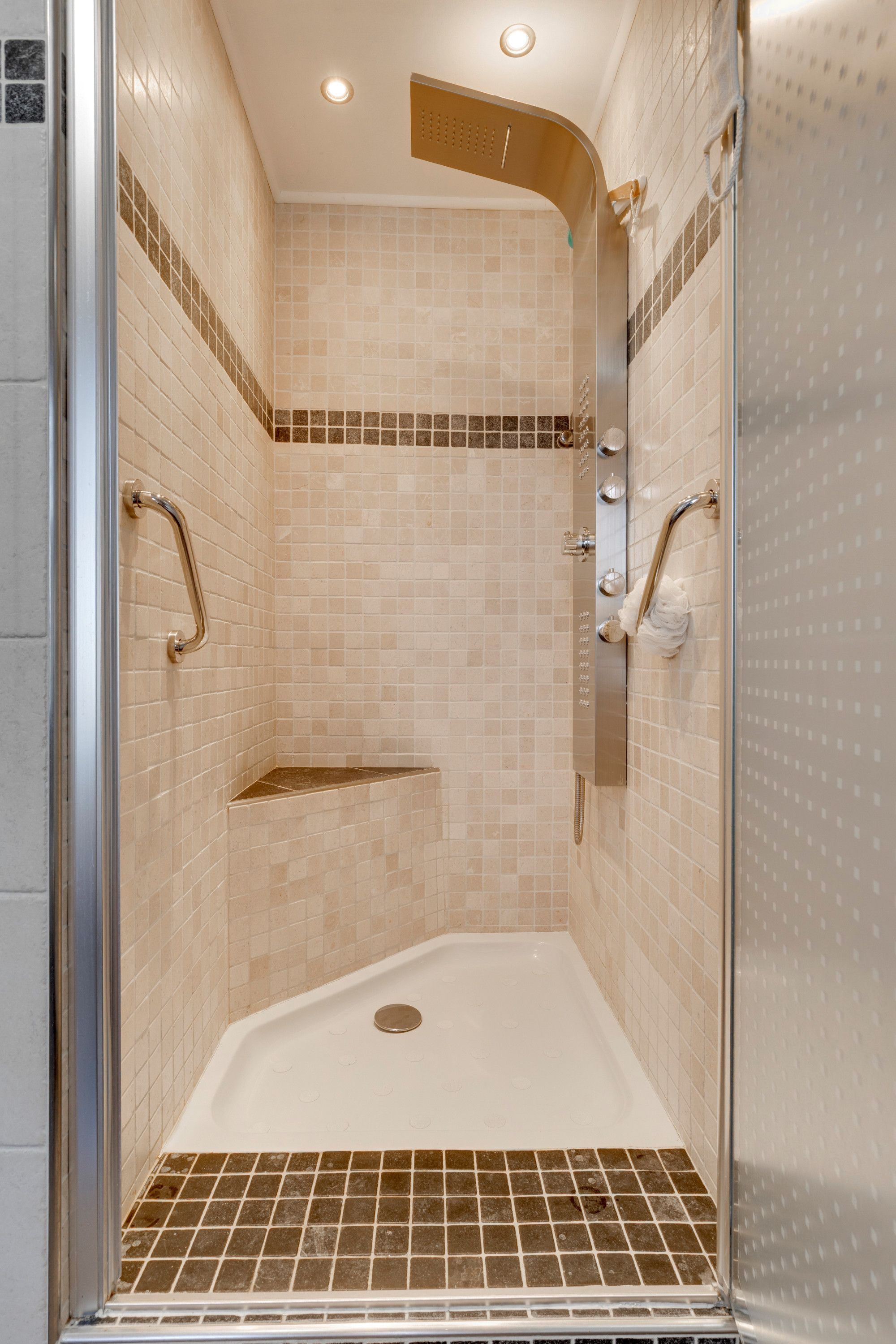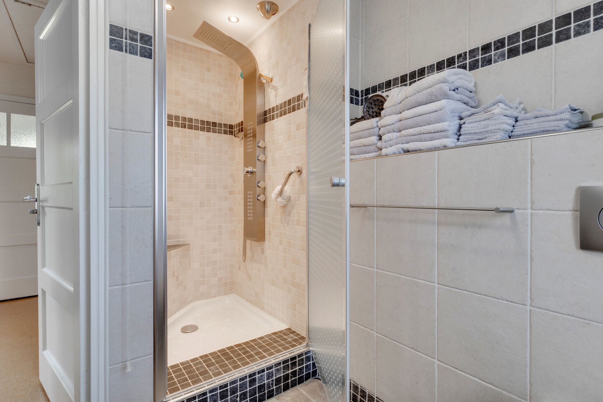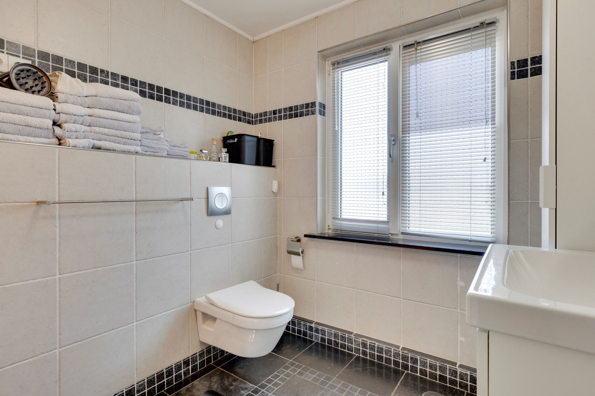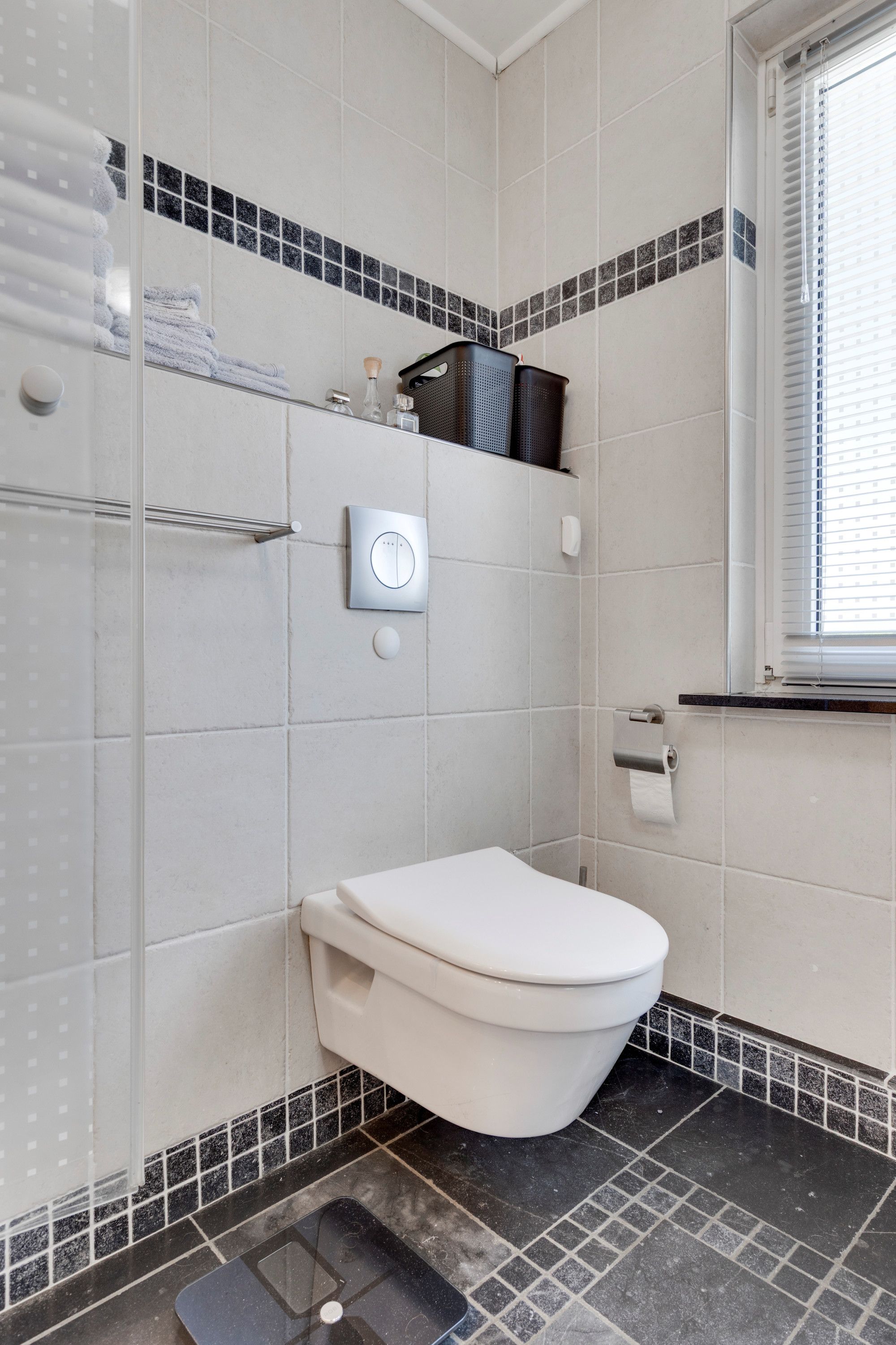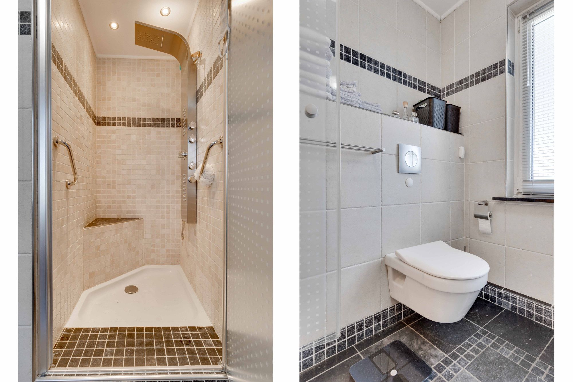 Moderne en luxe geheel betegelde badkamer v.v. inloopdouche, 2e toilet (vrij hangend) en modern badkamermeubel incl. wasbak