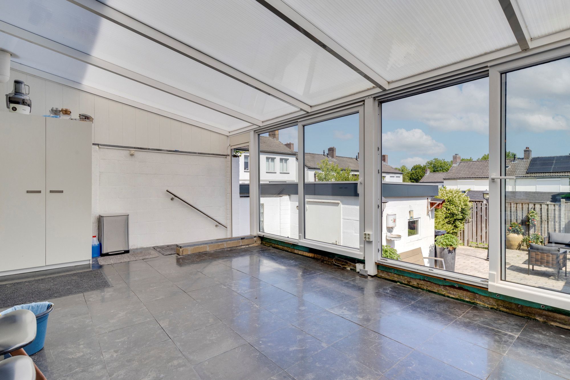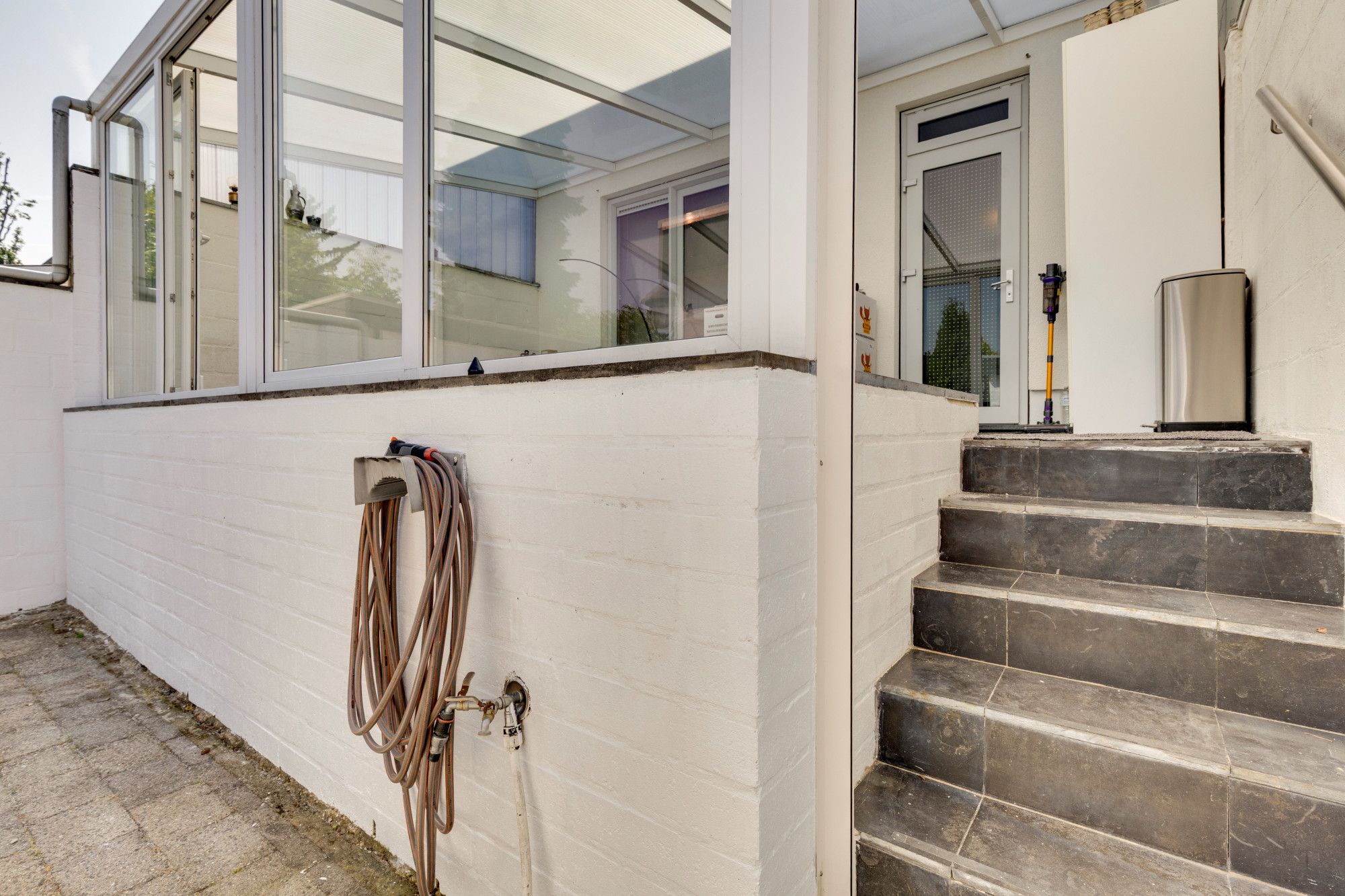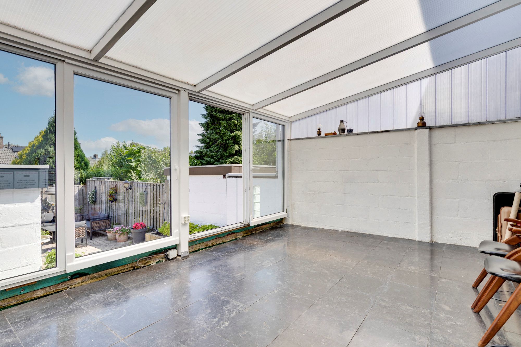 Riante serre v.v. tegelvloer (hardsteen) en kunststoffen puien en trap naar de tuin.