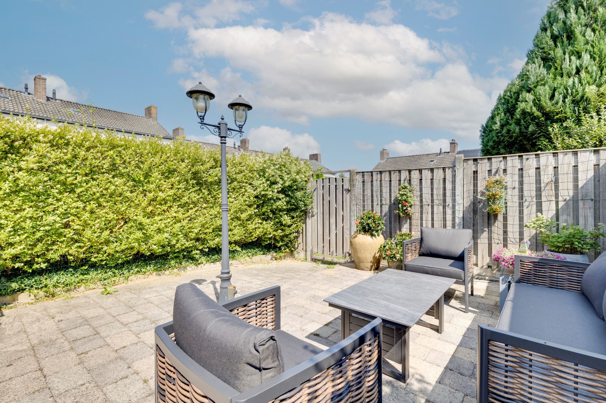 Keurige geheel betegelde onderhoudsvriendelijke tuin met terras en stenen berging v.v. elektra.
