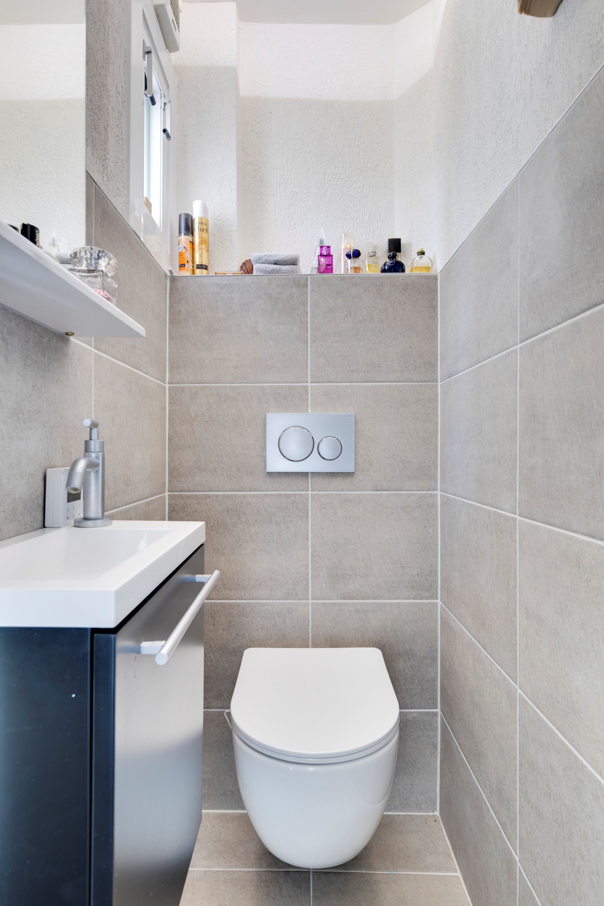 Hal/entree met parketvloer, meterkast. en geheel betegelde moderne toiletruimte met fonteintje.