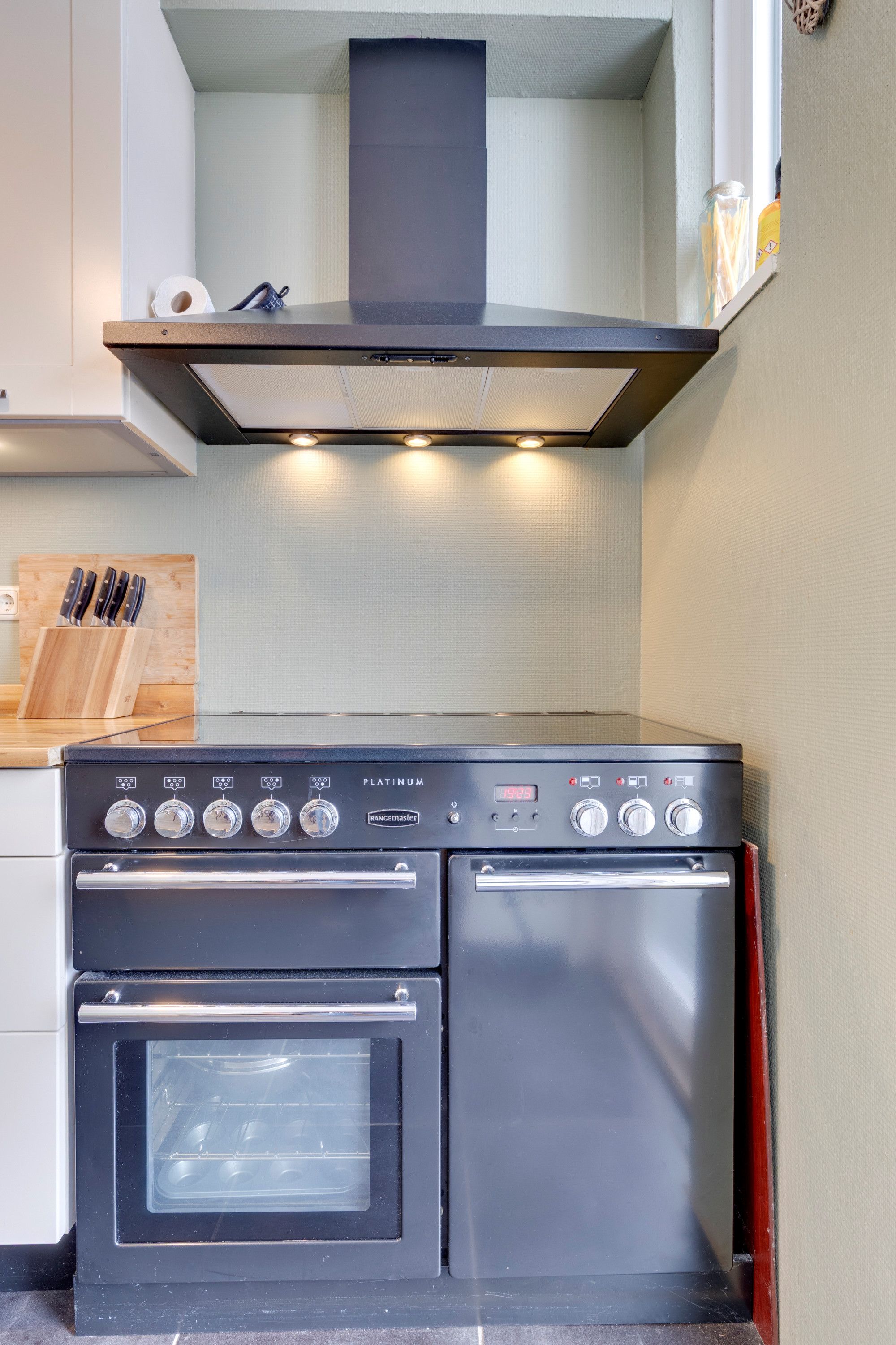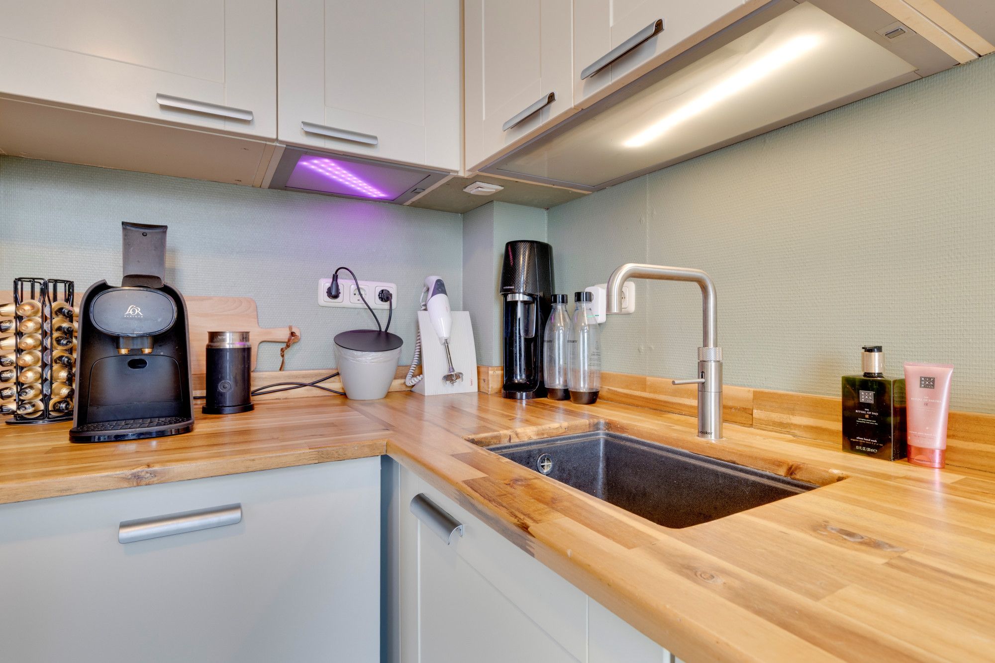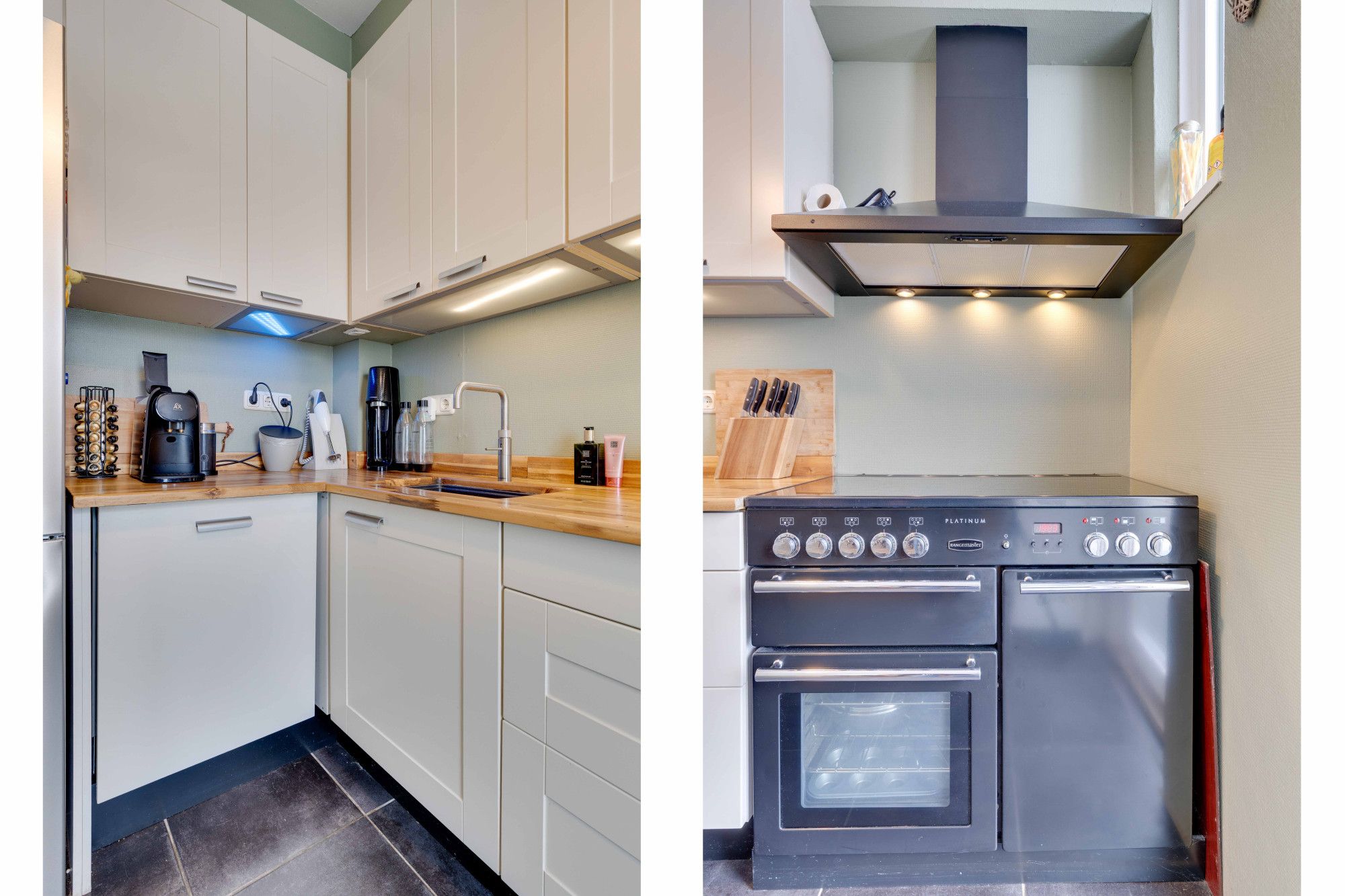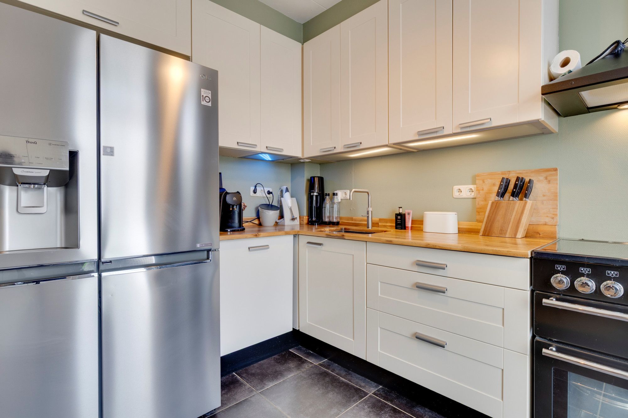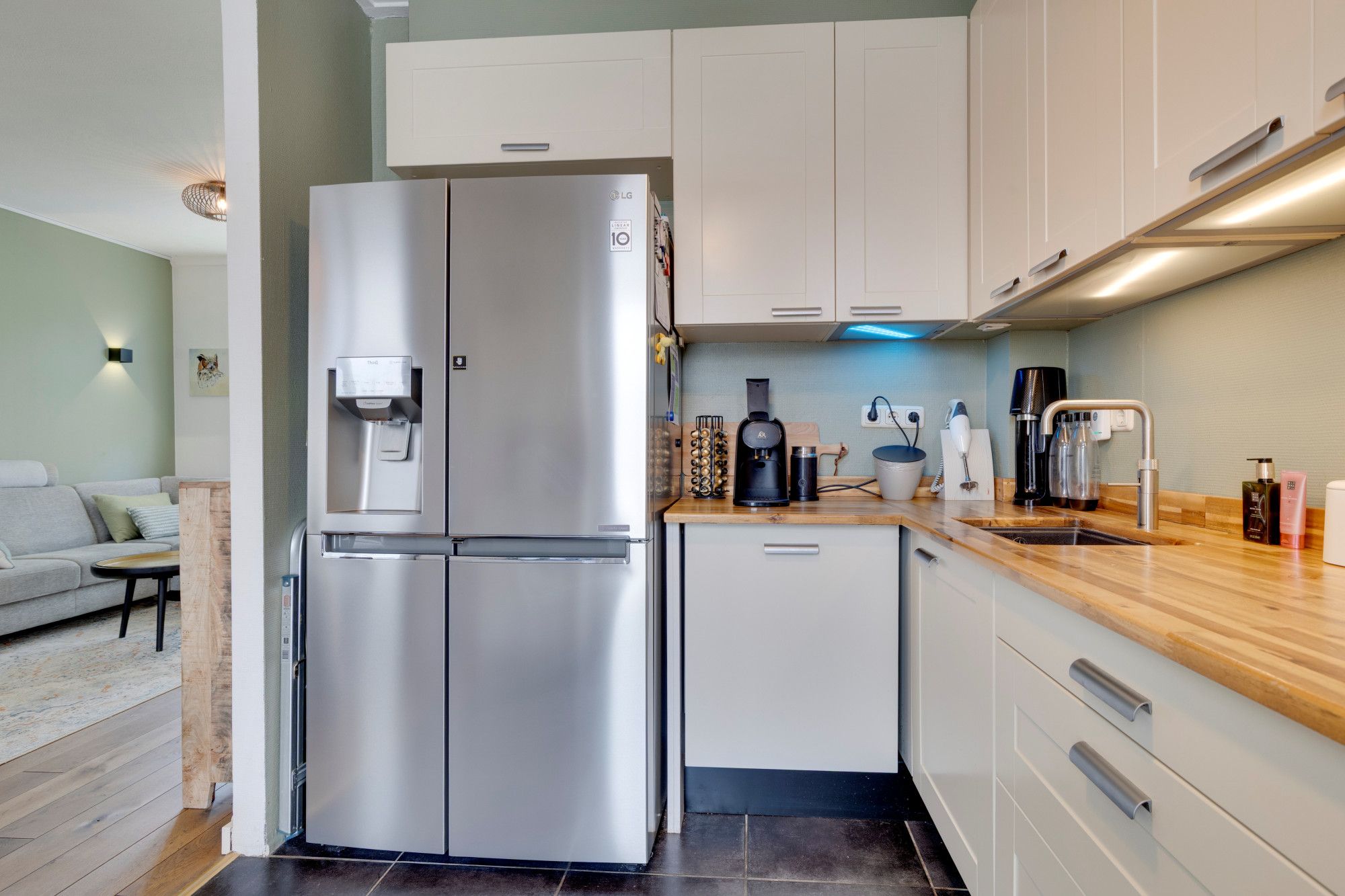 Fijne doorzon woonkamer v.v. een parketvloer, airconditioning en schuifpui naar de riante serre aan de achterzijde. Open moderne keuken met luxe keukeninstallatie inclusief inbouwapparatuur, te weten, inductie kookplaat, Quooker mengkraan (kokend water), extra brede hete lucht oven, wasemkap en losse Amerikaanse rvs koelkast met vriesgedeelte, koelkast en ijsblokjesmachine.
