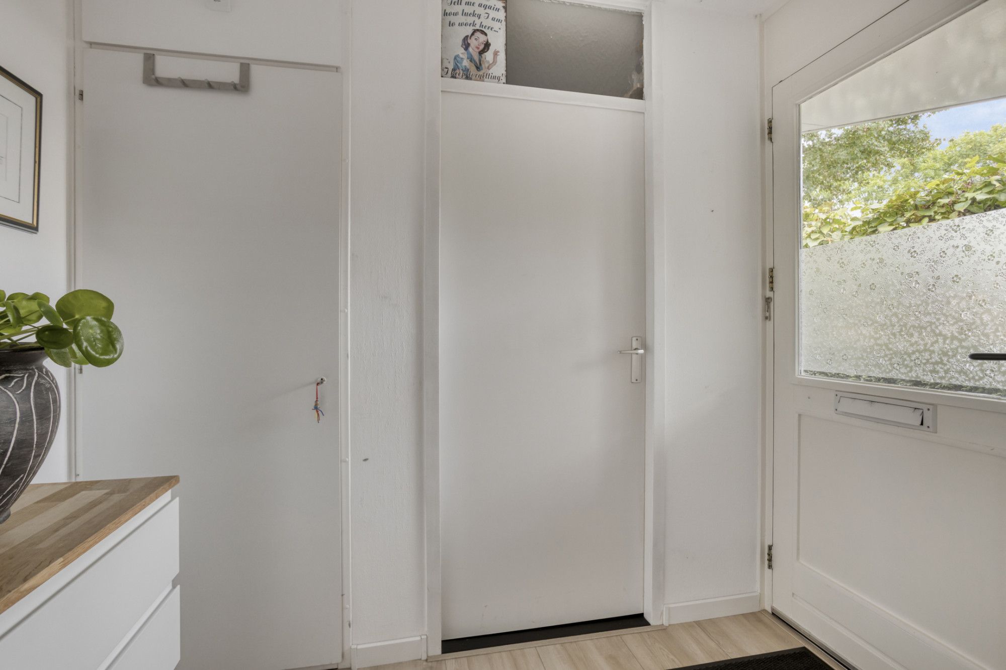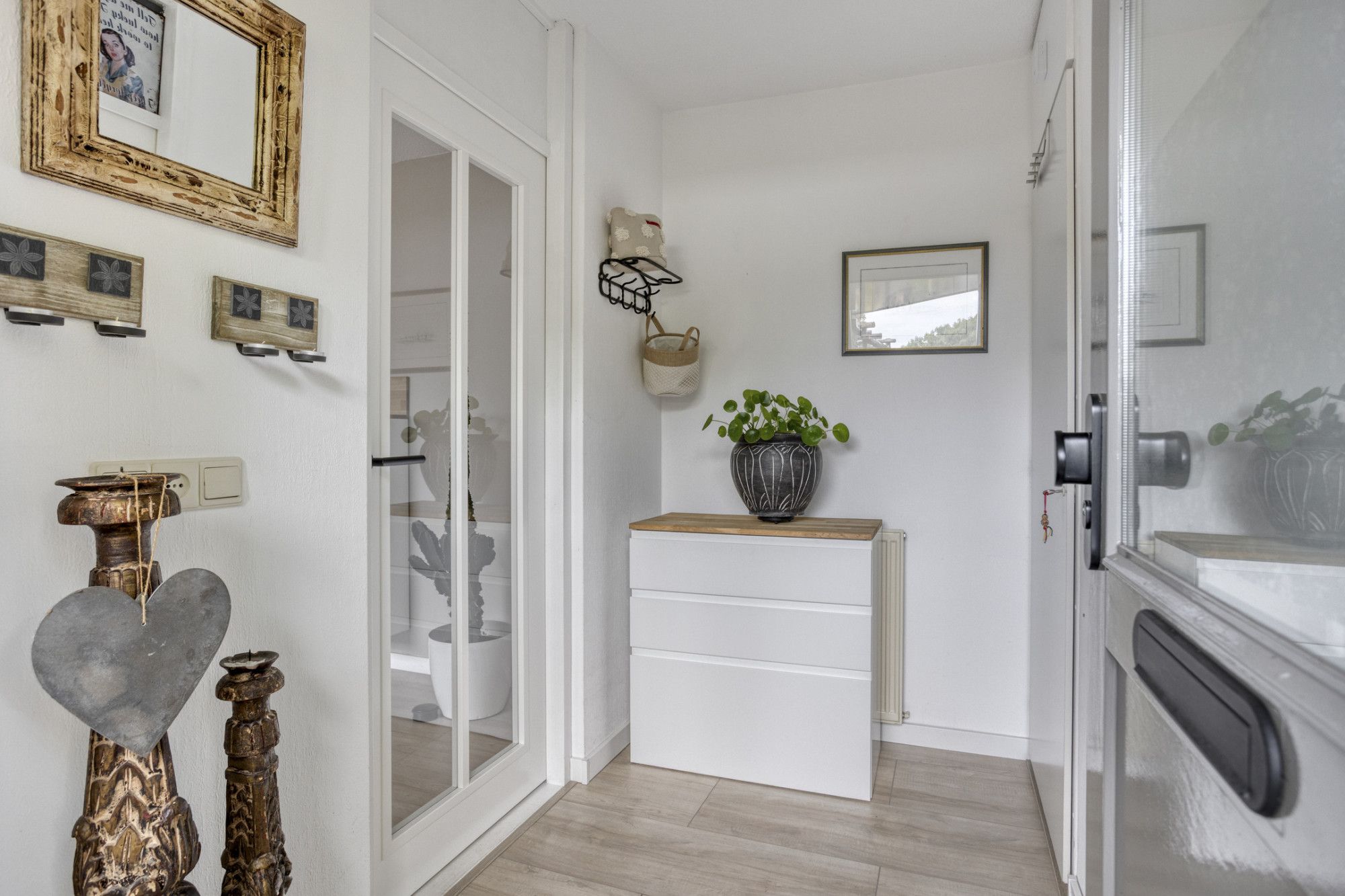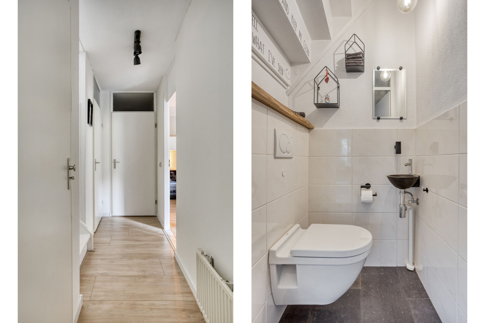 Portaal met toegang naar deels betegelde toiletruimte, badkamer, bergkast en slaapkamer.