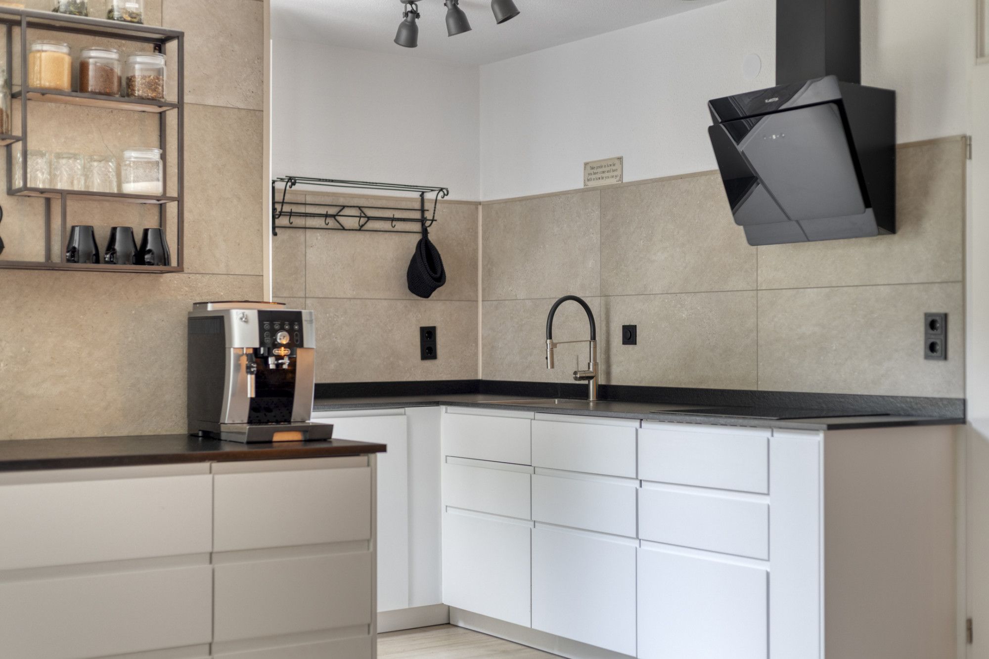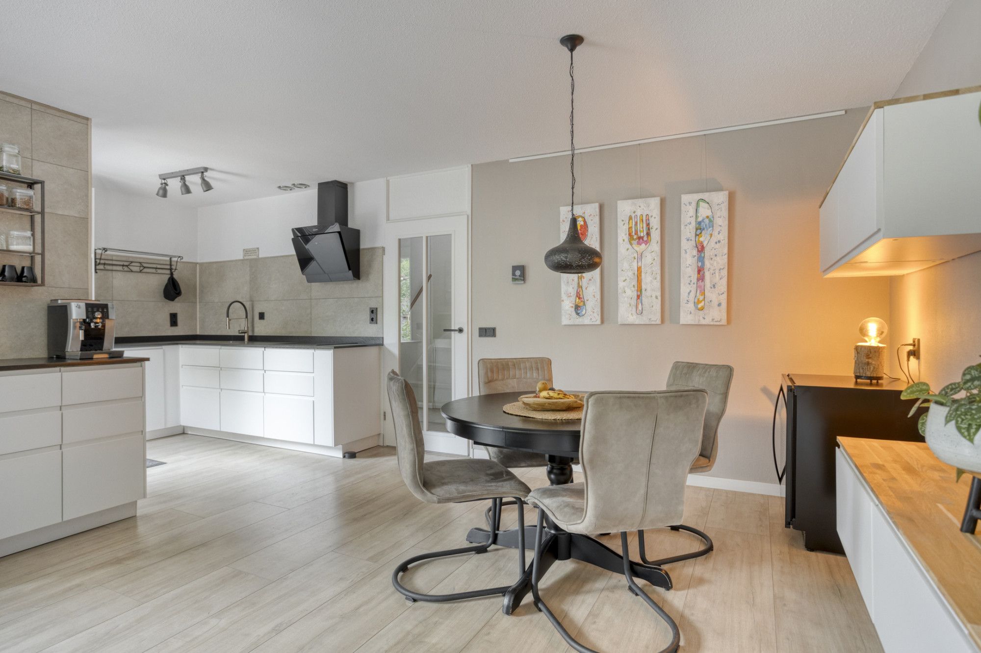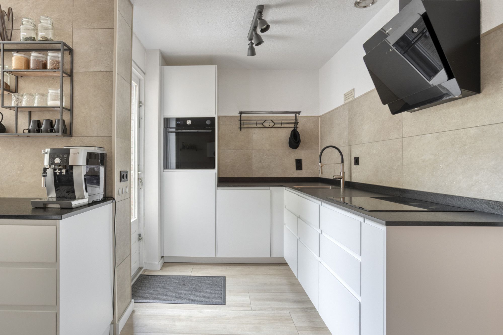 separate koffie corner met extra bergruimte. Vanuit de keuken toegang tot de omsloten patio/tuin met zicht op de groene parkachtige omgeving, voorzien van plantenborders en overkapping (2.83 x 2.14 m).