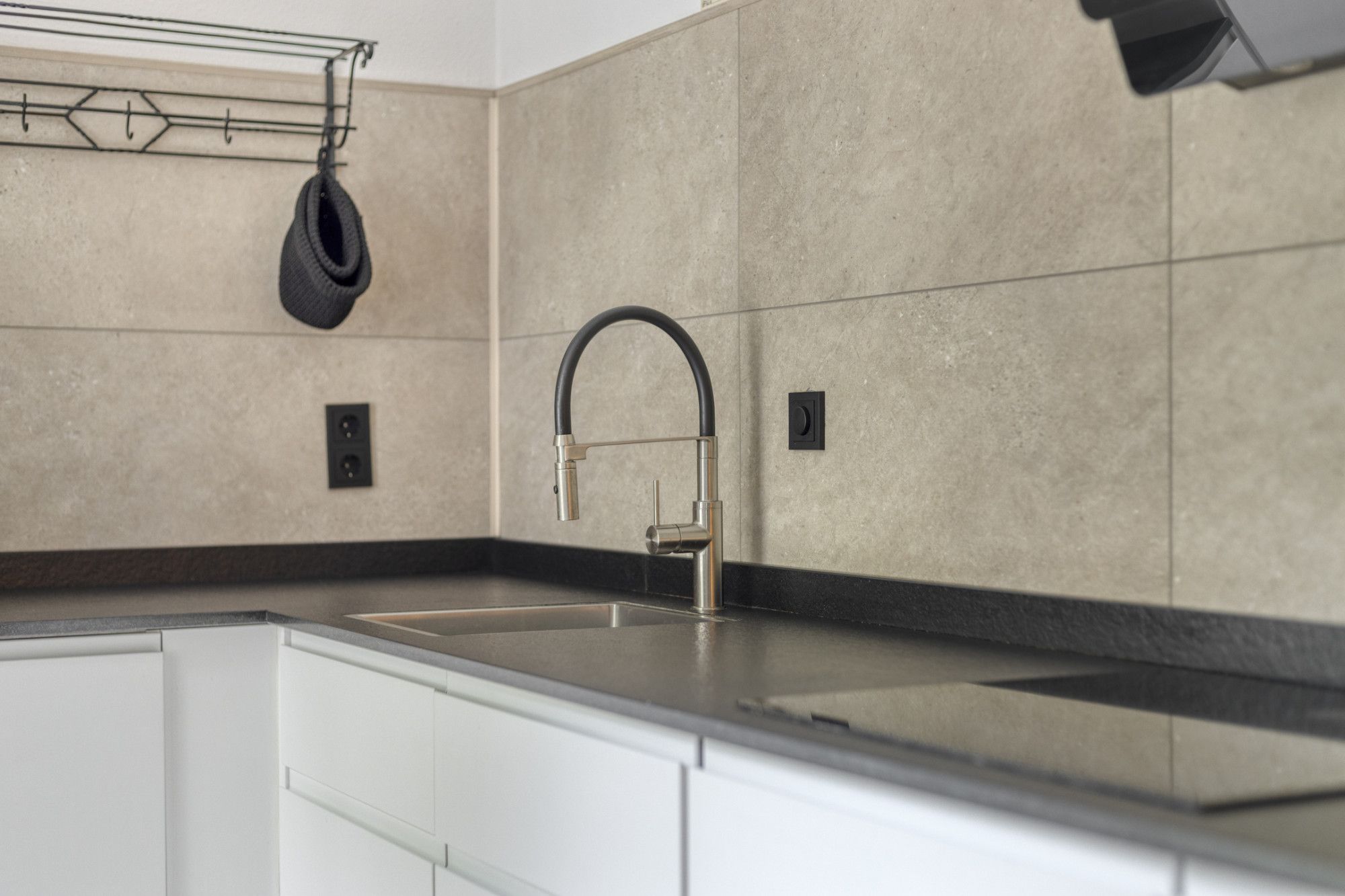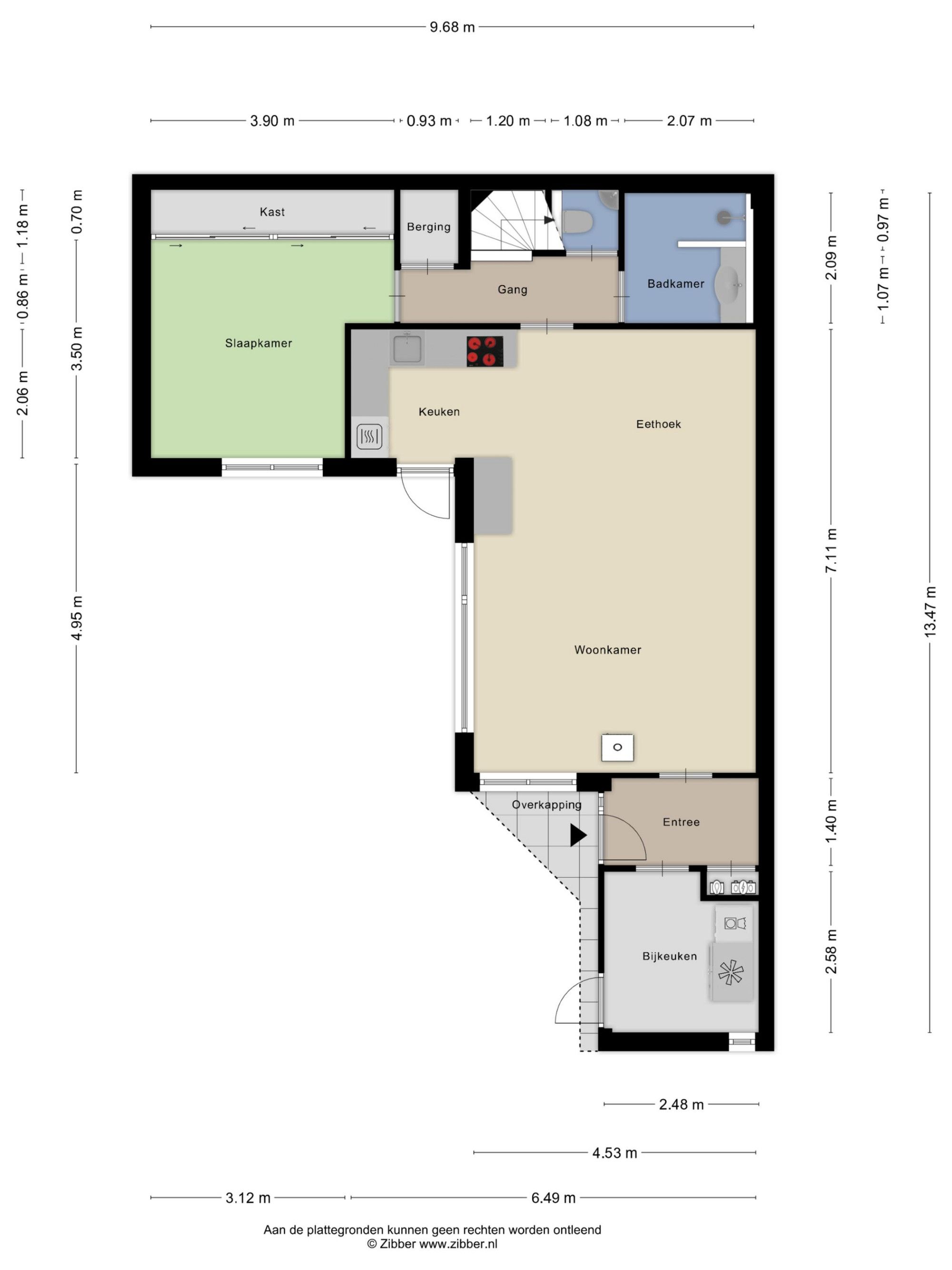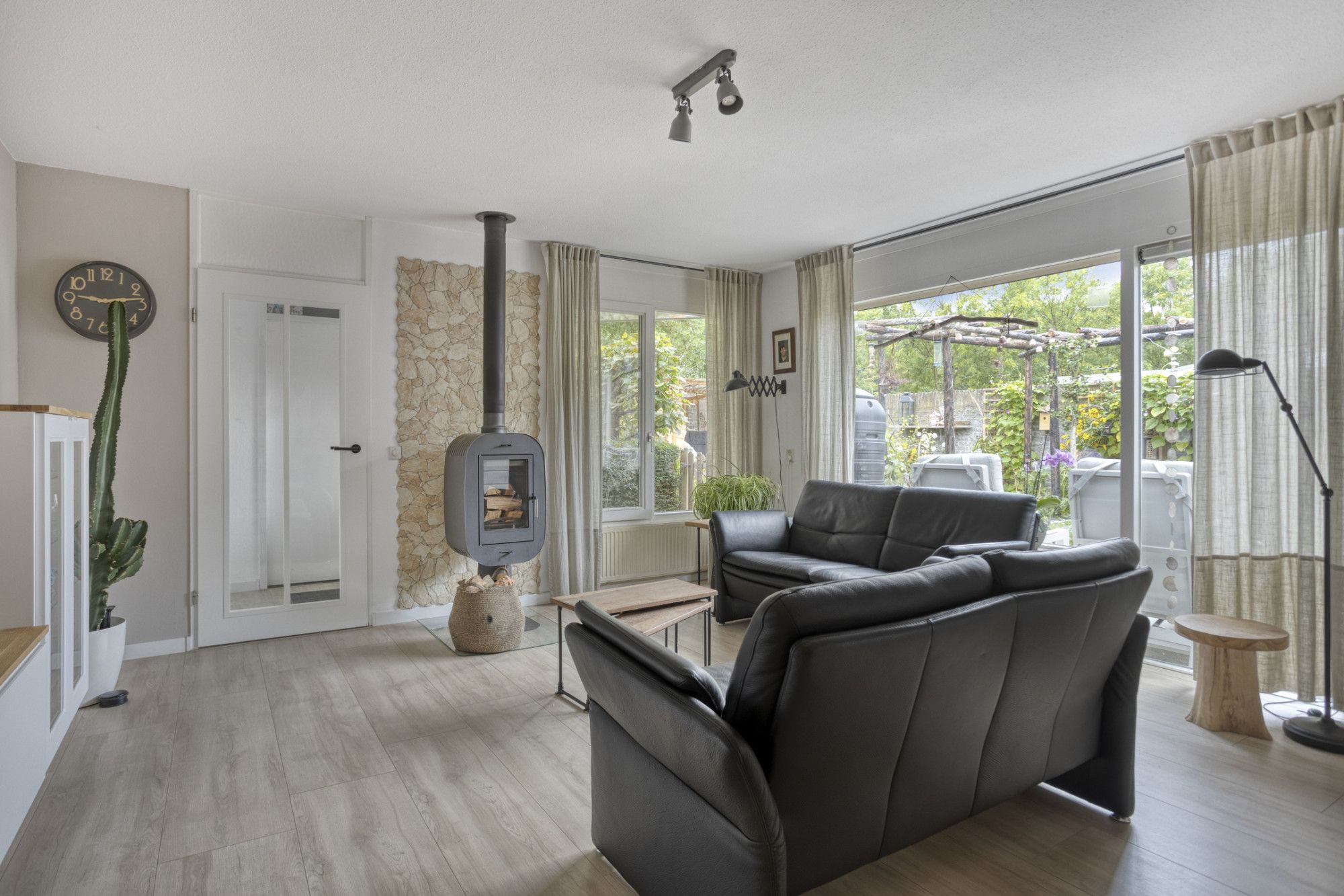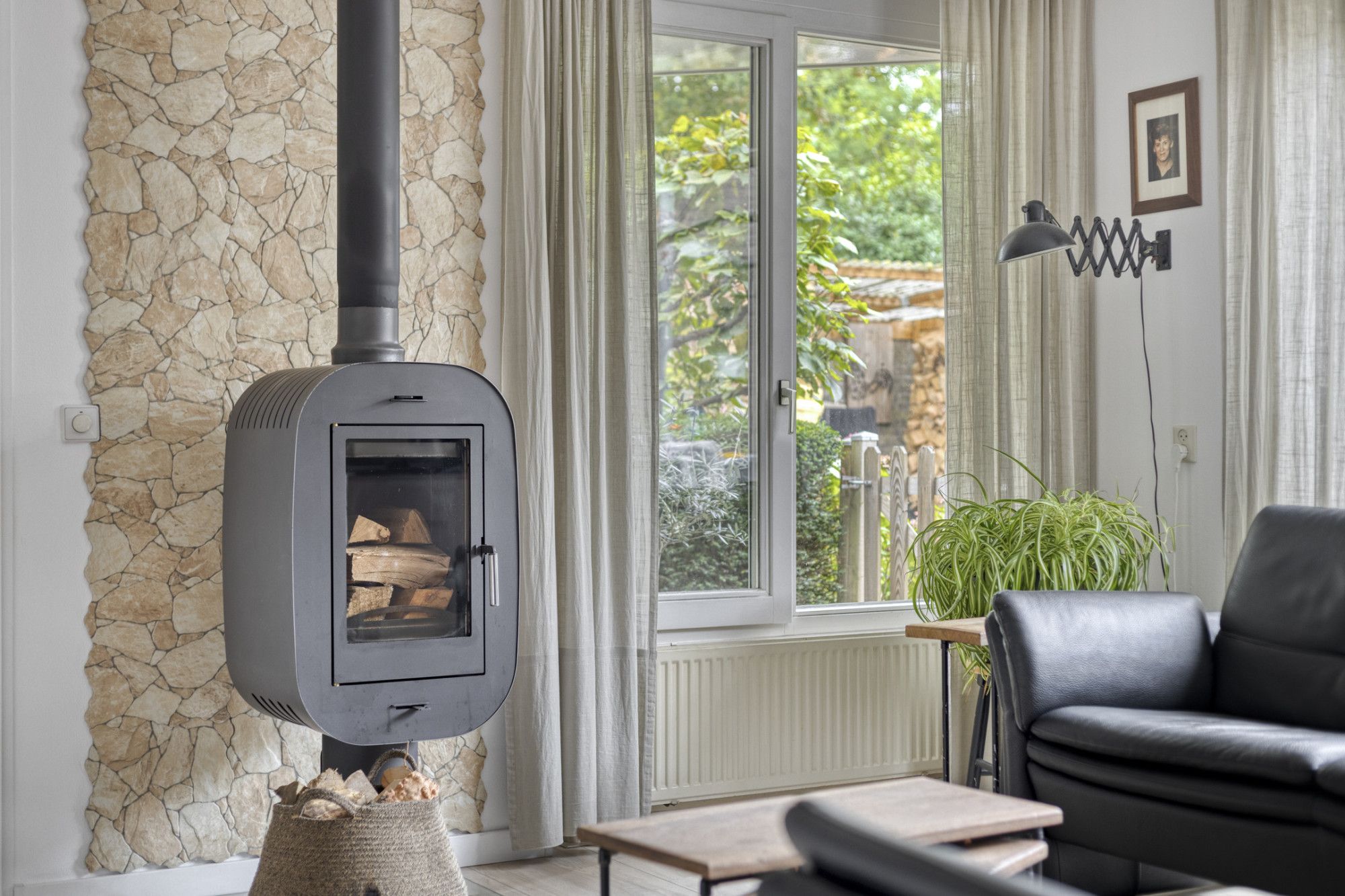 Middels oprit met houten buiten berging toegang tot de overdekte entree. Hal met doorlopende laminaat. Betegelde binnen berging (2.85 x 2.48 m) eveneens van buiten te bereiken met witgoed aansluiting. Lichte woonkamer (7.11 x 4.53 m) met open keuken eveneens voorzien van laminaat vloer en moderne houtkachel, witte keukeninstallatie in hoekopstelling met onderkasten en inbouwapparatuur te weten: flexzone inductie kookplaat, afzuigkap, vaatwasser en stoom-oven.