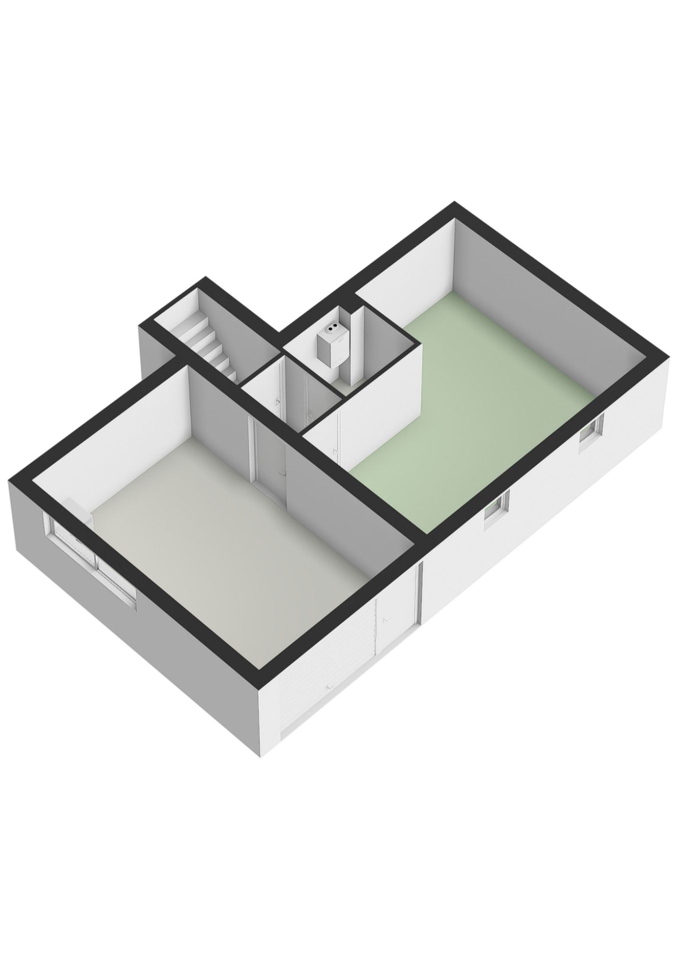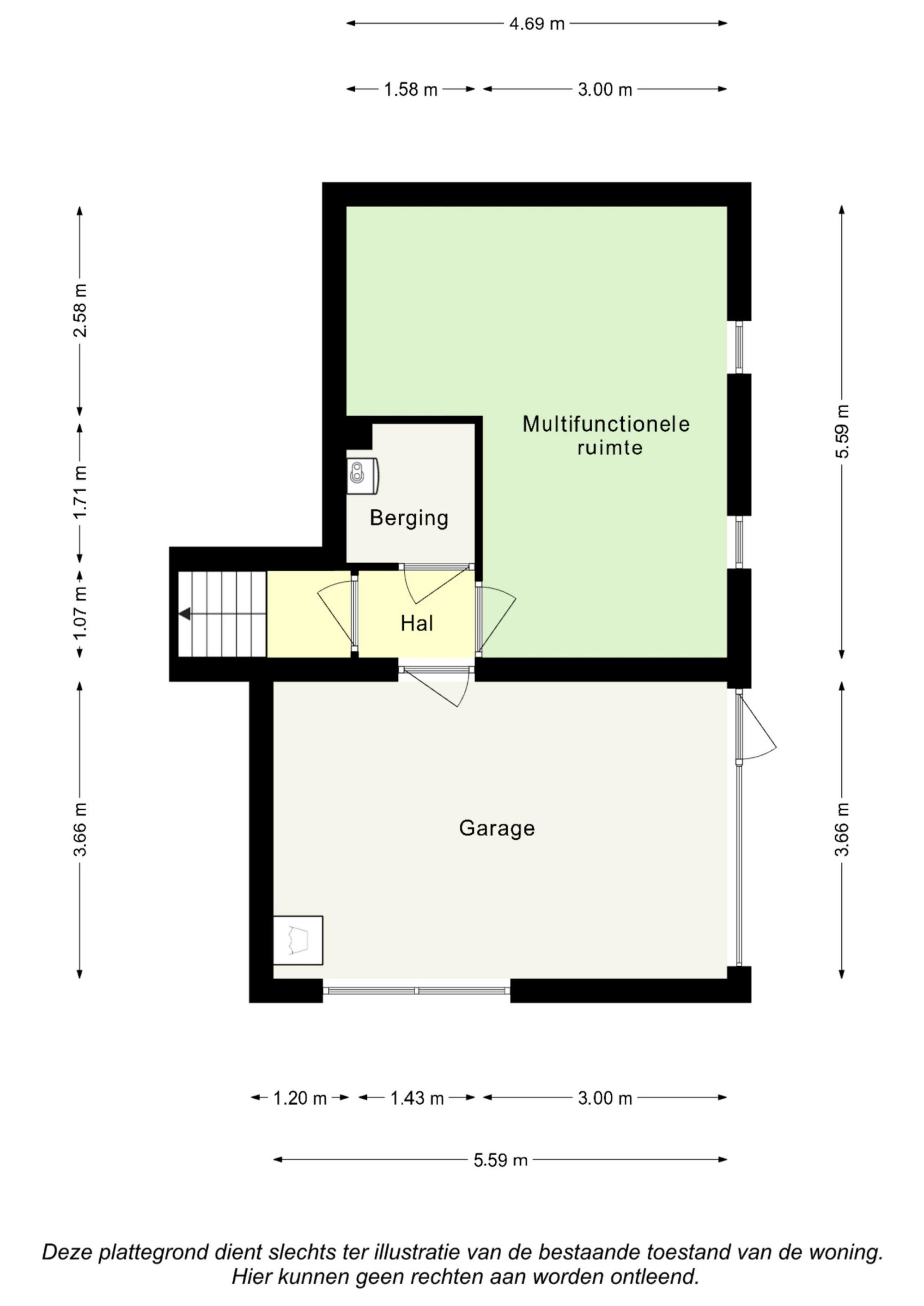 Middels trap te bereiken kelderruimte. De hal biedt toegang tot stookruimte (1,71m x 1,58 m), multifunctionele ruimte (5,59 m x 4,69 m/3,00 m) en ruime garage (5,59 m x 3,66 m).