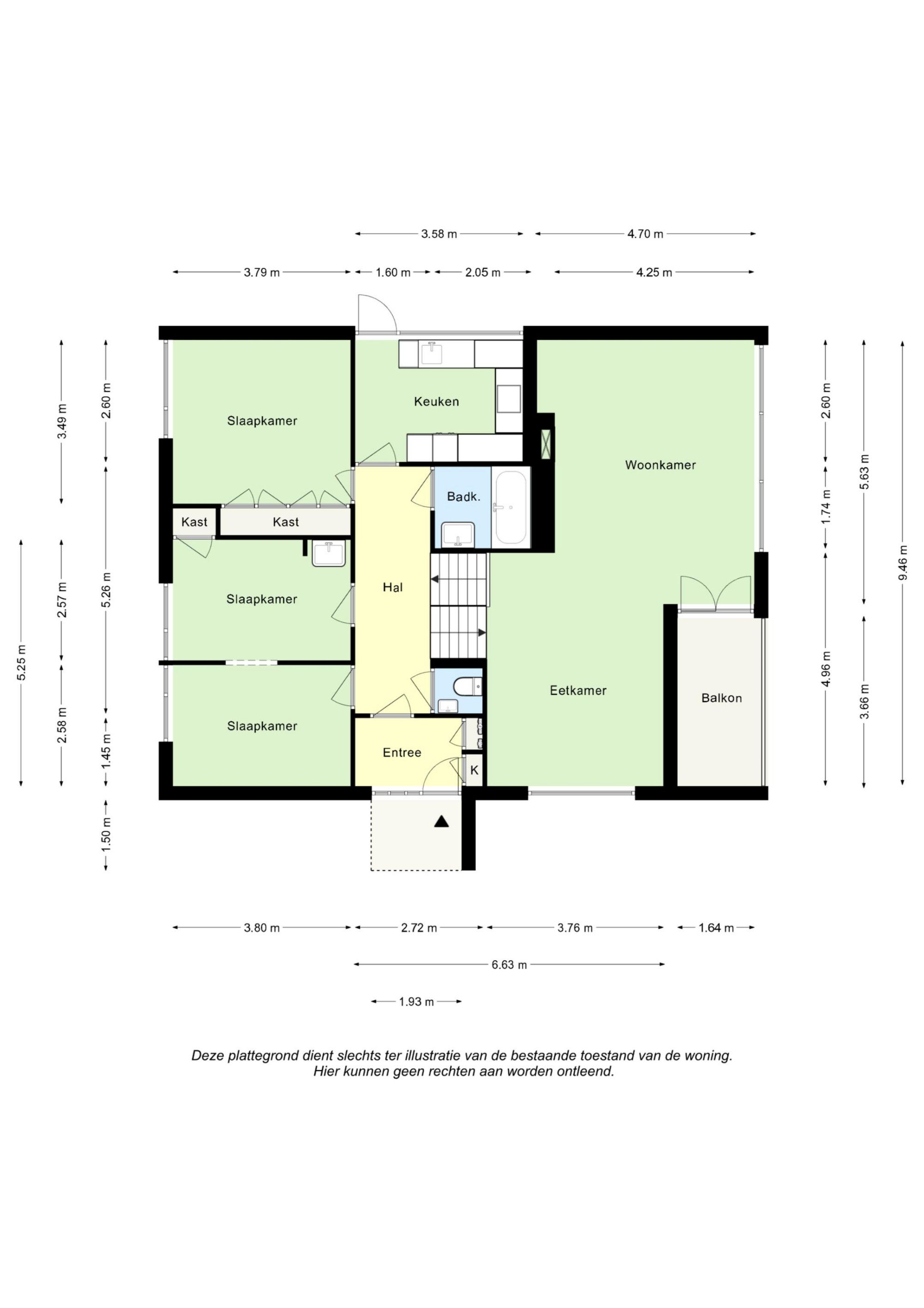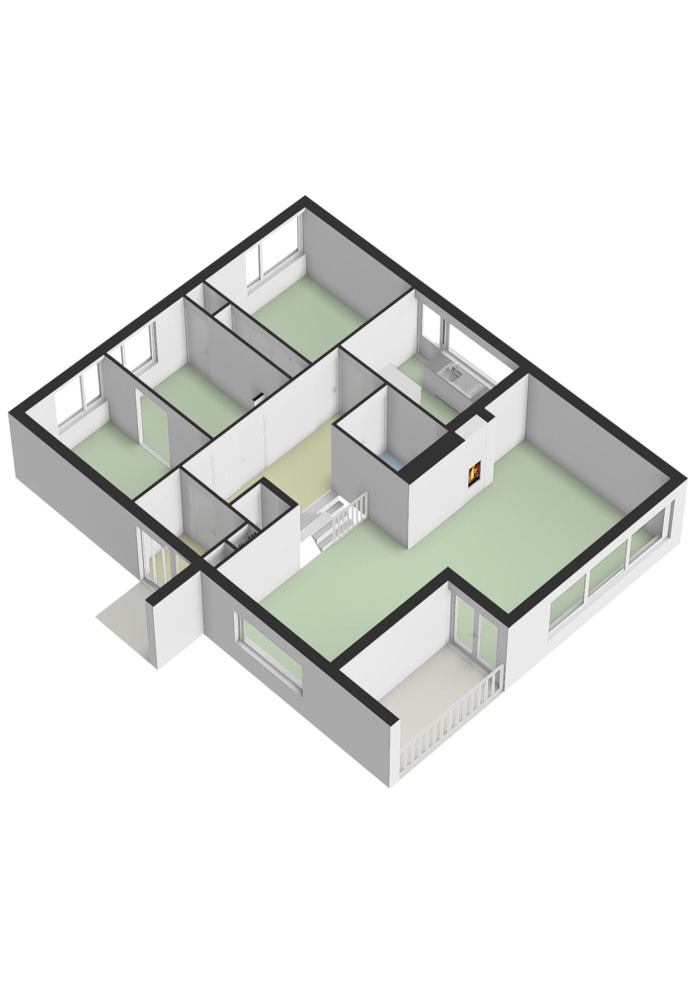 De entree/ hal biedt toegang tot 3 slaapkamers, badkamer en keuken. Middels een bescheiden trapopgang heeft men vanuit de hal toegang tot de living. De ruime living (ca. 37 m2) is v.v. een openhaard met schouw en balkon aan de voorzijde gelegen. De gesloten keuken (3,58 m x 2,60 m) v.v. installatie en apparatuur, waaronder een 4-pits gaskookplaat, afzuigkap, combi-oven en vaatwasser. De keuken biedt directe toegang tot de tuin.