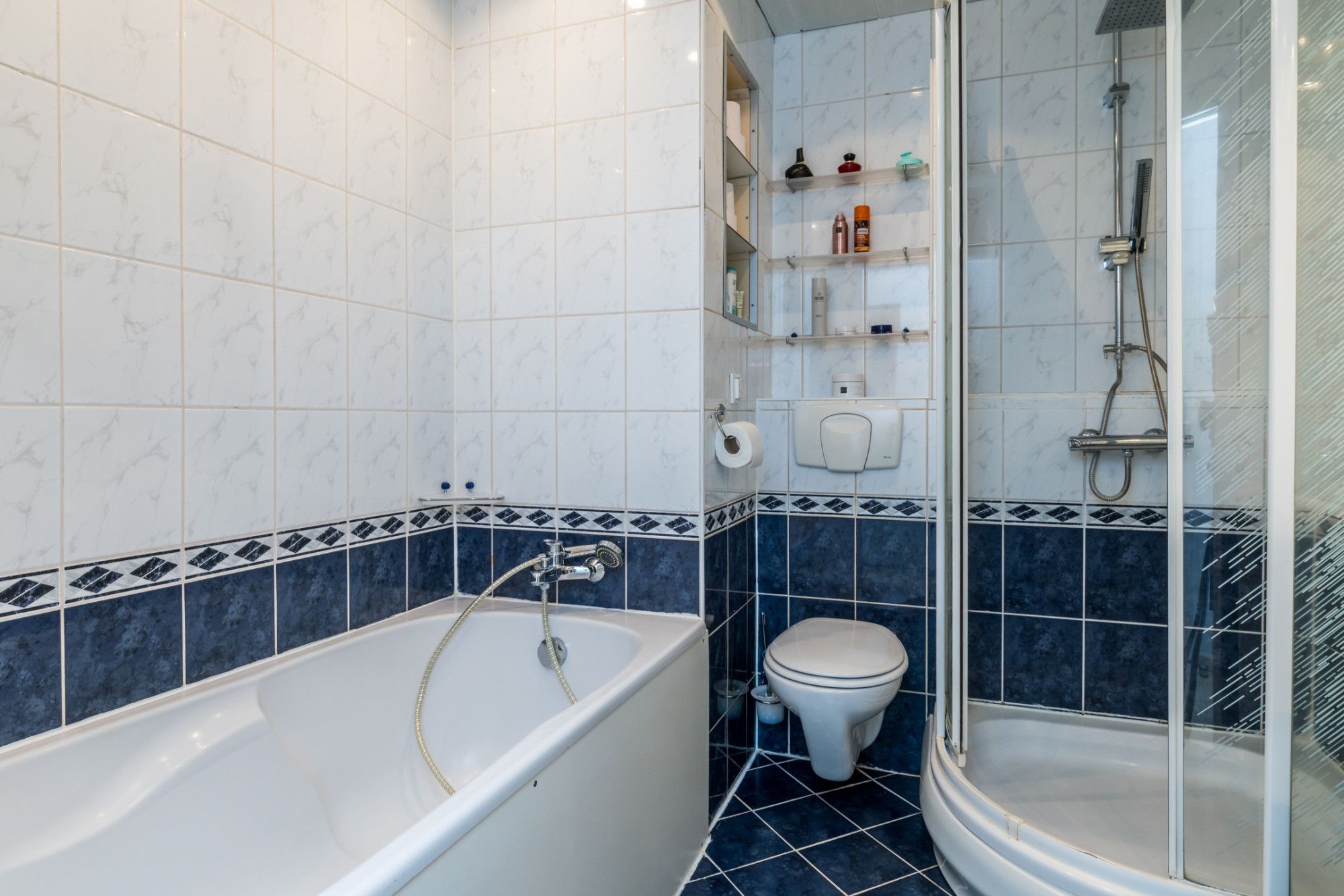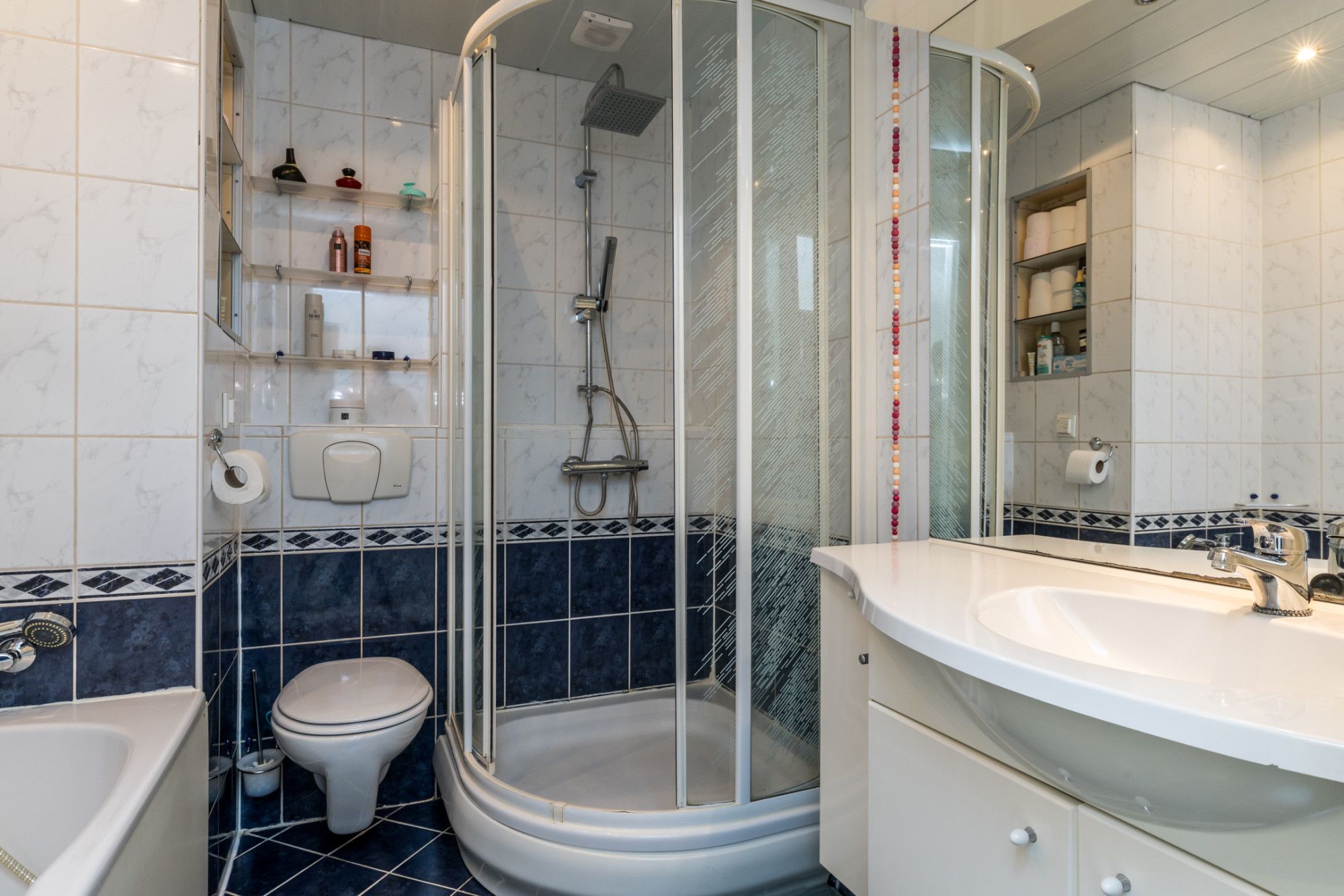 Geheel betegelde badkamer met vloerverwarming (2,15m x 2,35m) met douche, bad, wastafelmeubel met wastafel en 2e zwevend toilet.