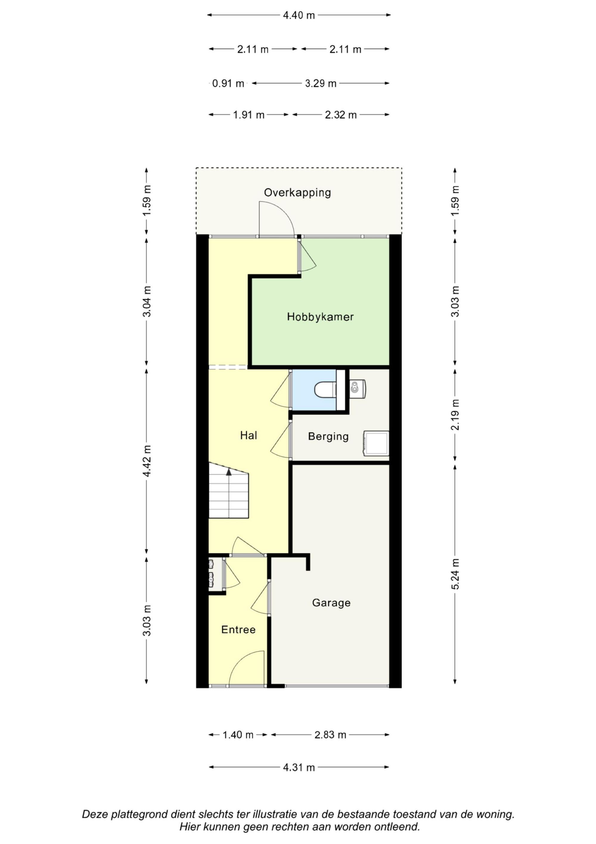 Middels oprit te bereiken entree. De entree biedt toegang tot inpandige garage (5,23 m x 2,87 m), meterkast en hal. Vanuit de hal heeft men toegang tot berging (alwaar aansluiting voor witgoed apparatuur en cv-ketel), toiletruimte en hobbykamer. De hobbykamer (3,29 m x 3,03 m) is voor diverse doeleinde geschikt, o.a. kantoor/ praktijk aan huis.