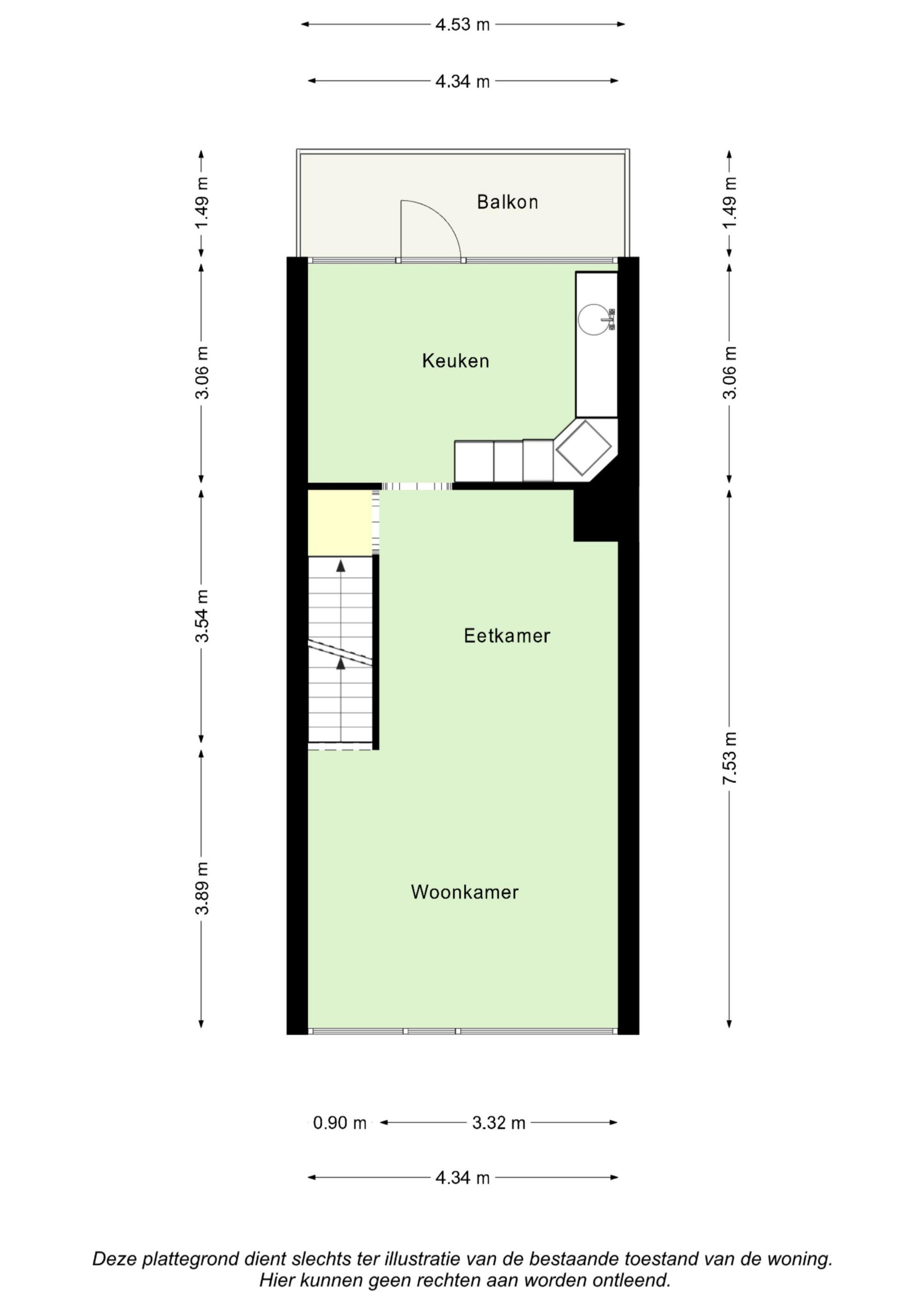Middels trap (vanuit hal) te bereiken woon/eetkamer (7,53m x 4,34m) met veel daglichttoetreding, een parketvloer en open trap naar 2e verdieping. Vanuit de woonkamer heeft men toegang tot de keuken (3,06m x 4,34m) met installatie en inbouwapparatuur t.w.: 4-pits gaskookplaat, vaatwasser, oven en koelkast.