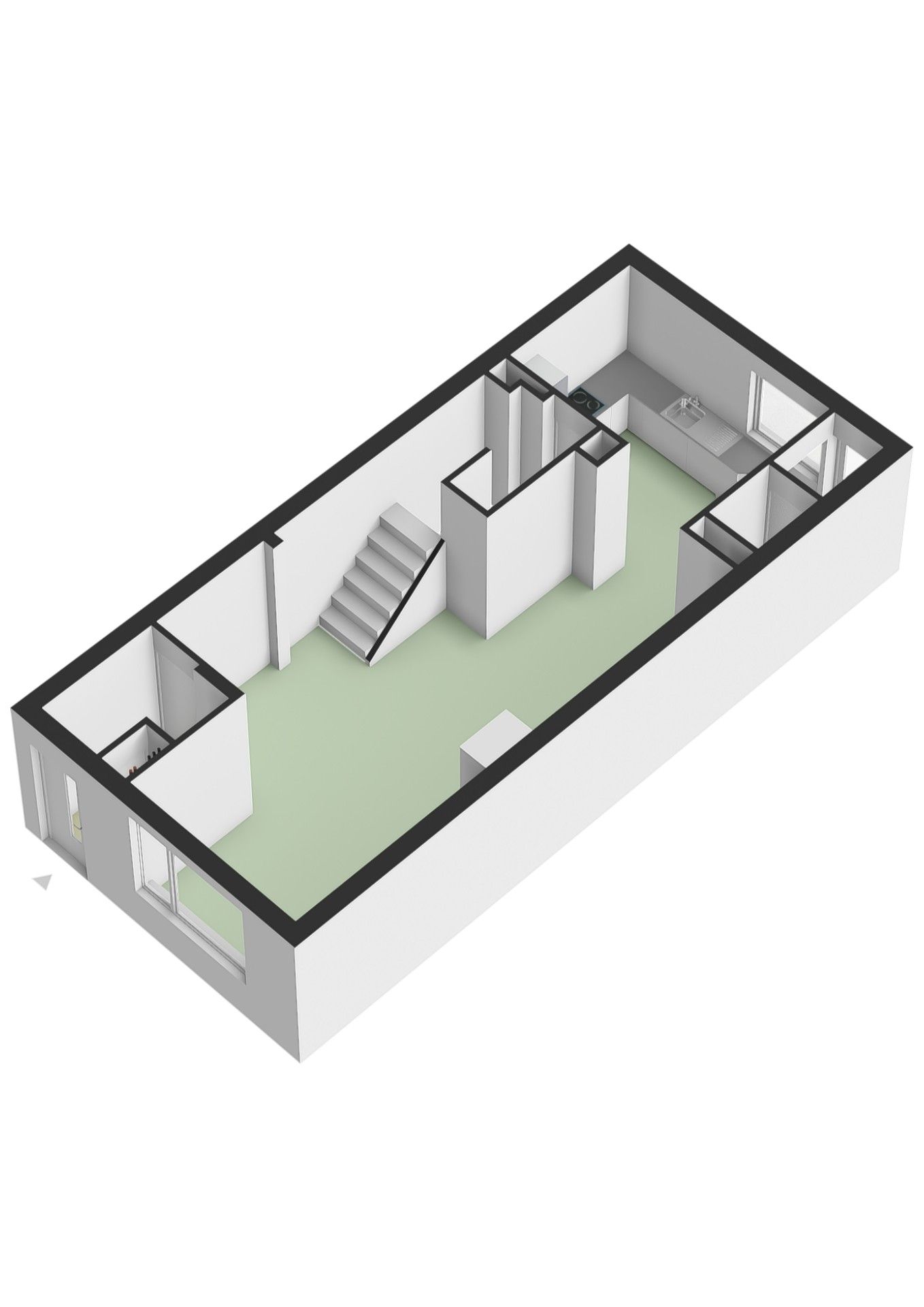 De entree/ hal is v.v. natuurstenenvloer en biedt tot living. De ruime living (ca. 32 m2) is v.v. een parketvloer en heeft een open verbinding naar de keuken en trap 1e verdieping. Aan de achterzijde gelegen eetkeuken (3,93 m x 2,43 m) beschikt over een houten keukenblok, 4-pits keramische kookplaat, oven en vaatwasser. De keuken biedt toegang tot kelderruimte en tussenhalletje met toegang tot buiten en toiletruimte.