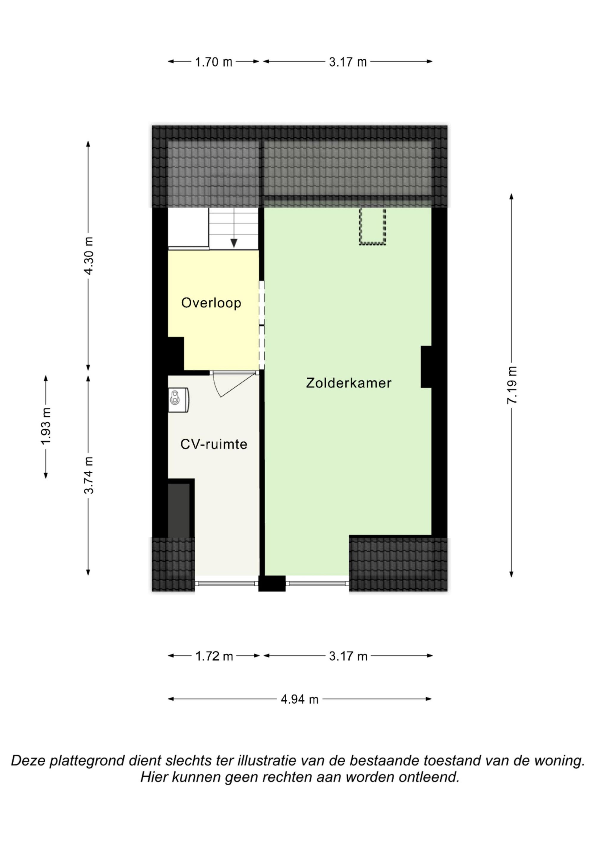 Ruime overloop biedt toegang tot 3e slaapkamer (7,19 m x 3,17 m) met de mogelijkheid tot het realiseren van een 4e slaapkamer. Tevens heeft men toegang tot de cv-ruimte.