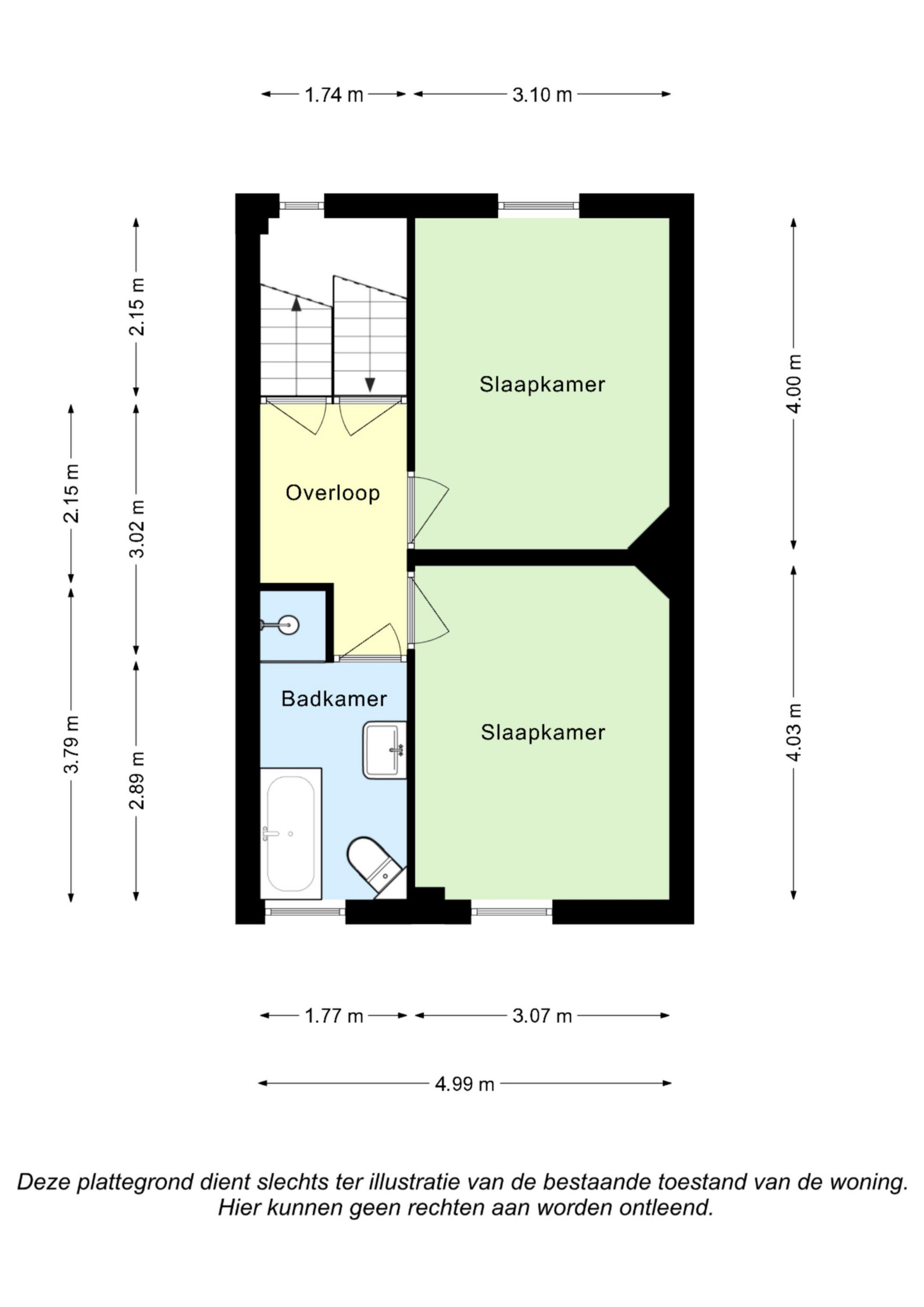Overloop met toegang tot 2 slaapkamers en badkamer. Slaapkamer I (4,03 m x 3,07 m) is aan de voorzijde gelegen, slaapkamer II (4,00 m x 3,10 m) is aan de achterzijde gelegen. De ruime badkamer (2,89 m x 1,77 m) is v.v. een ligbad, 2e toilet, douche en vaste wastafel incl. badmeubel.