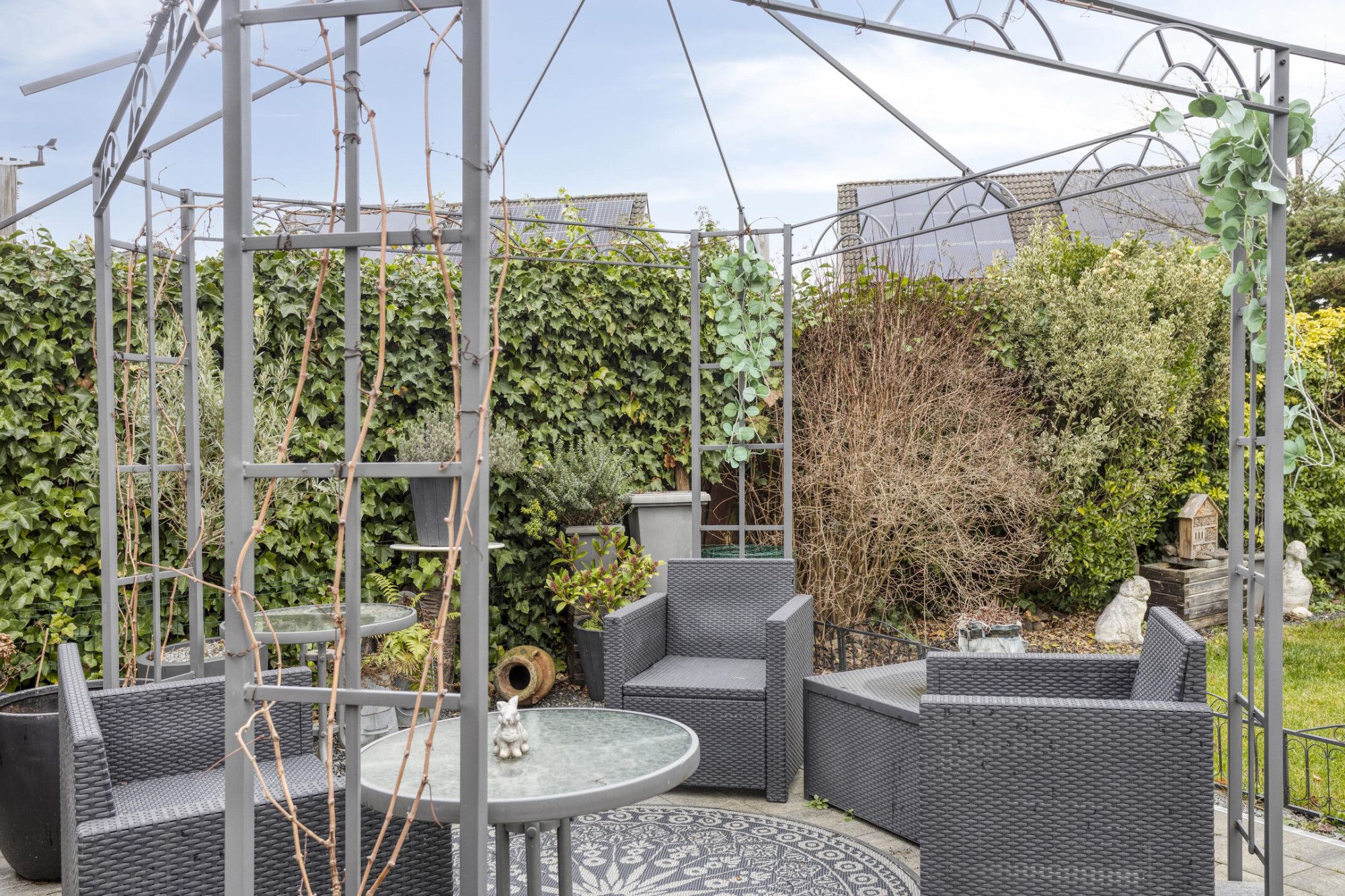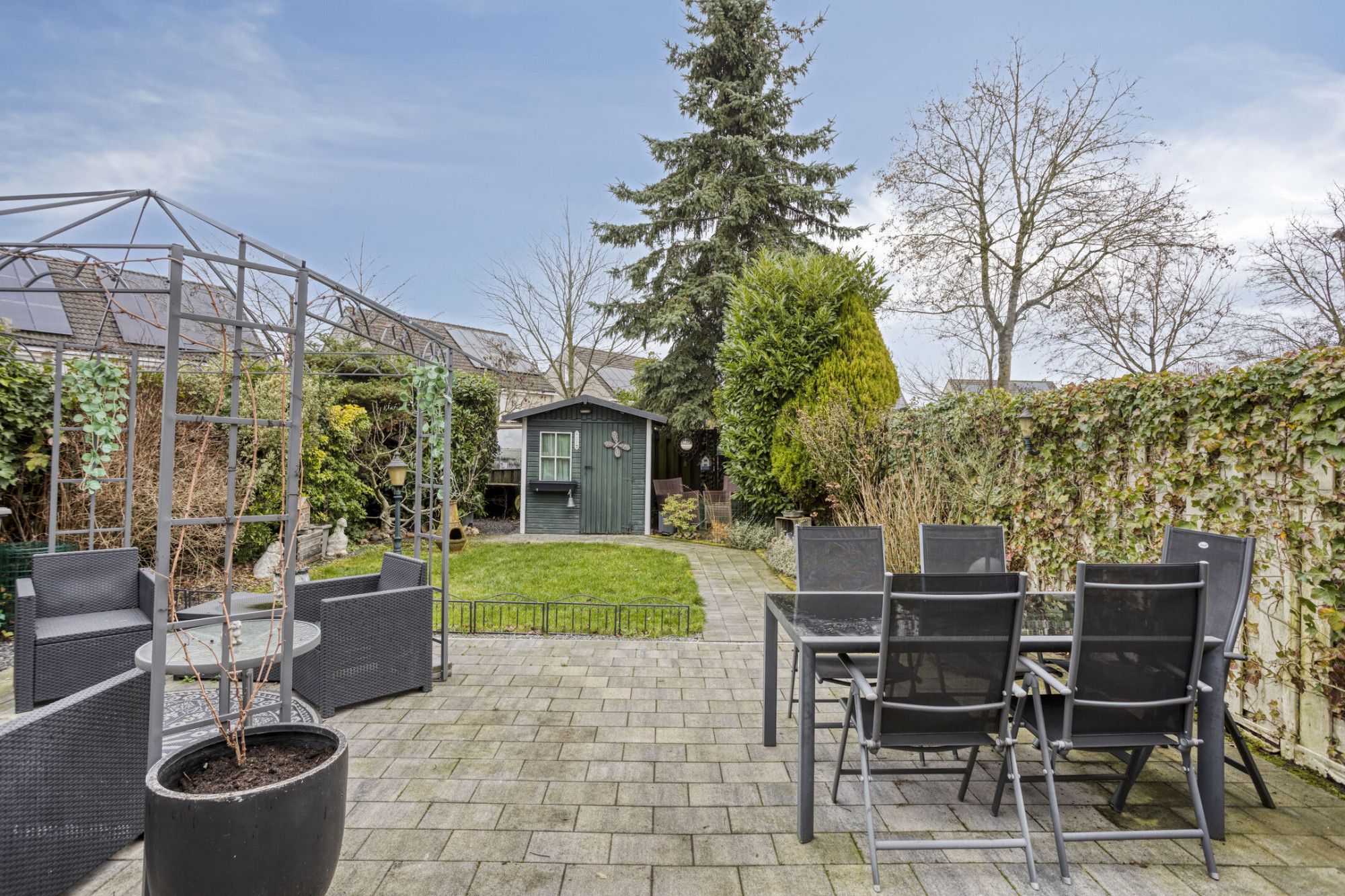 Riante achtertuin met terras, gazon, aanplanting, houten tuinhuis en goede privacy.