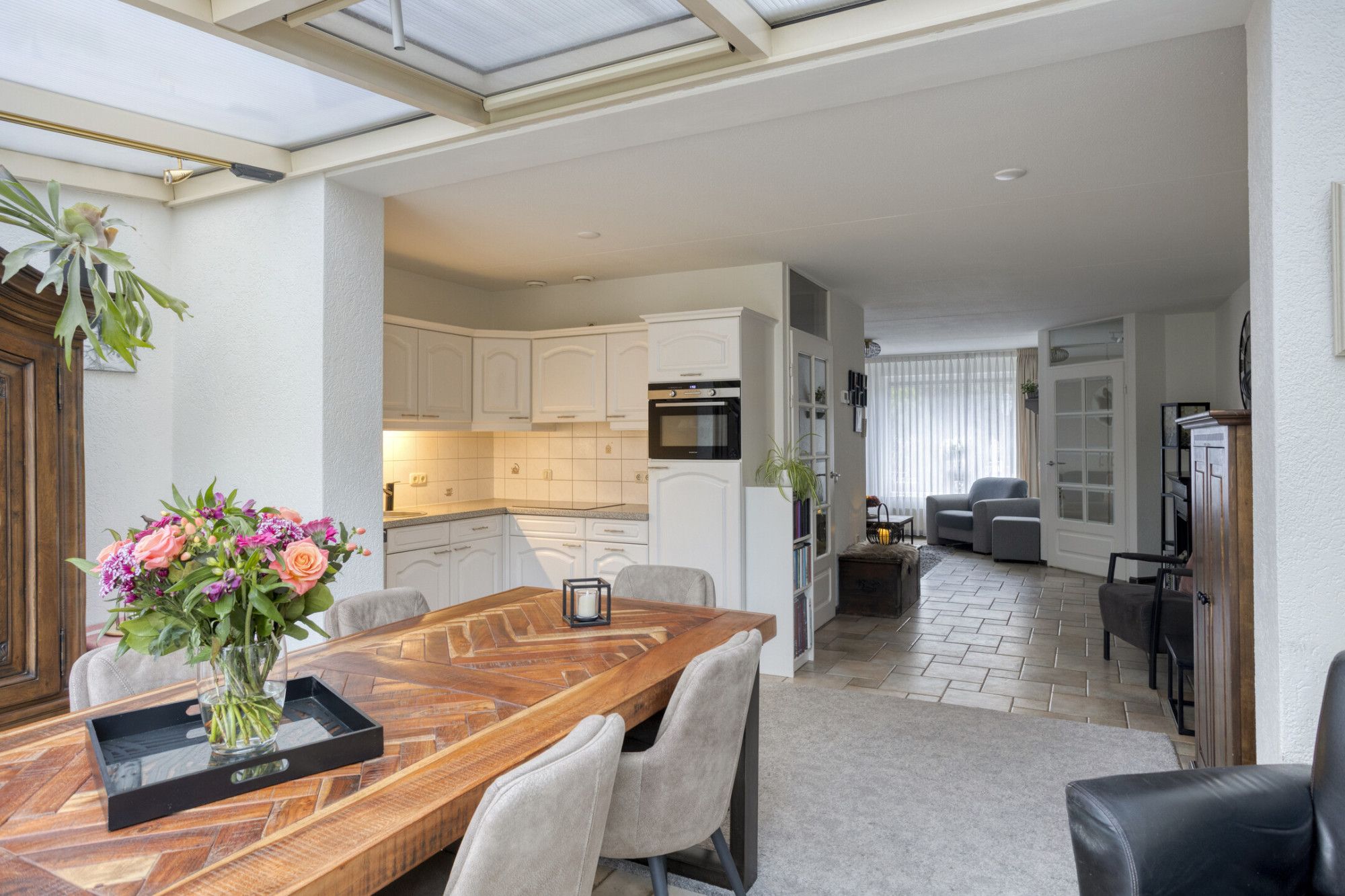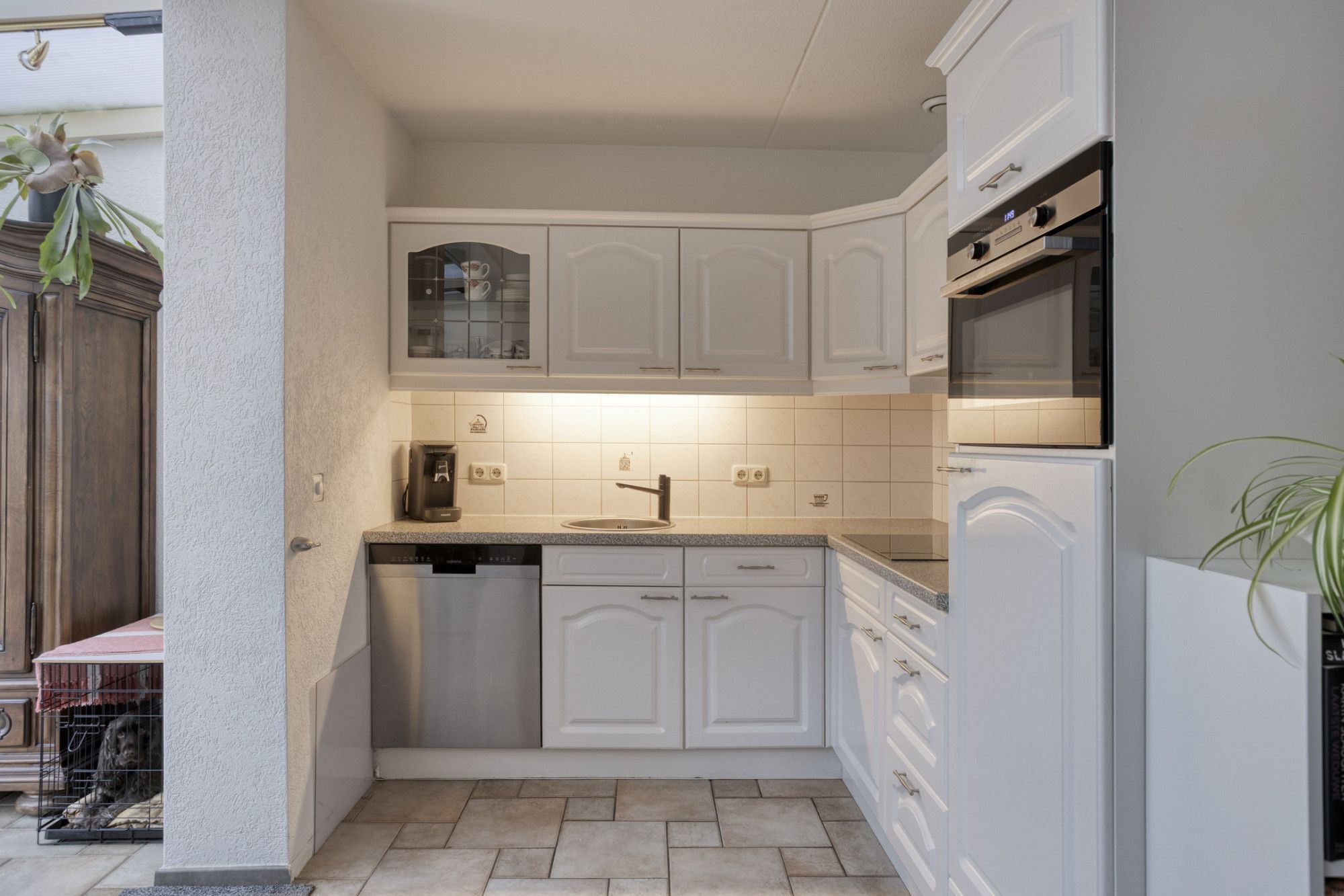 Via de woonkamer bereikbare tussenhal met trap naar verdieping en betegelde toiletruimte met duo-closet en fonteintje. Half open keuken (5.32 x 5.08 m) met keurige keukeninrichting met apparatuur te weten: ceramische kookplaat, afzuigkap, combi oven, koelkast en vaatwasser.