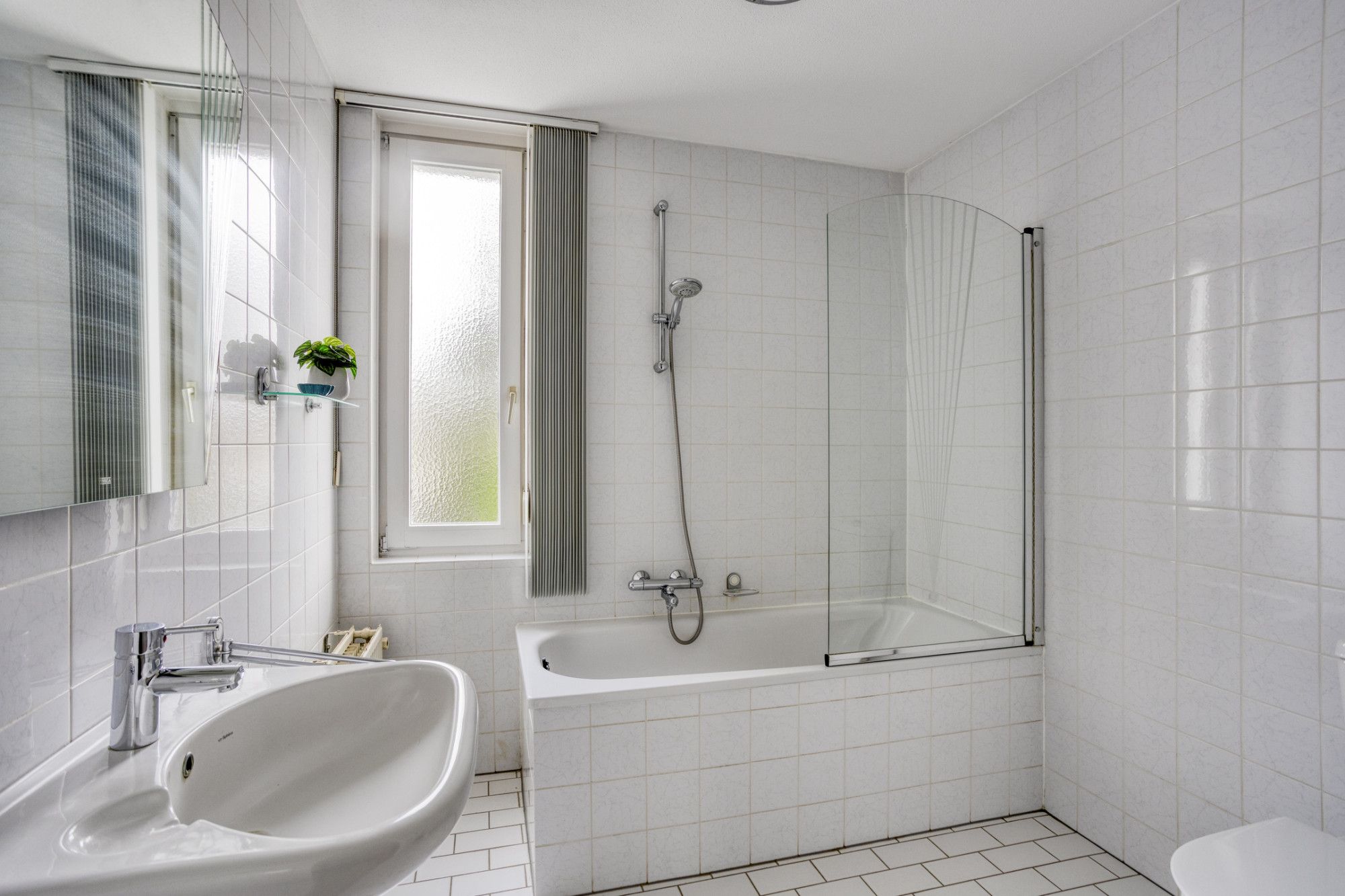 Geheel betegelde badkamer (2.33 x 2.21 m) met ligbad, vaste wastafel en duo closet toilet.