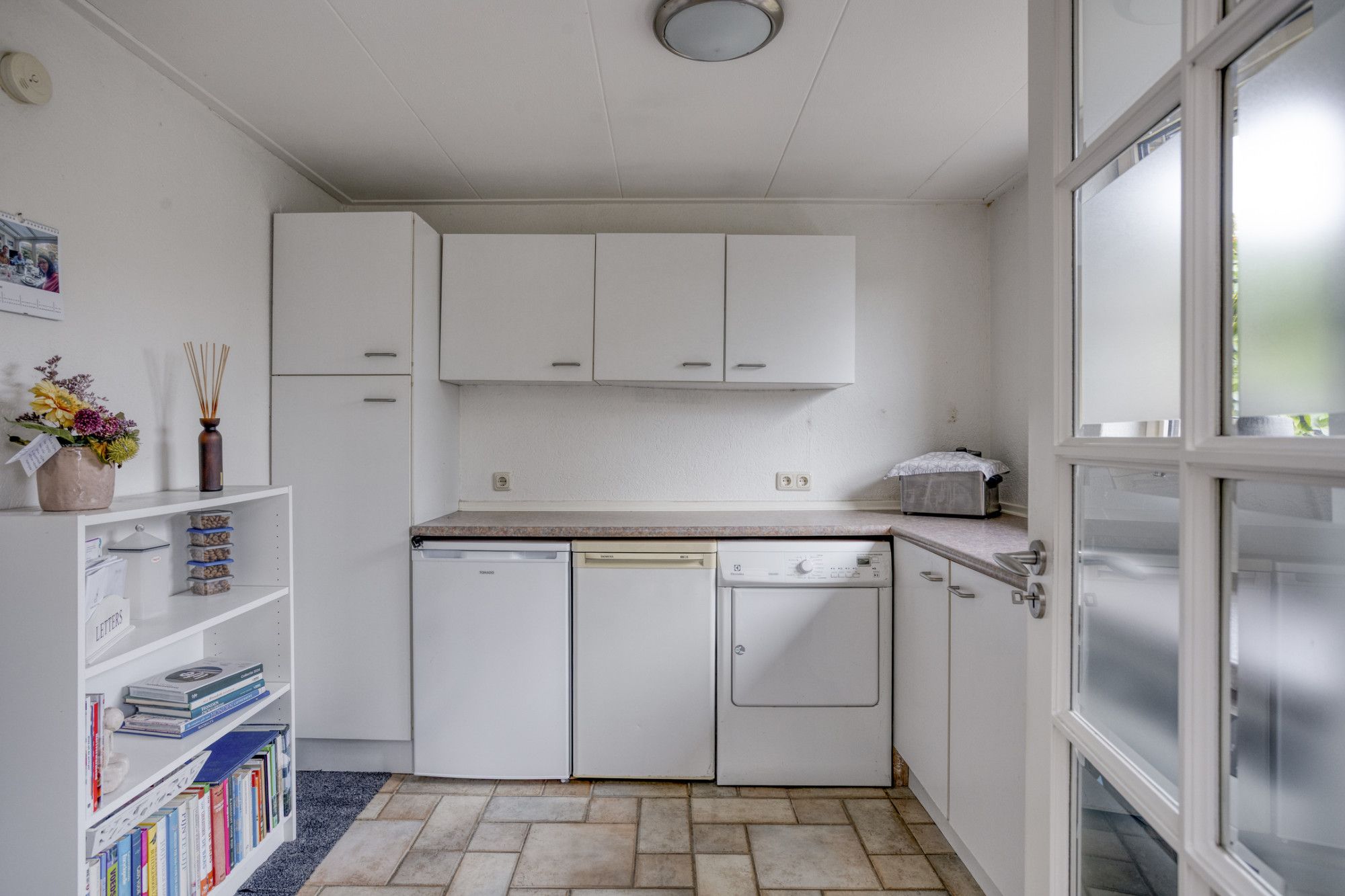 Bijkeuken (2.79 x 2.78 m) voorzien van tegelvloer en met aanrechtblad met water aansluiting en de witgoedopstelling.