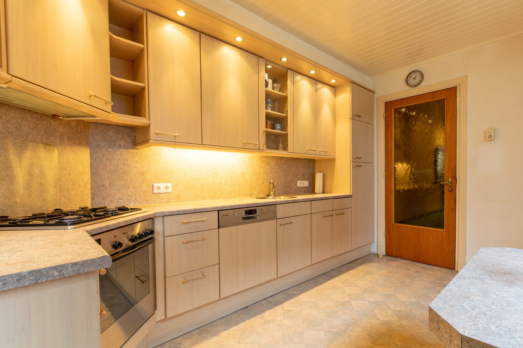 Hal met verdiepingstrap, meterkast en garderobekast. Doorloop naar de keukenruimte voorzien van een keukeninstallatie met diverse inbouwapparatuur. In de keuken is er ook de aansluiting voor de wasautomaat. Vanuit keuken toegang naar, toiletruimte en bijkeuken met cv installatie (Nefit, eigendom) en deur naar de achtertuin. Aan de voorzijde van de woning bevindt zich de woonkamer.