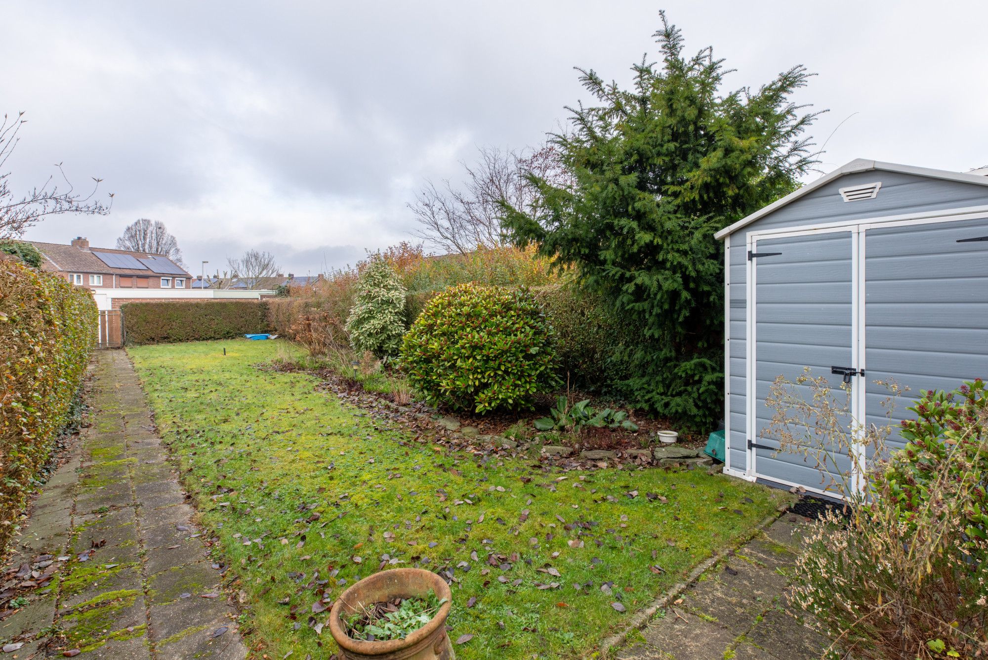 De diepe achtertuin beschikt over een terras, looppad naar achteren, gazon, tuinhuisje. Aan de achterzijde is een garage gelegen voorzien van een kantelpoort en een nieuwe loopdeur.