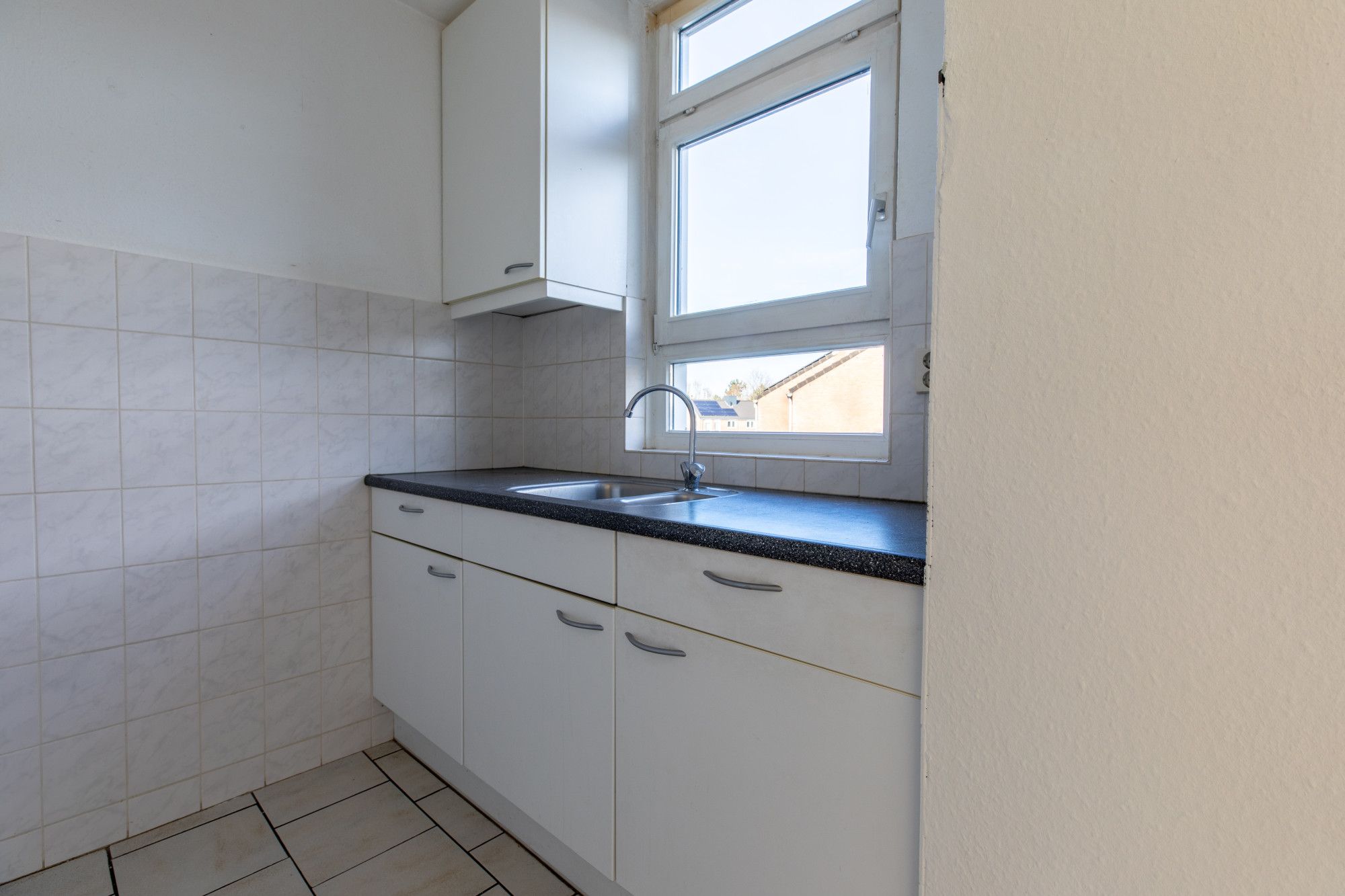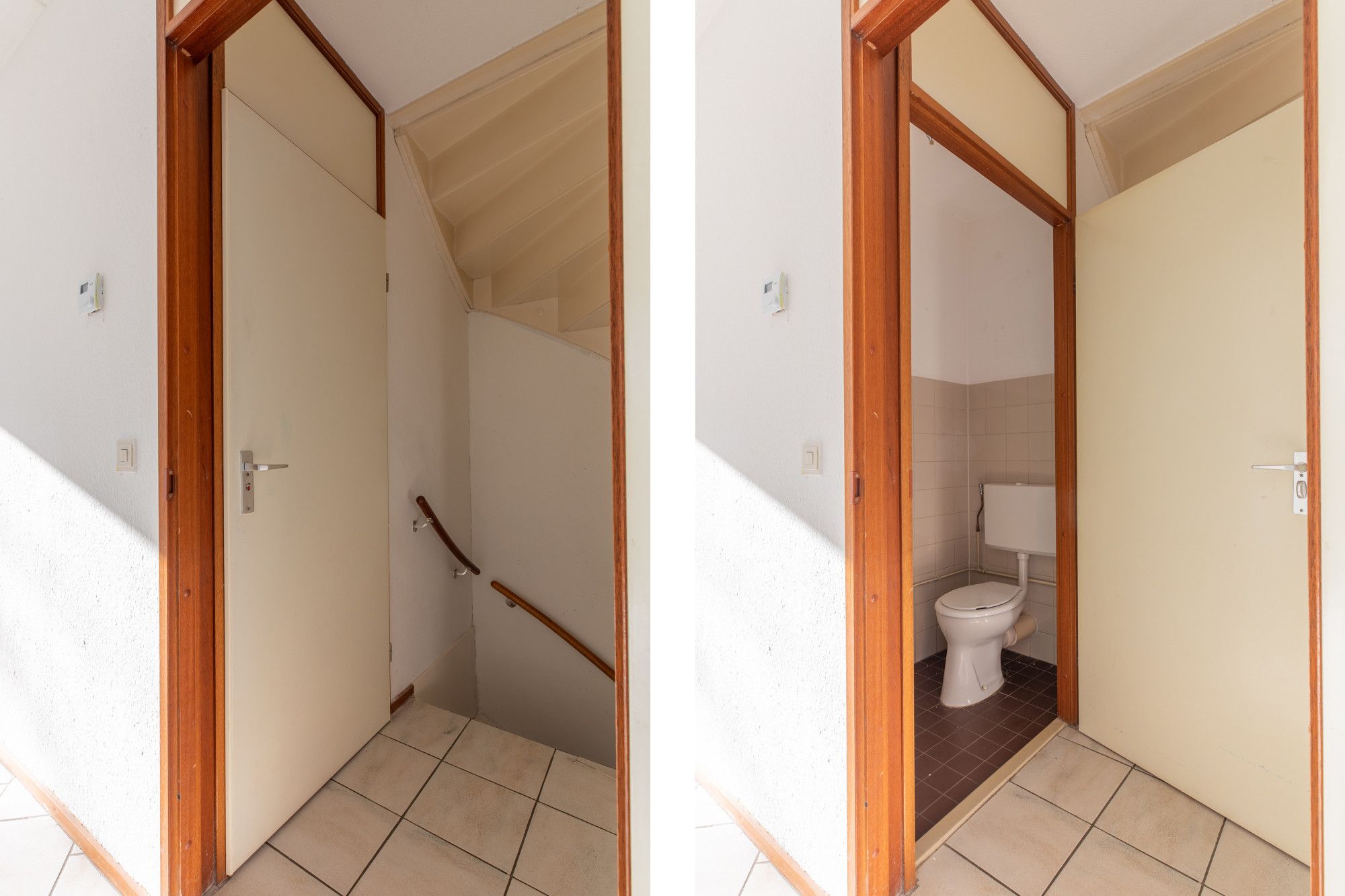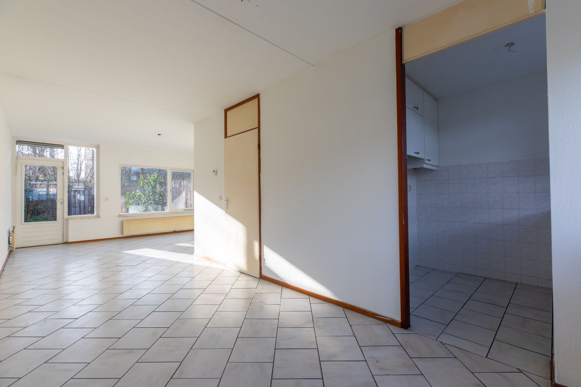 Overloop met toegang toiletruimte. Woonkamer met toegang naar de achtertuin, die op het zuiden is gelegen. Aan de voorzijde bevindt zich de keukeninstallatie.