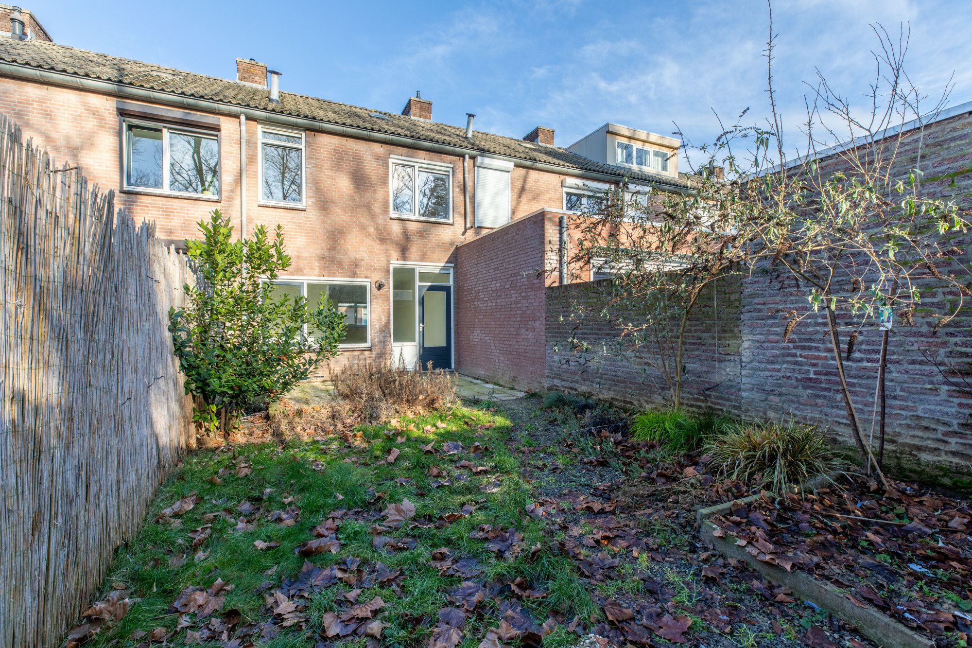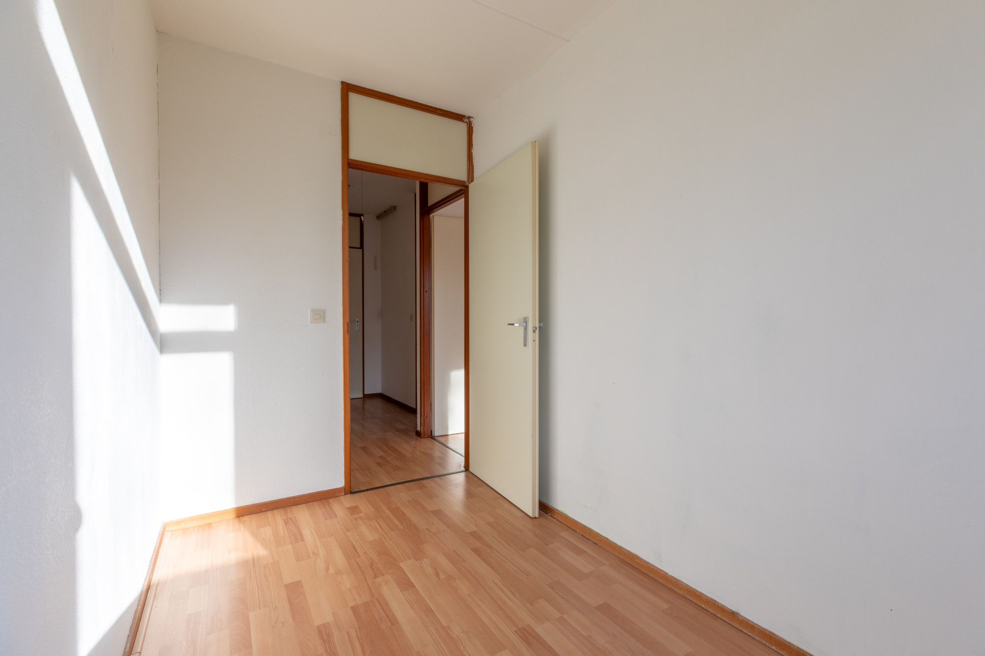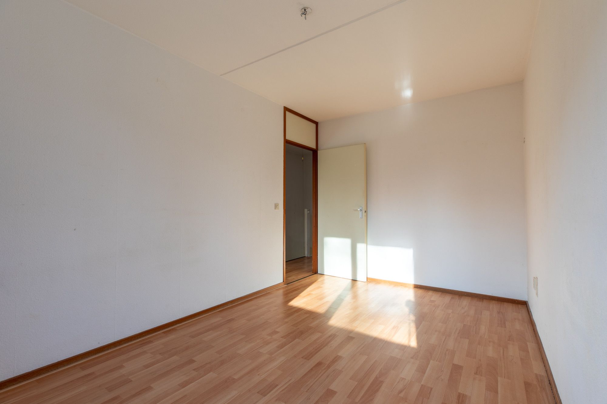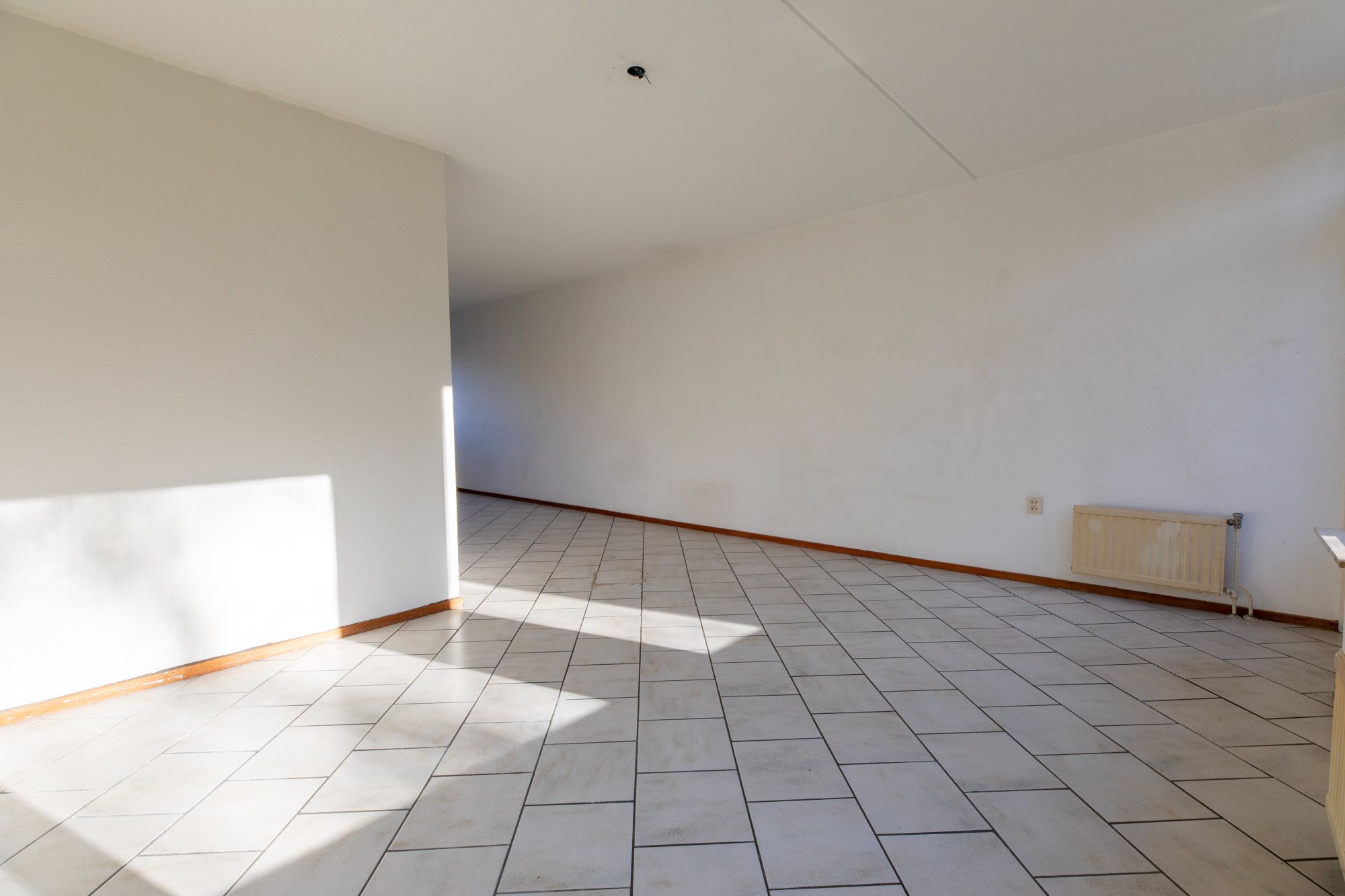 Overloop met toegang toiletruimte. Woonkamer met toegang naar de achtertuin, die op het zuiden is gelegen. Aan de voorzijde bevindt zich de keukeninstallatie.