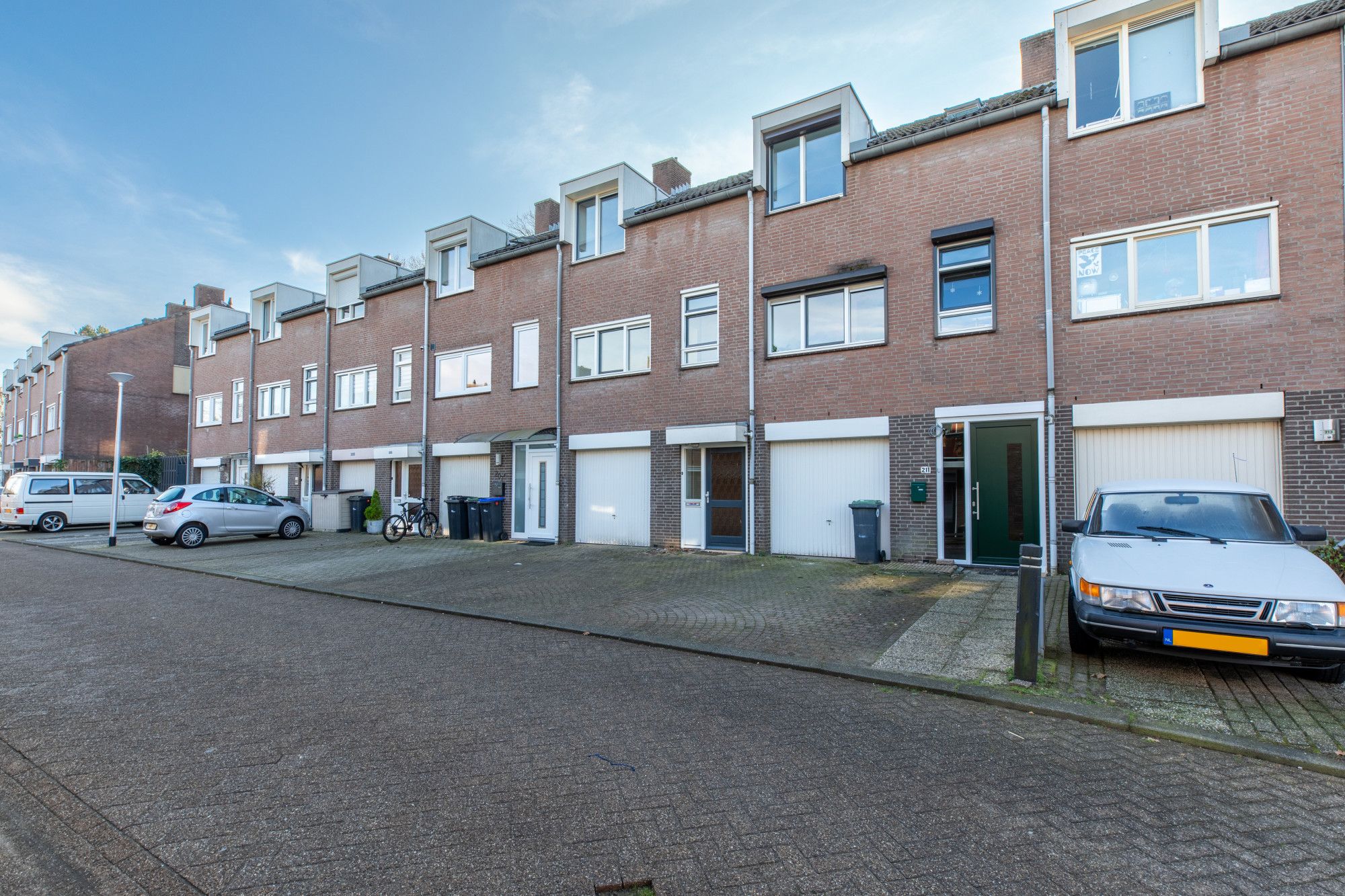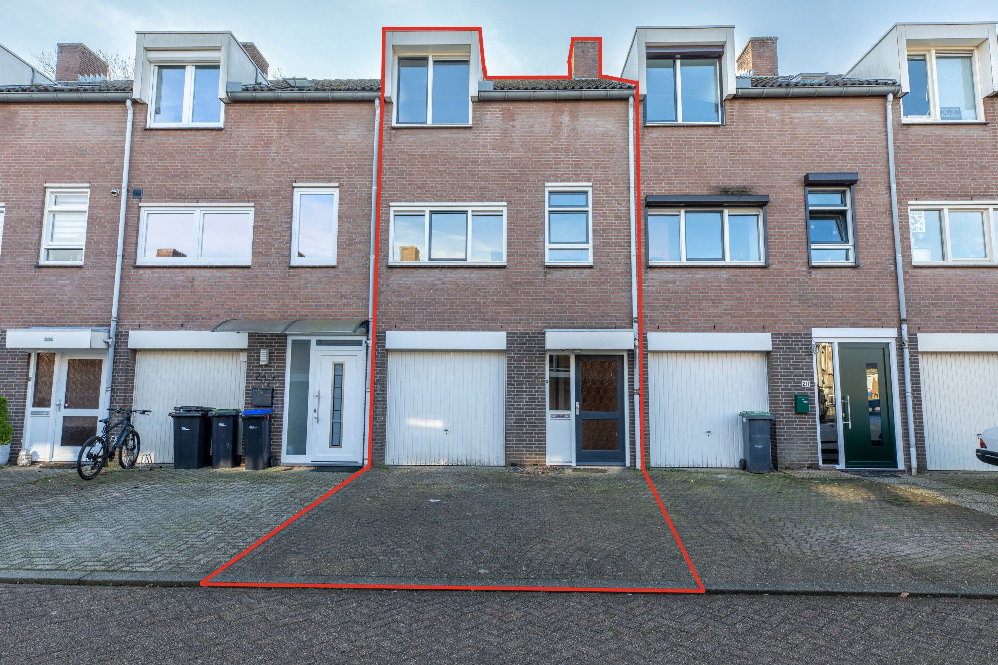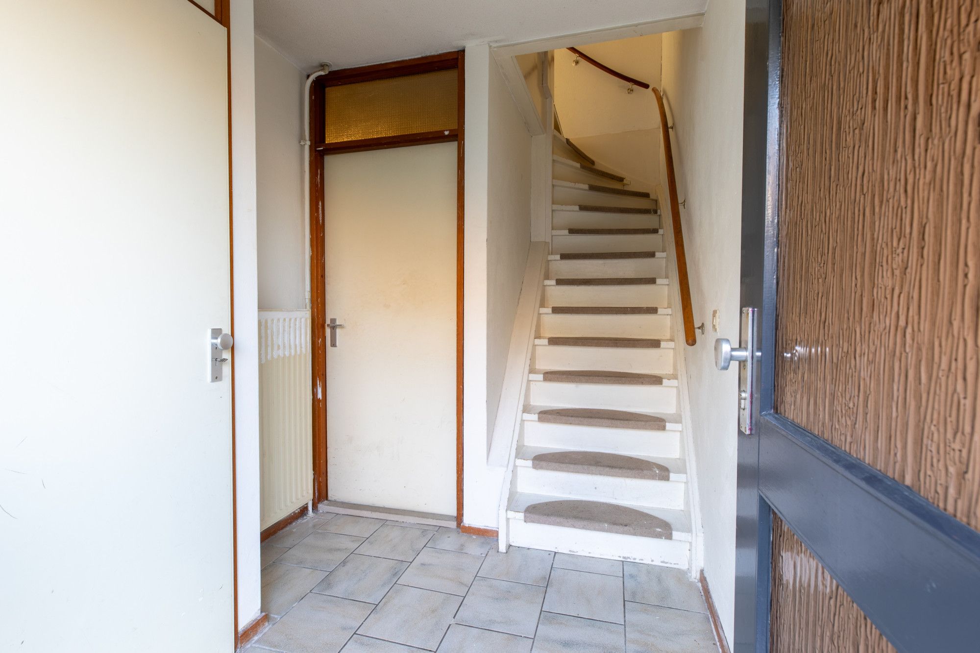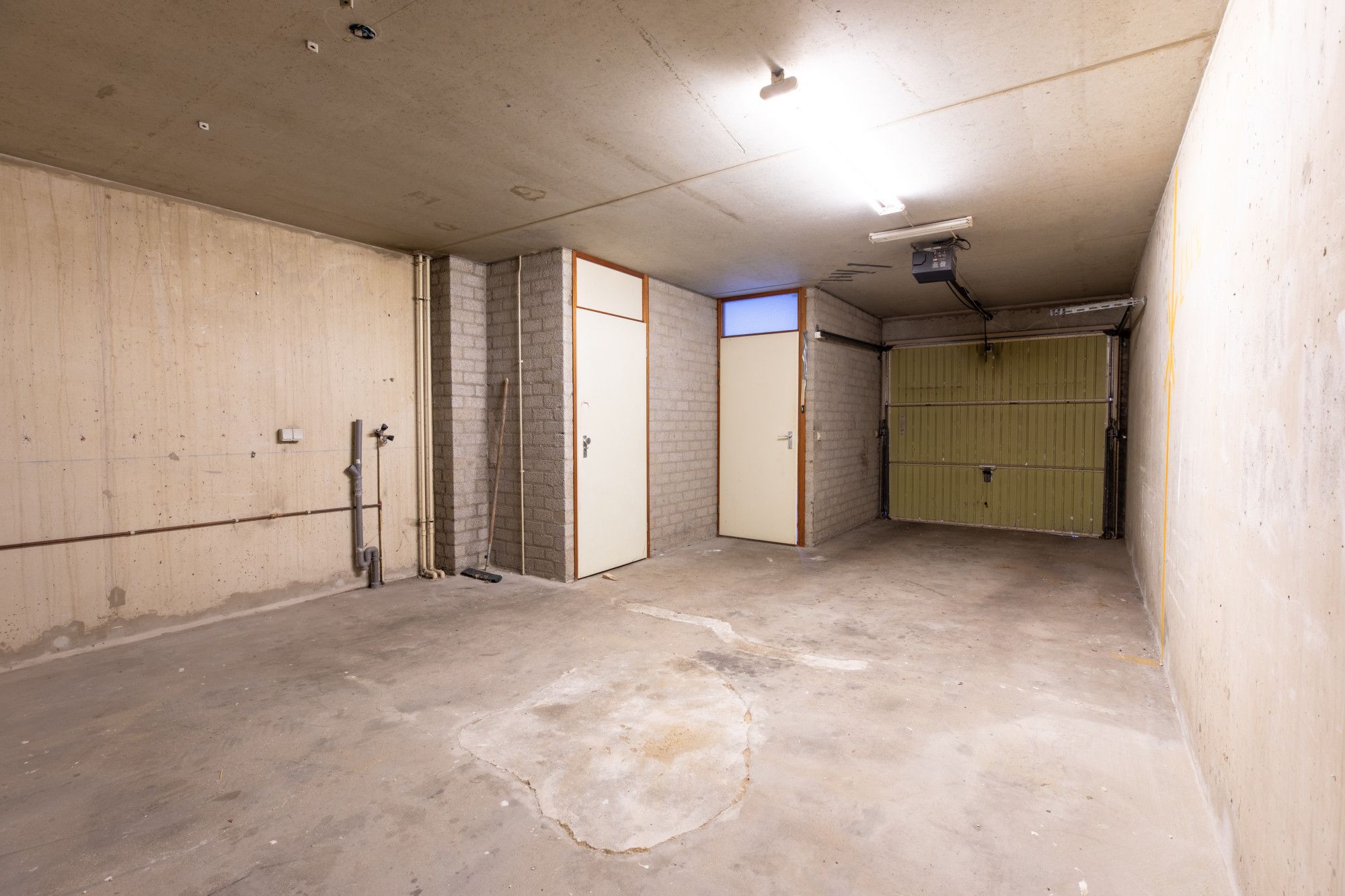 Oprit met toegang naar ruime garage. Hal met meterkast en verdiepingstrap. Inpandig is vanuit de hal ook de garage te bereiken.