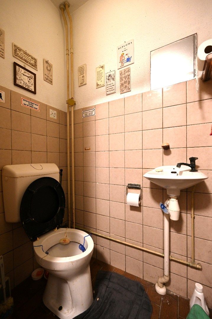 Middels de trapopgang is de overloop van de eerste etage te bereiken. Deze overloop (2.08m x 2.08m) biedt toegang tot de toiletruimte en de woonkamer. De half betegelde toiletruimte (1.30m x 0.86m) is voorzien van een closet en fonteintje. De L-vormige woonkamer (34m2), die afgewerkt is met een linoleumvloer, beschikt over een balkon en biedt vervolgens toegang tot de keuken (2.70m x 2.18m). De keukenruimte is ingedeeld met losstaande keukenapparatuur.
