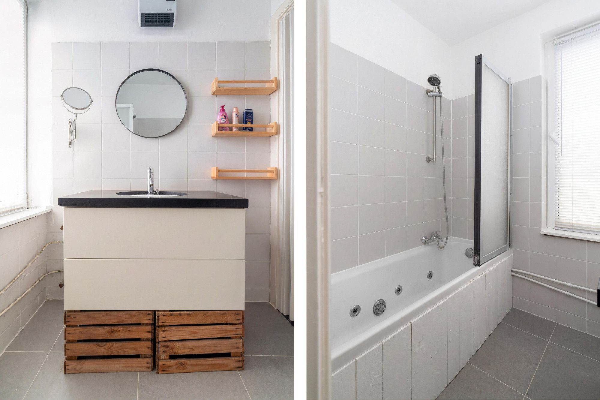 Volledig betegelde gedateerde badkamer (1.95mx1.60m) voorzien van ligbad, vaste wastafel.